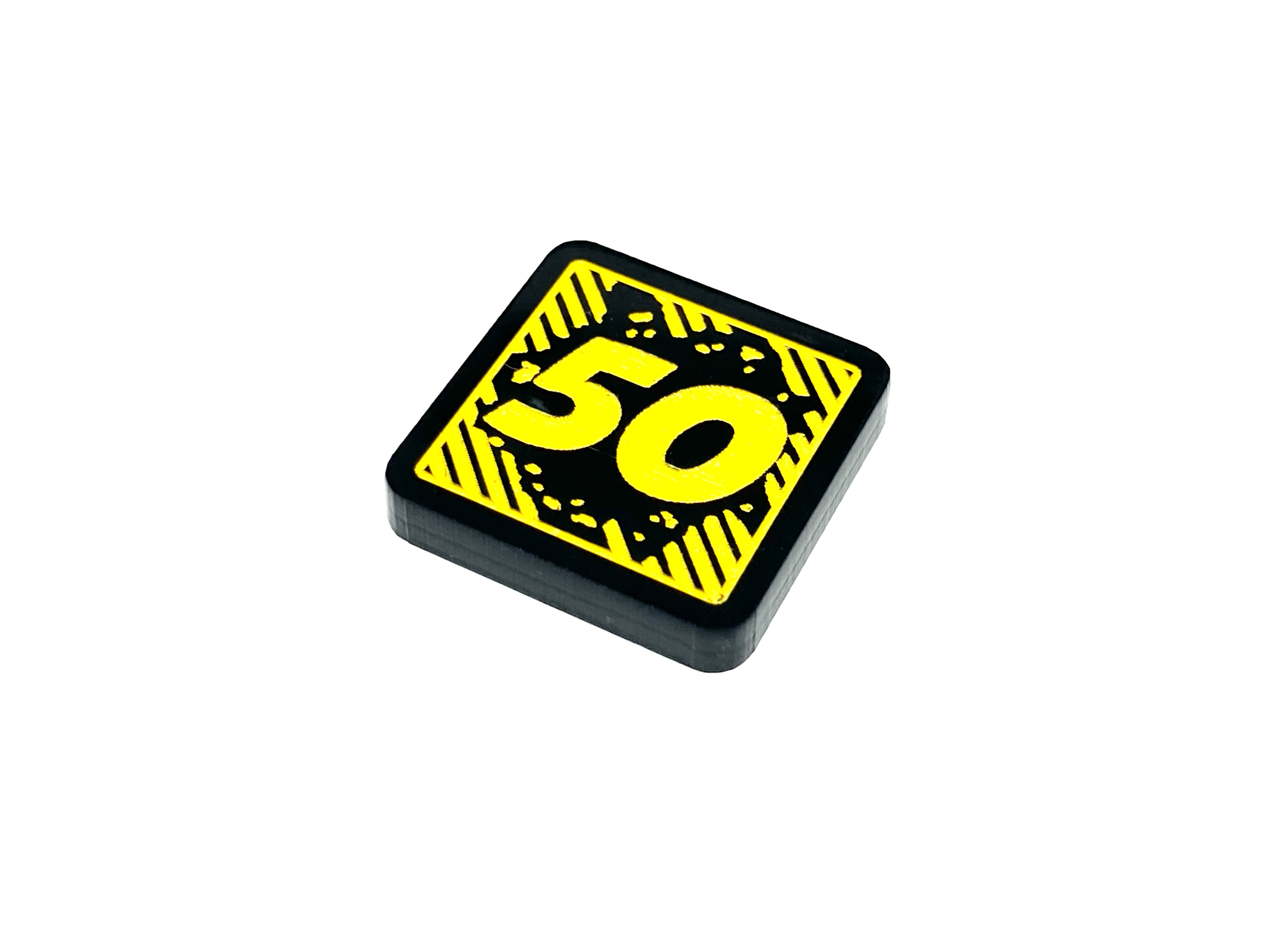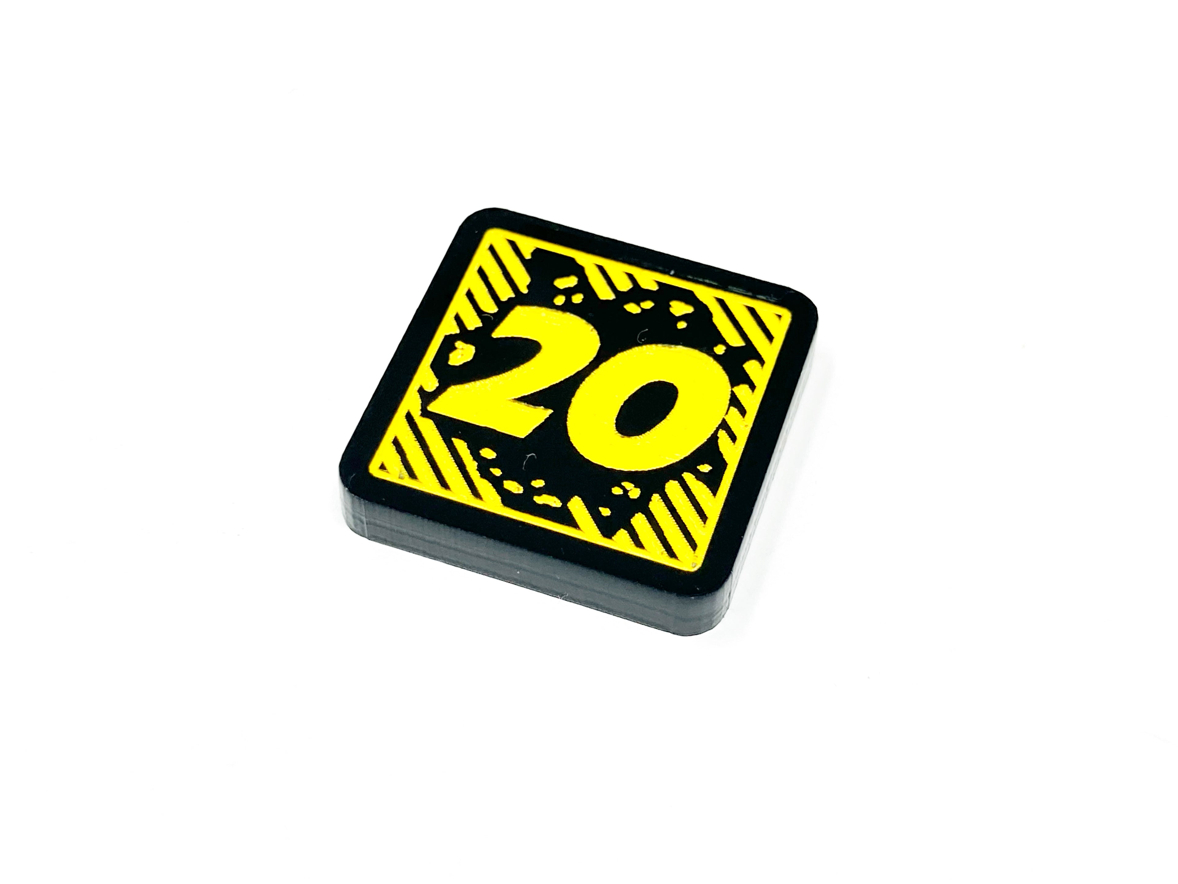 - 1 x Threat Token 20/50, etched and cut from opaque black acrylic and painted yellow on both sides, measuring 18mm x 18mm
