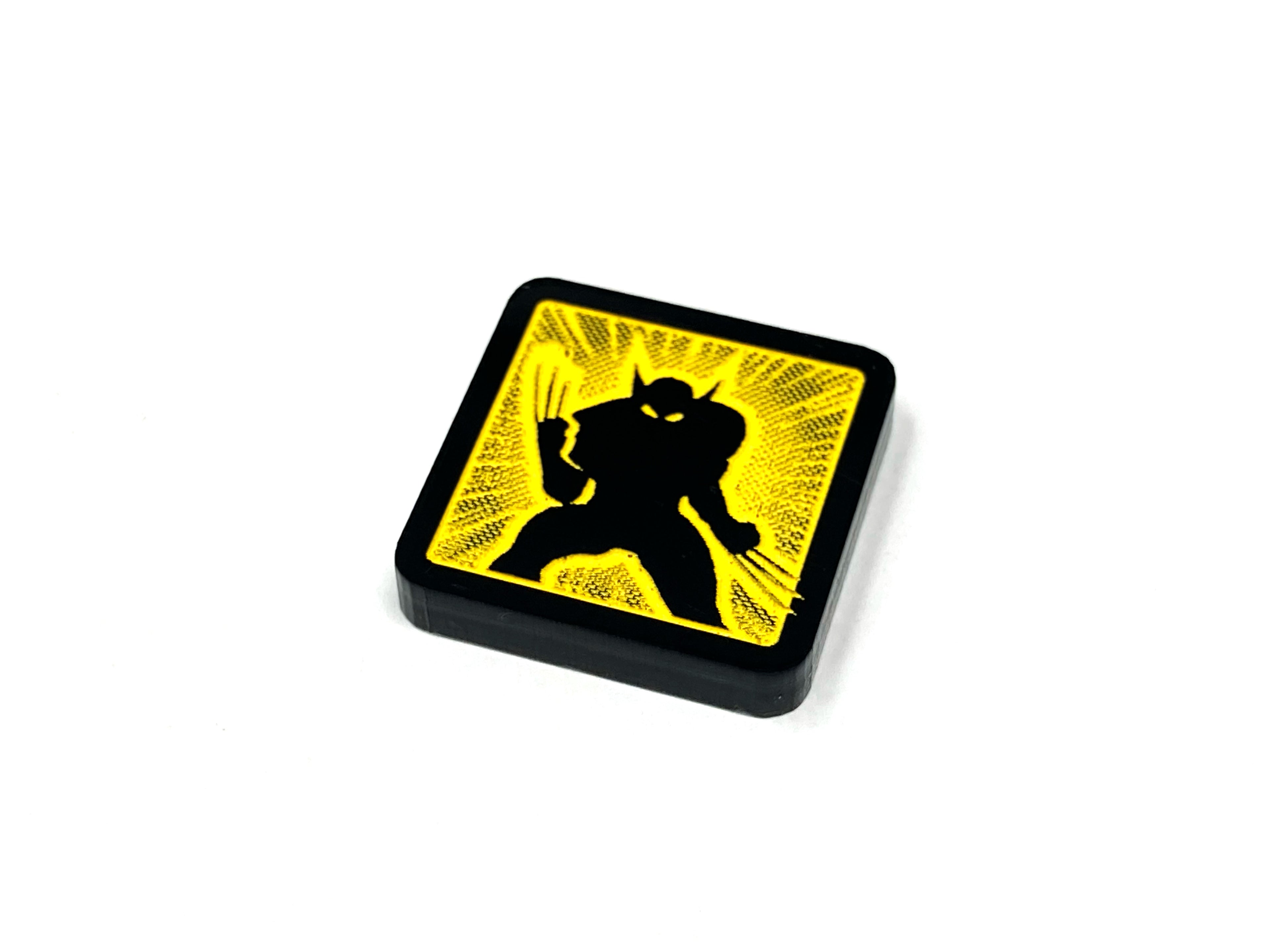 - 1 x Wolverine Healing Factor Token, double sided, etched and cut from opaque black acrylic and painted silver on one side and yellow on the other side, and measuring 18mm x 18mm
