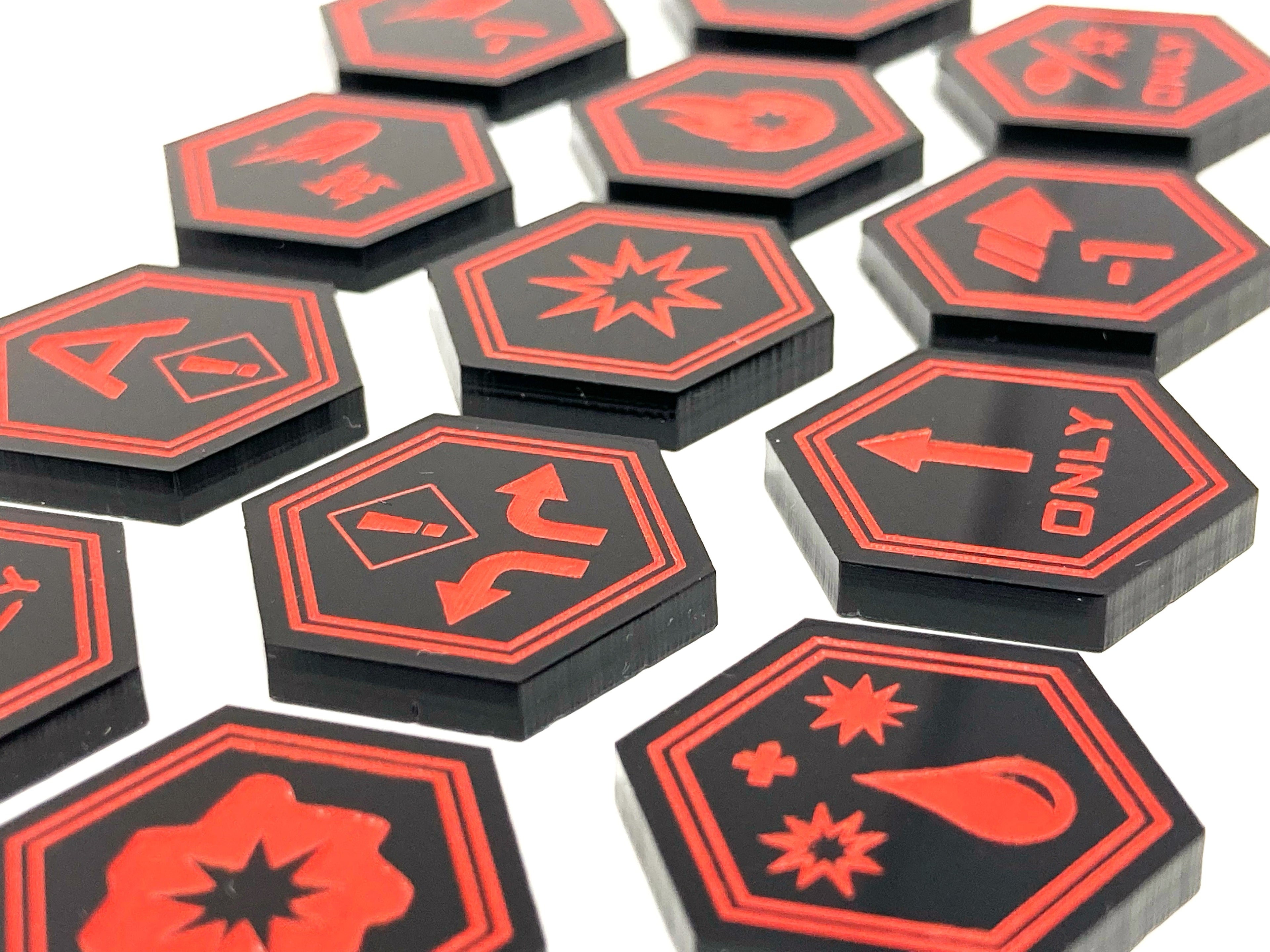 - 13 x Critical hit tokens, laser etched and cut from opaque black acrylic and painted red on one side, measuring 20mm x 20mm.