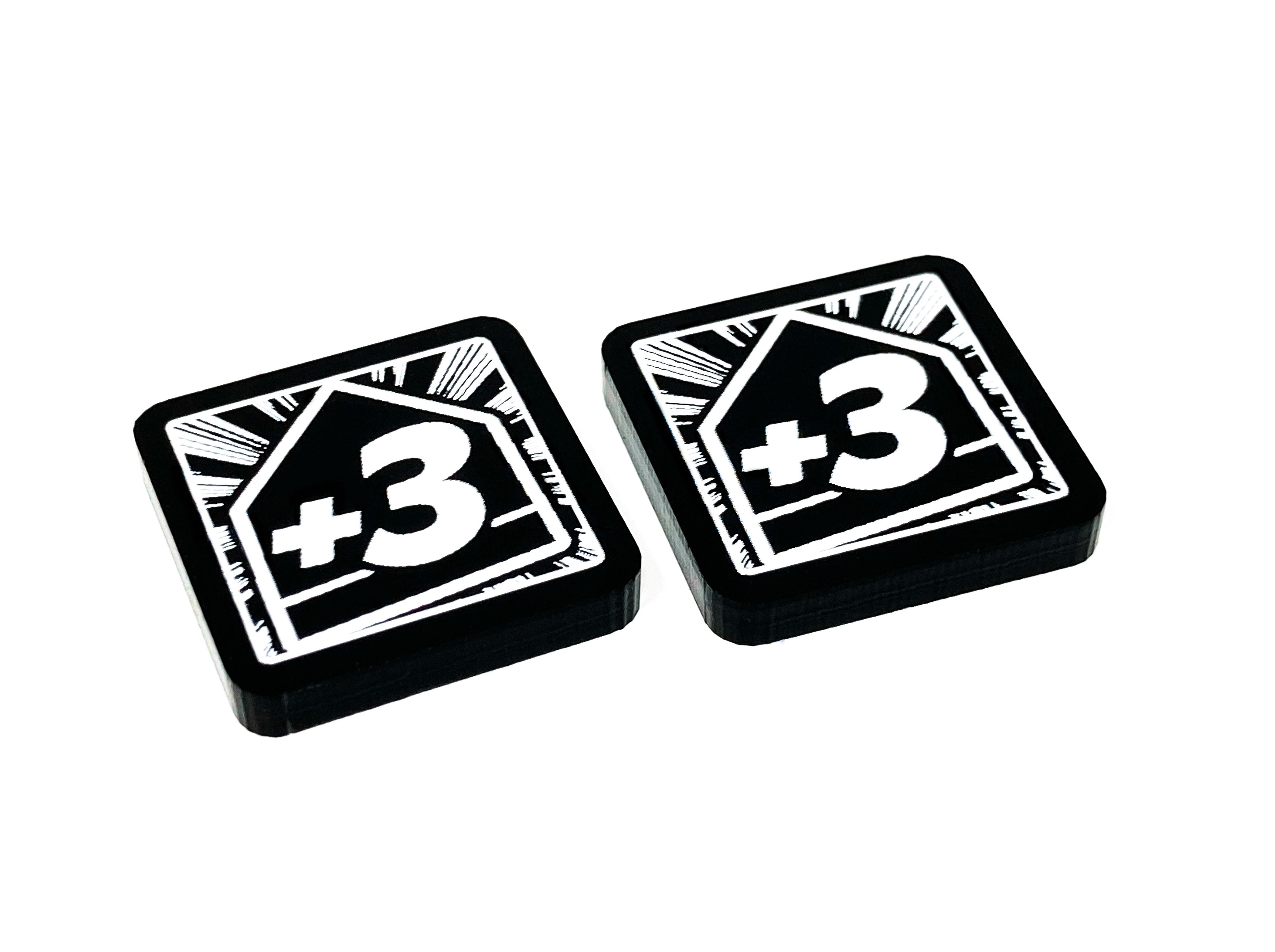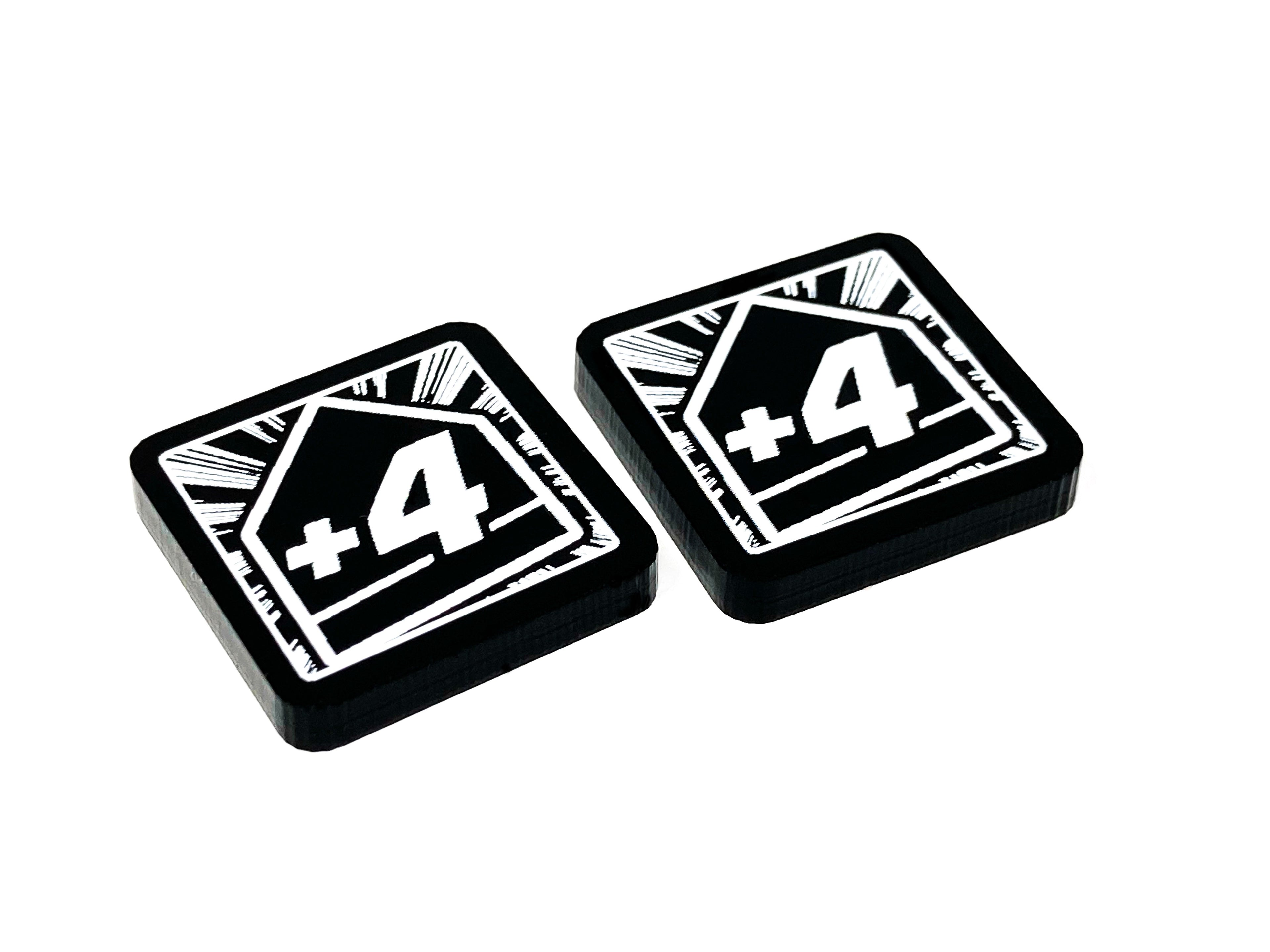 - 2 x Acceleration Tokens +3/+4, double sided, etched and cut from opaque black acrylic, painted white on both sides, and measuring 18mm x 18mm