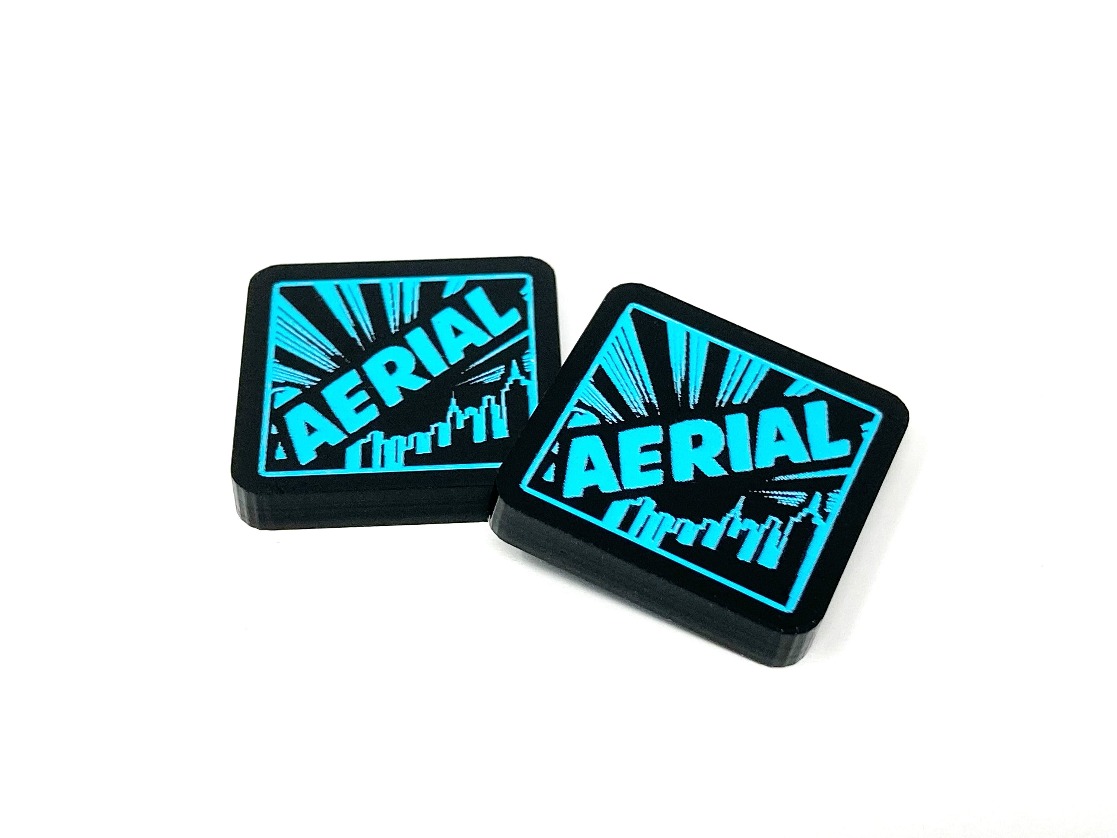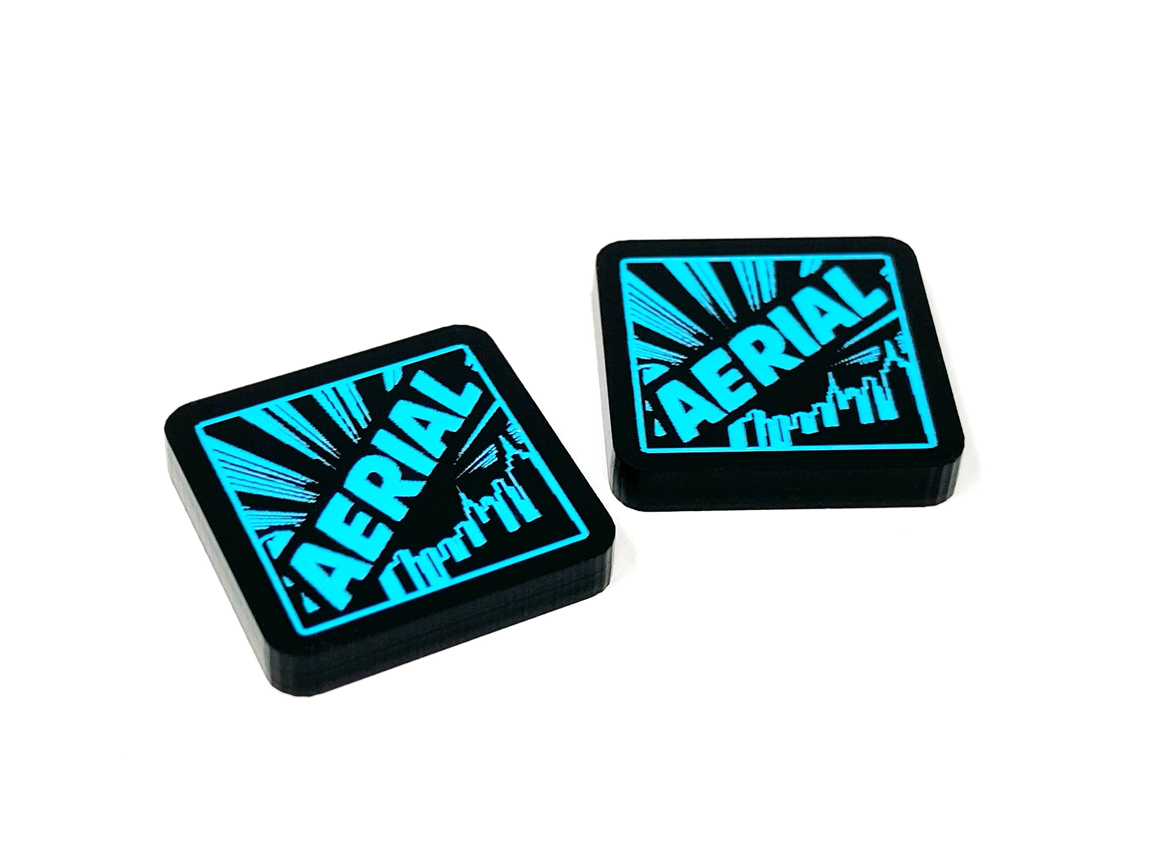 - 2 x Aerial Condition Tokens, double sided, etched and cut from opaque black acrylic, painted light blue on both sides, and measuring 18mm x 18mm