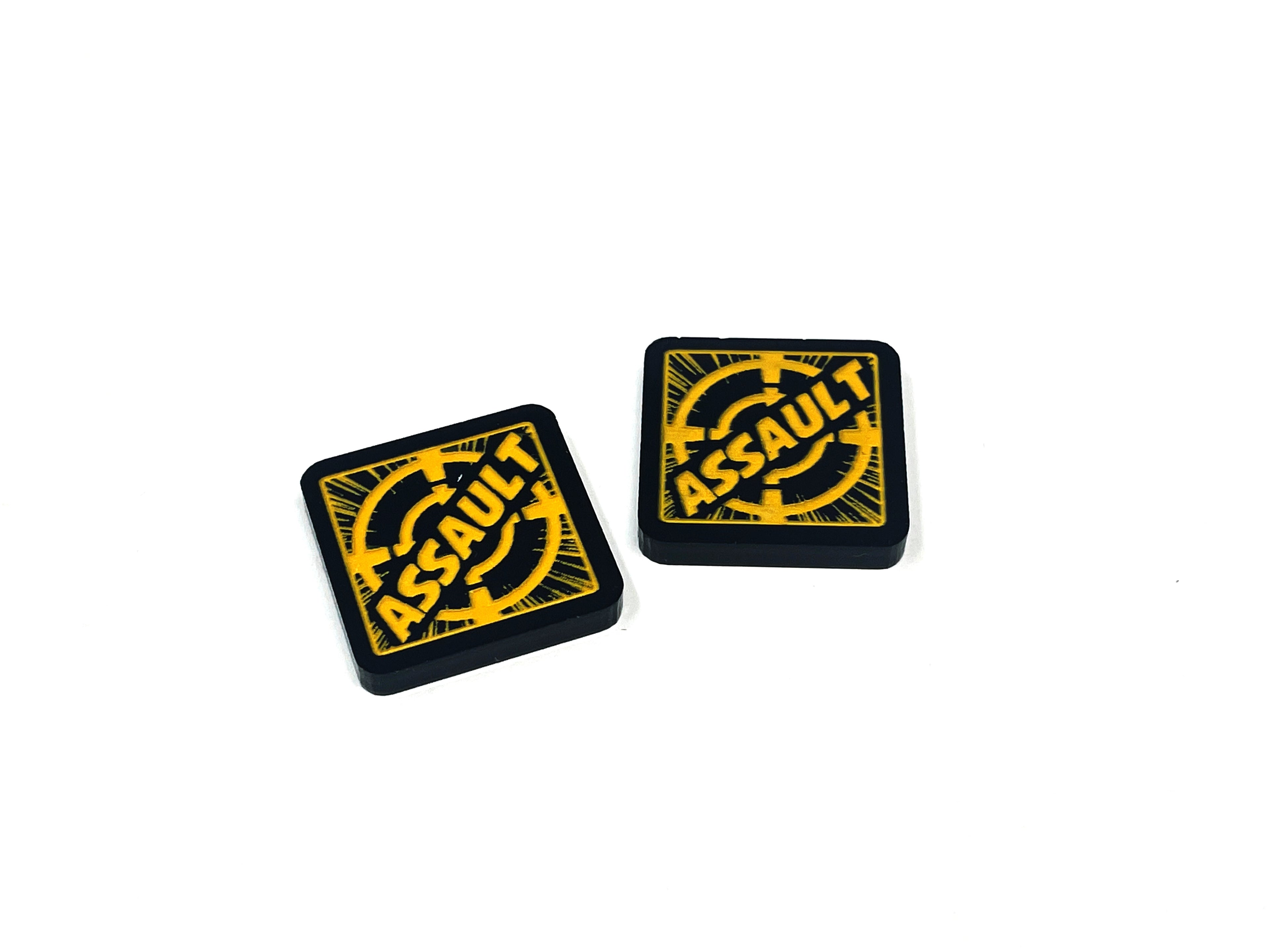 - 2 x Assault Condition Tokens, double sided, etched and cut from black acrylic, painted deep yellow on both sides and measuring 18mm x 18mm