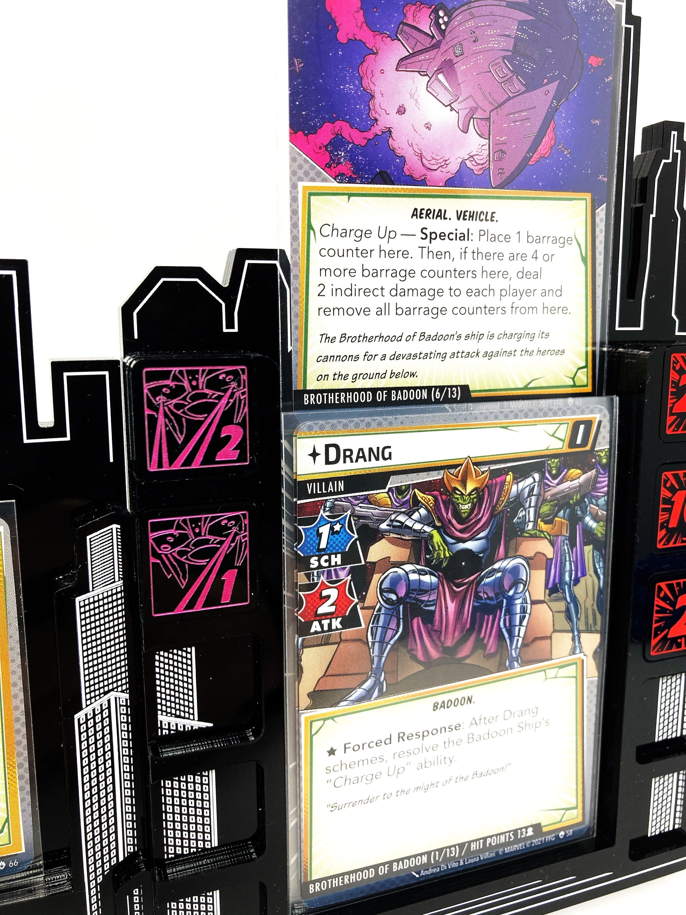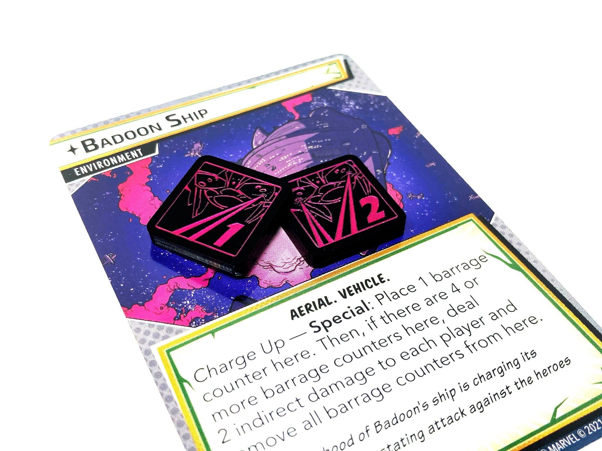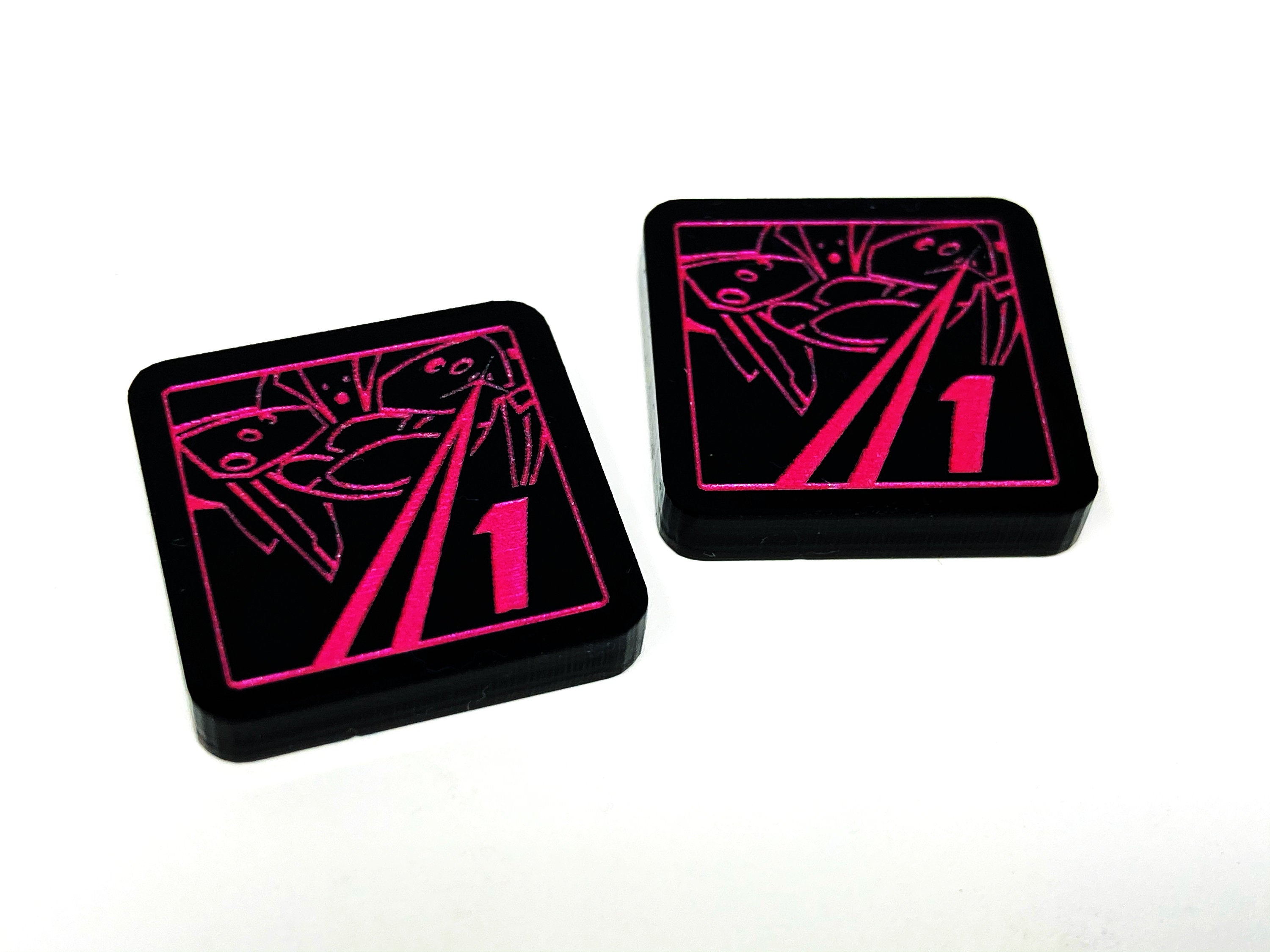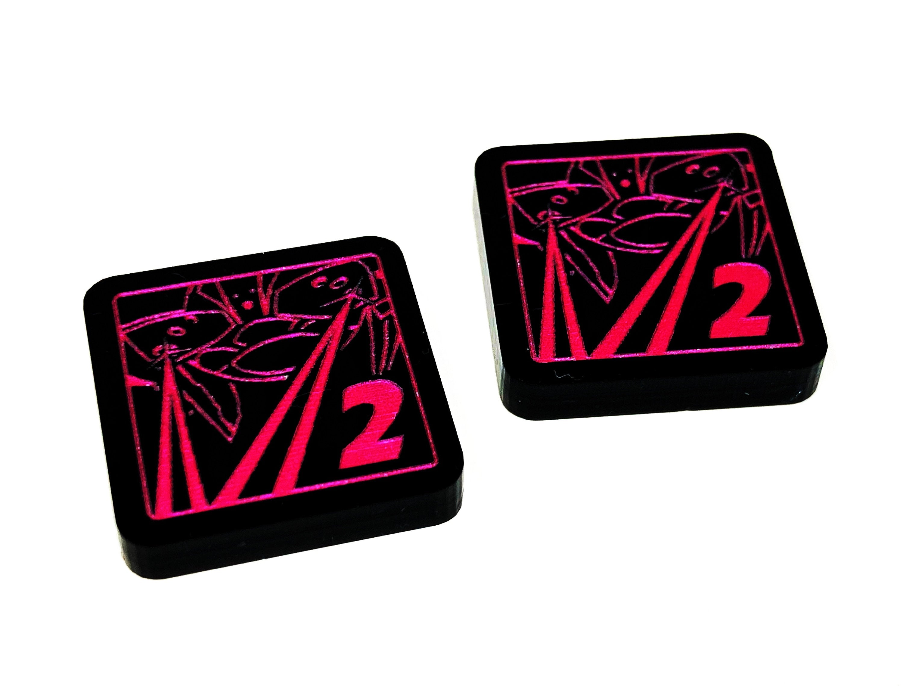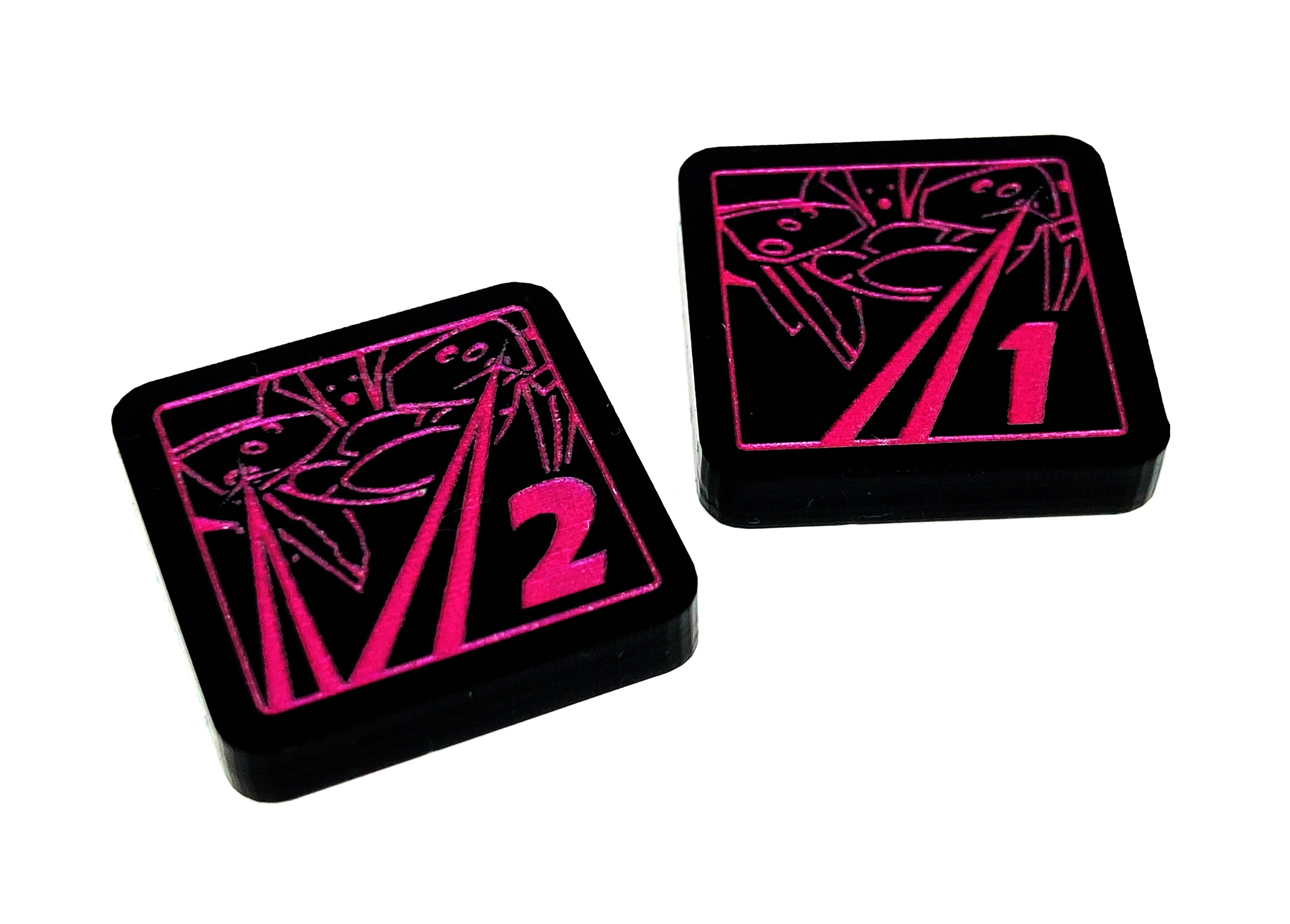 - 2 x Barrage Tokens, double sided showing 1 on one side and 2 on the reverse side, etched and cut from opaque black acrylic, painted metallic pink on both sides, and measuring 18mm x 18mm
