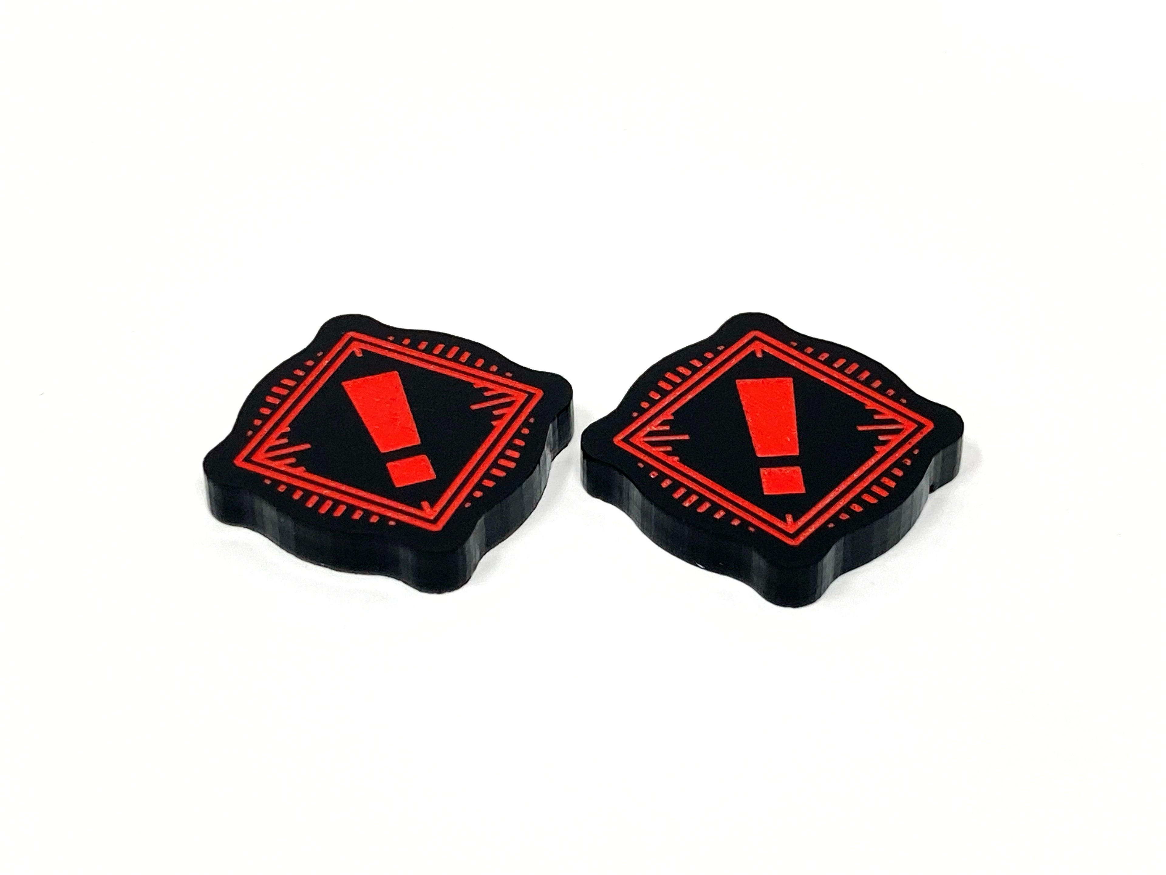 2 x Charge/Stress tokens laser etched and cut from opaque black acrylic and painted yellow on the charge side and painted red on the stress side, measuring 20mm x 20mm.