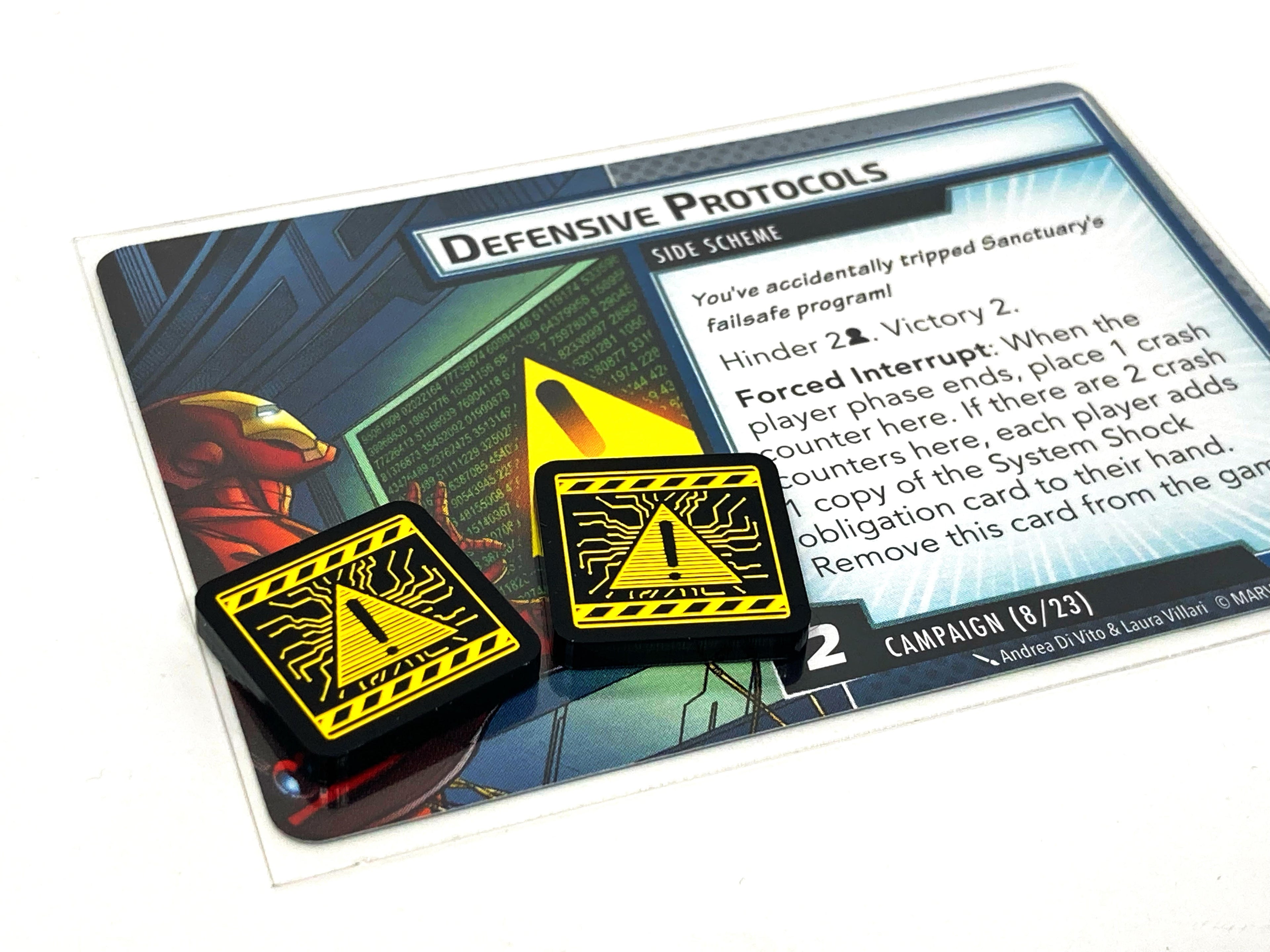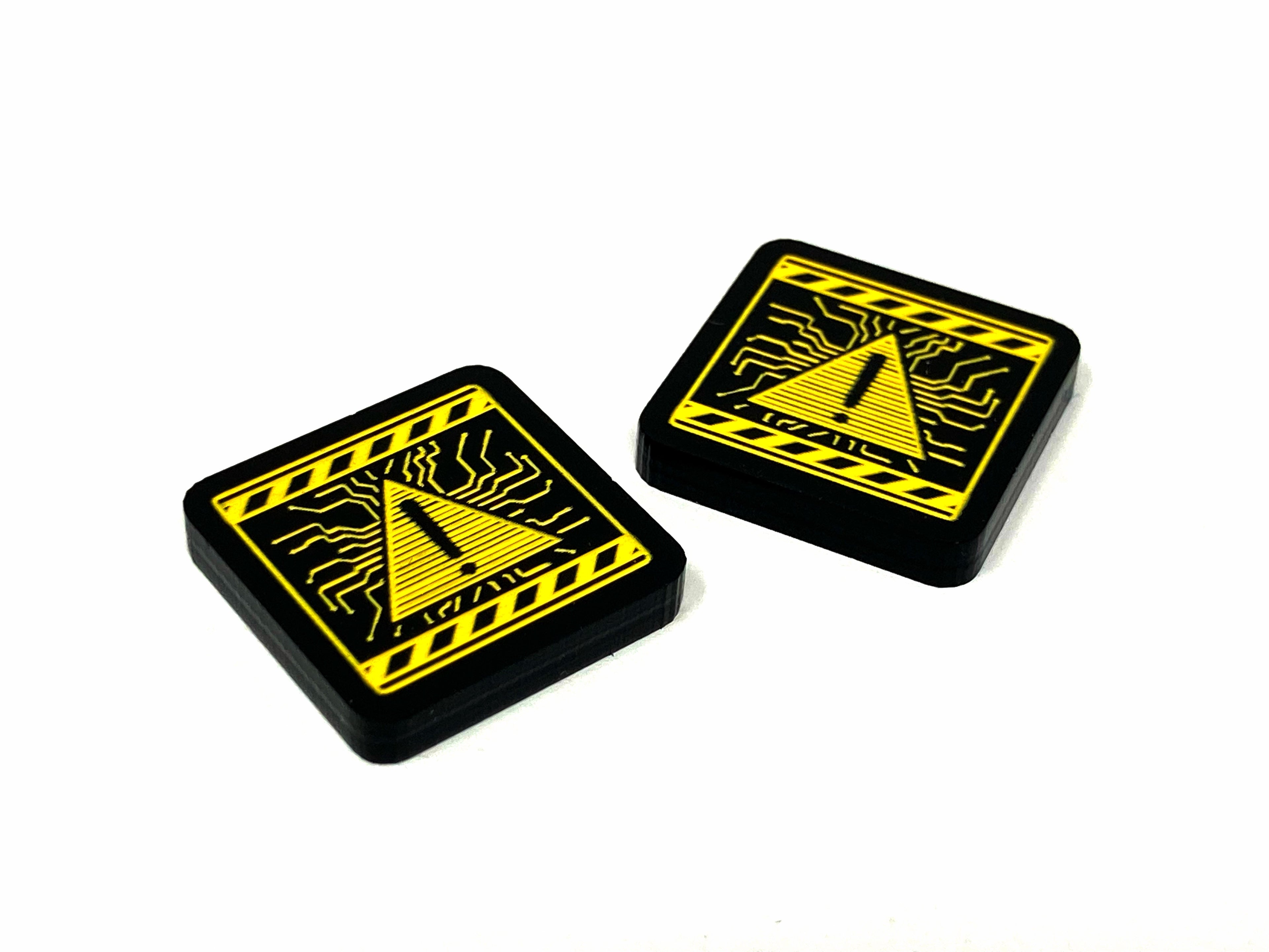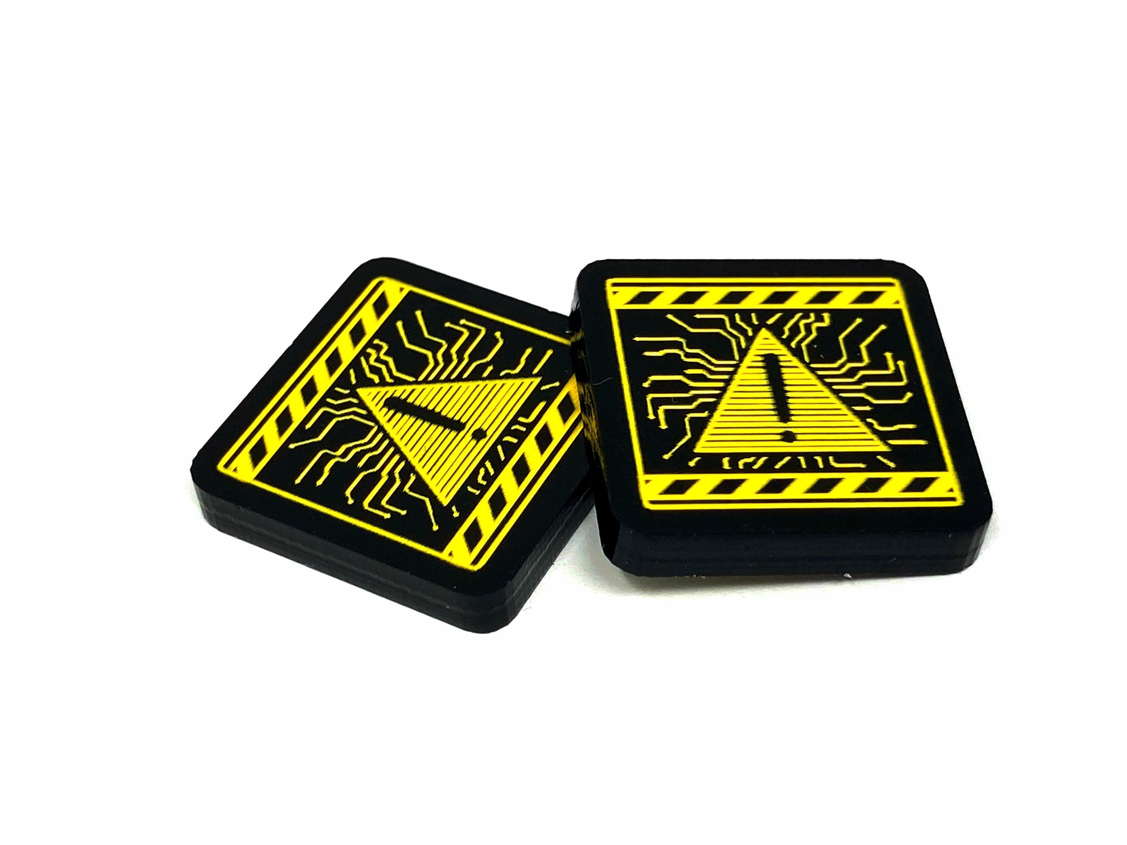 - 2 x Crash Tokens, double sided, etched and cut from opaque black acrylic, painted yellow on both sides, and measuring 18mm x 18mm