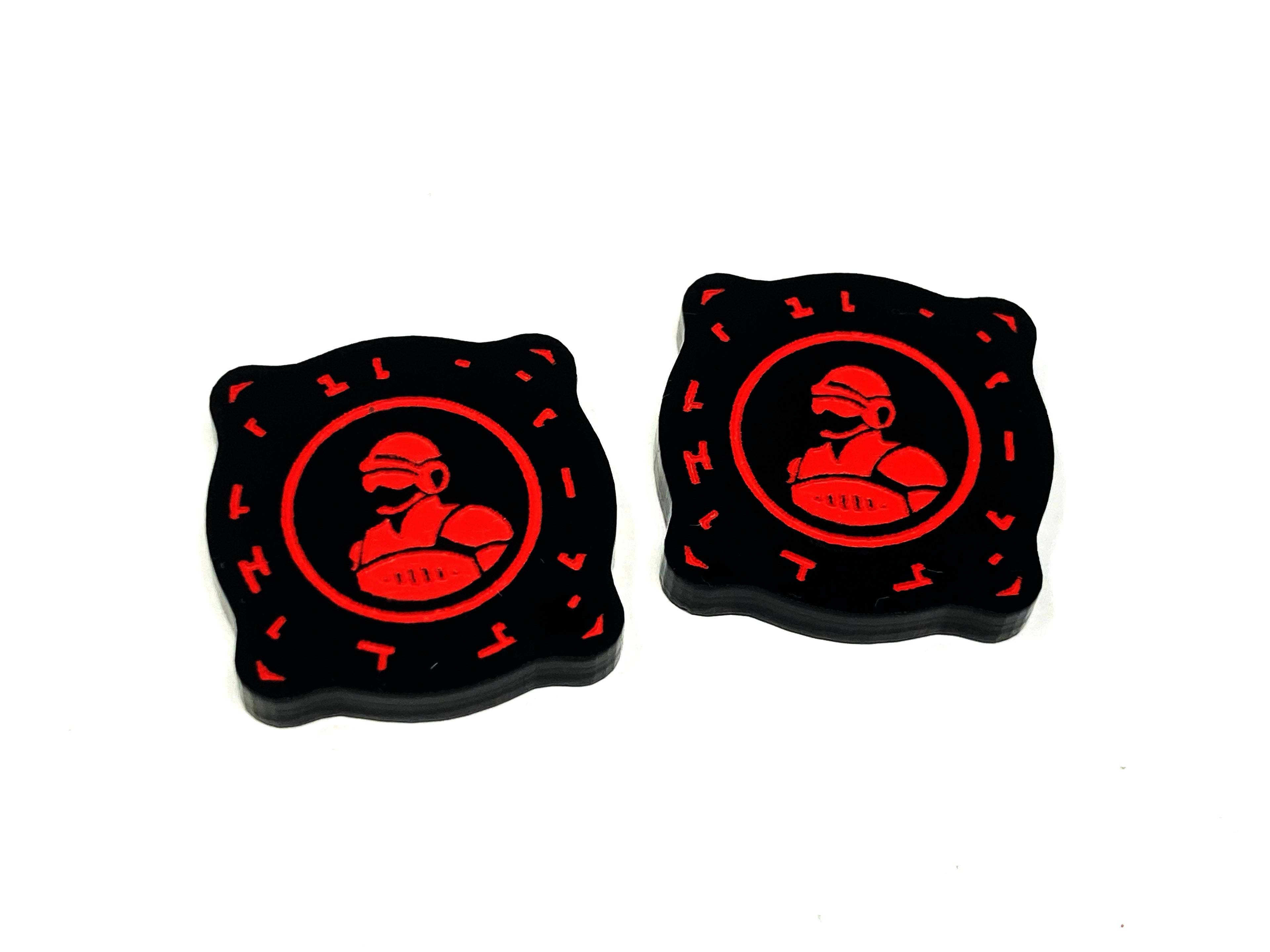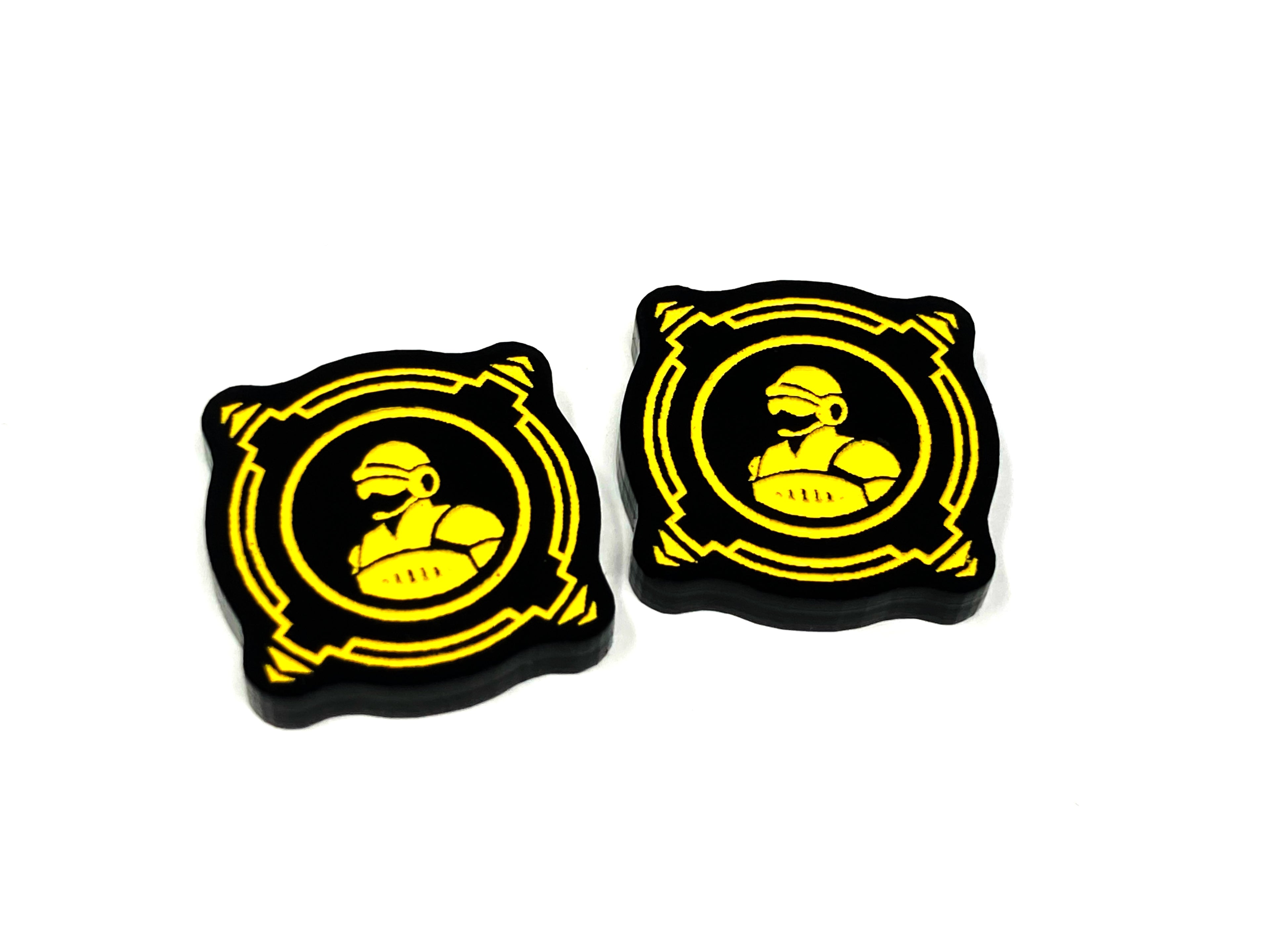 - 2 x Crew Charge tokens, laser etched and cut from opaque black acrylic and painted yellow on one side and painted red on the reverse, measuring 20mm x 20mm.