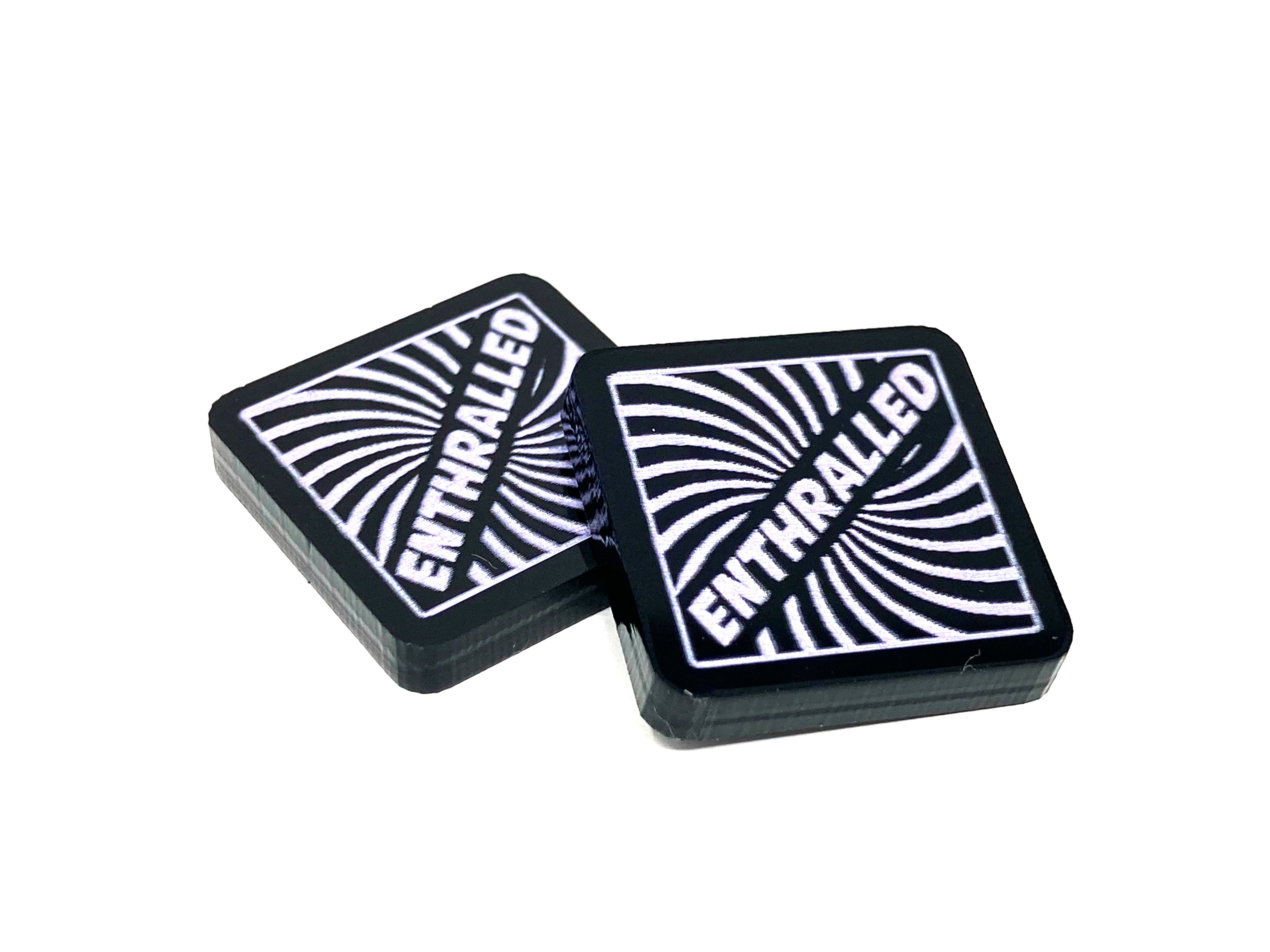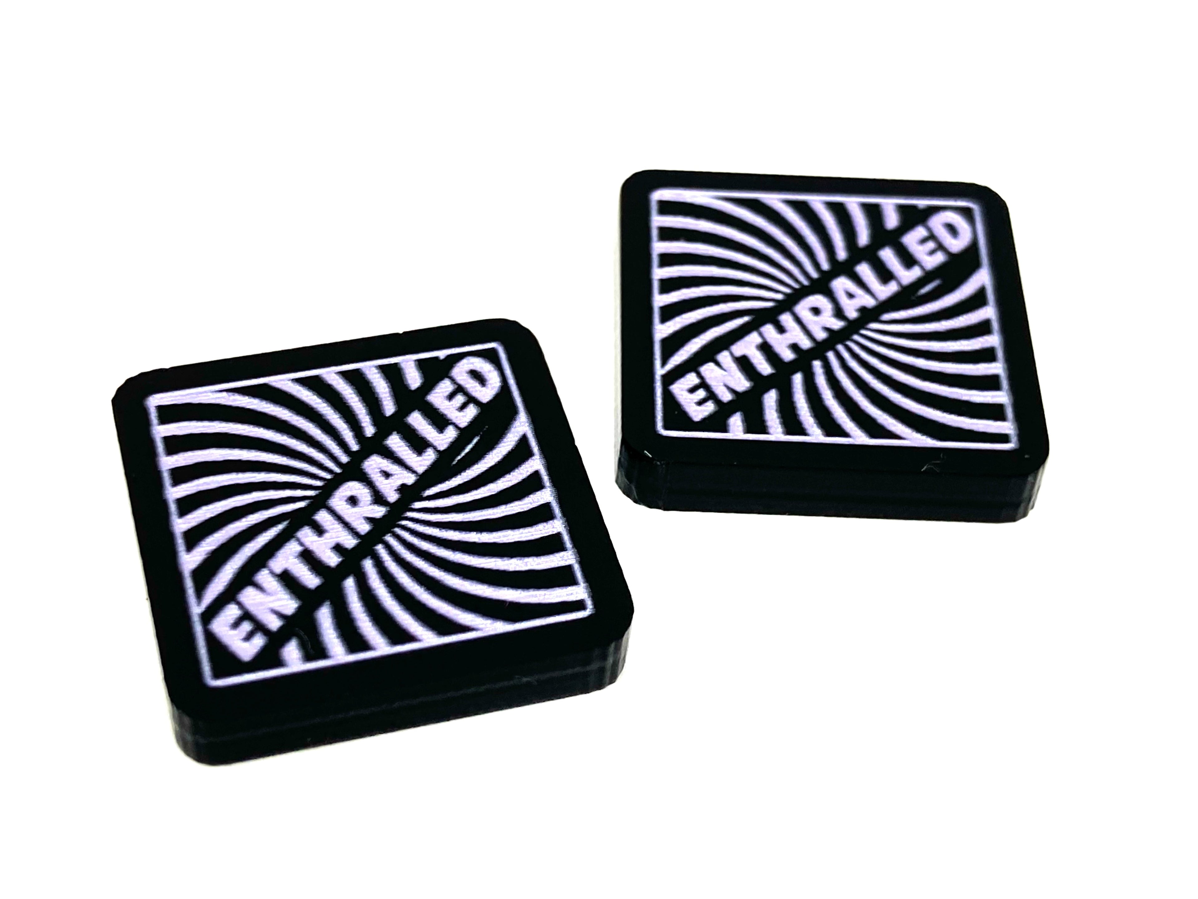 - 2 x Enthralled Tokens, double sided, etched and cut from opaque black acrylic, painted metallic pink on both sides, and measuring 18mm x 18mm