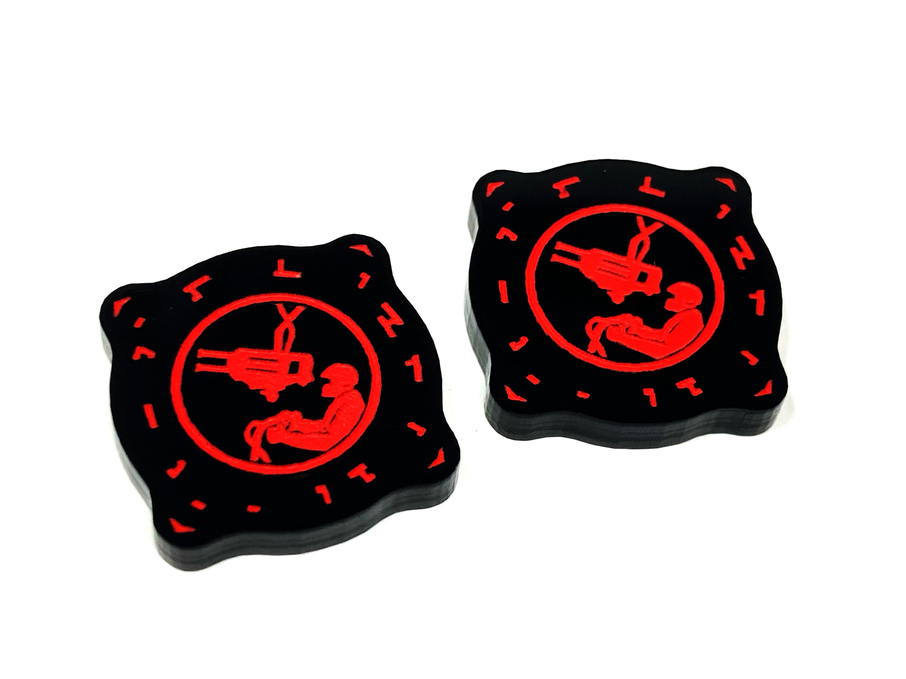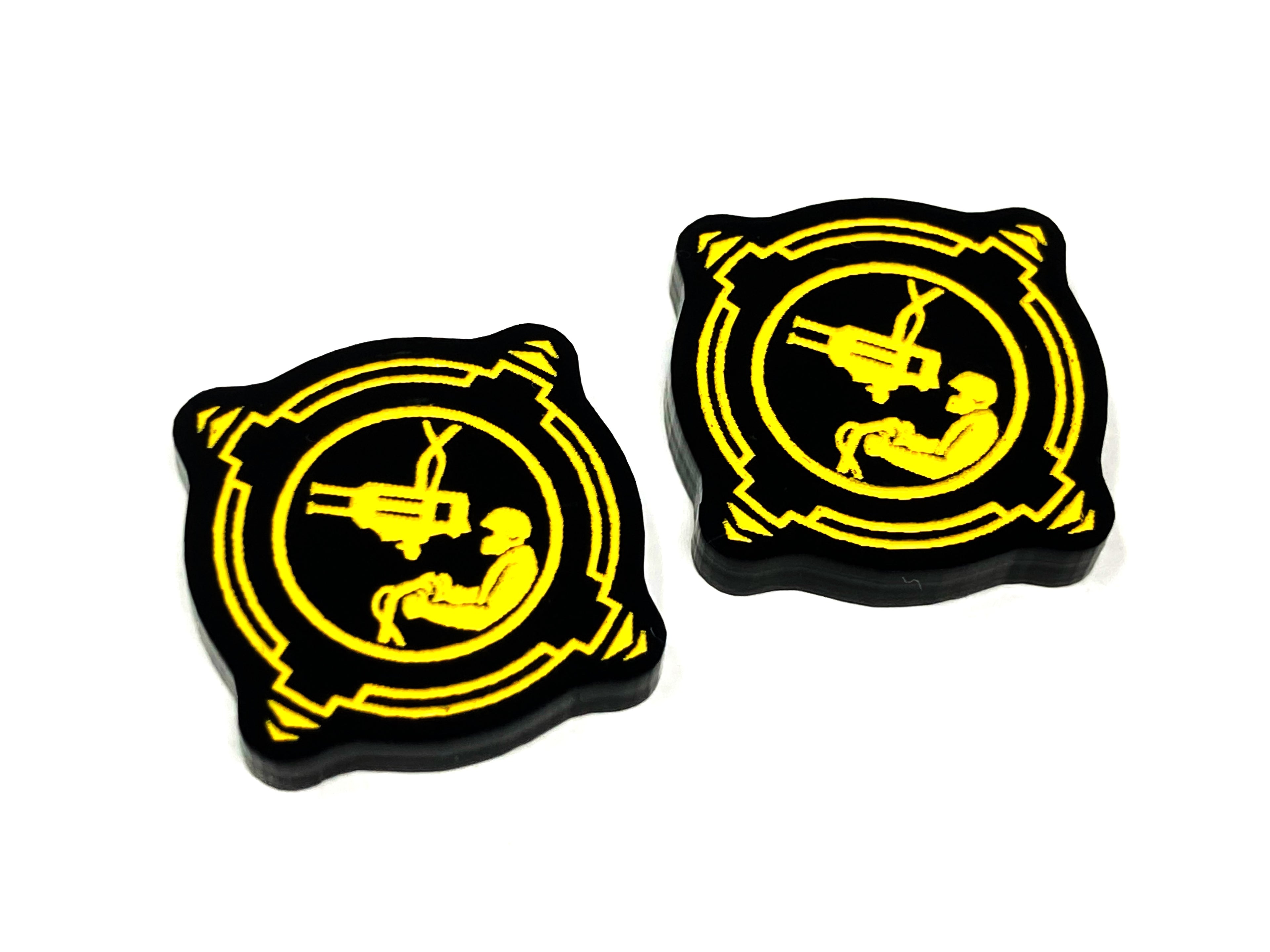 - 2 x Gunner Charge tokens, laser etched and cut from opaque black acrylic and painted yellow on one side and painted red on the reverse, measuring 20mm x 20mm.