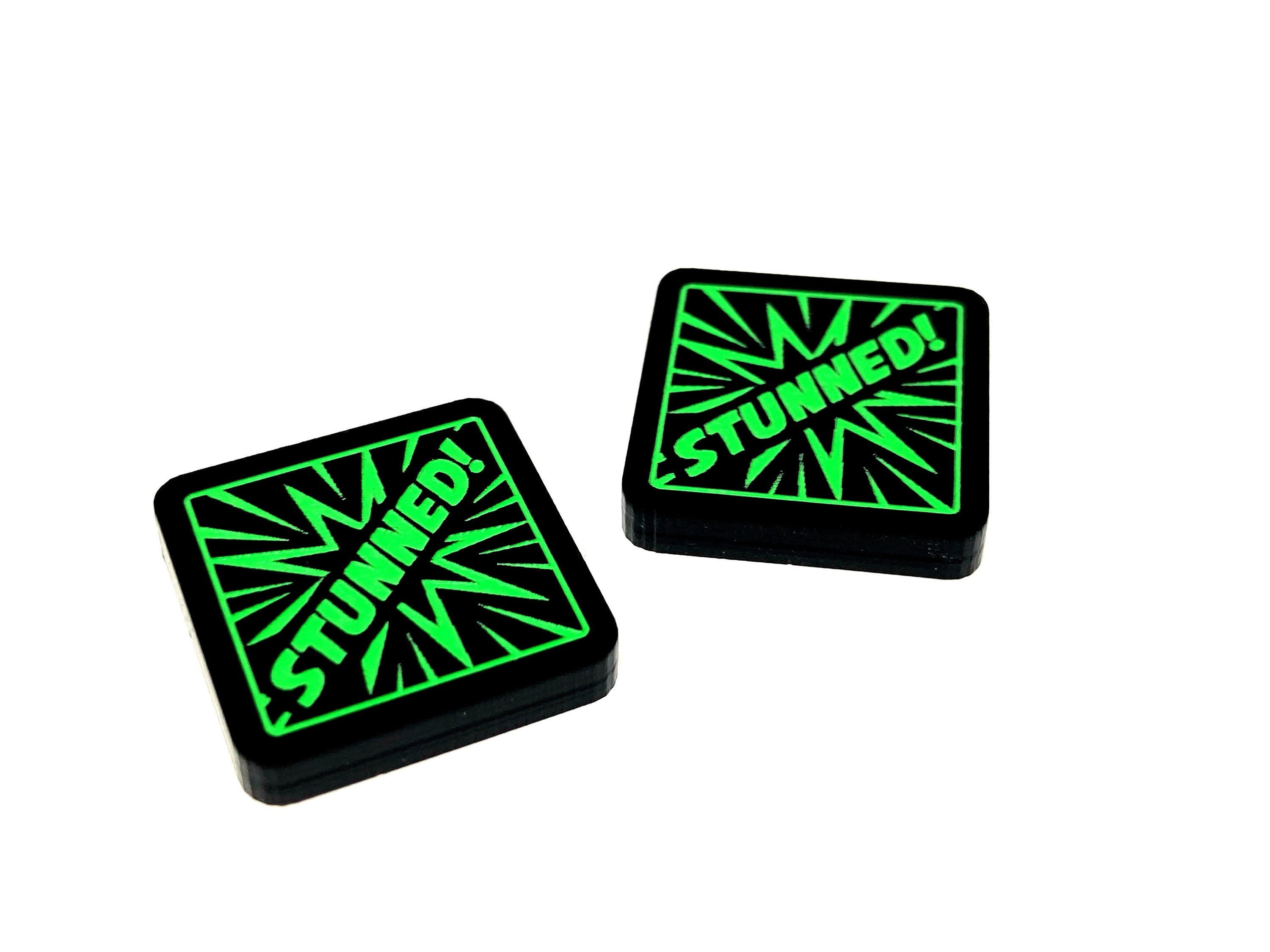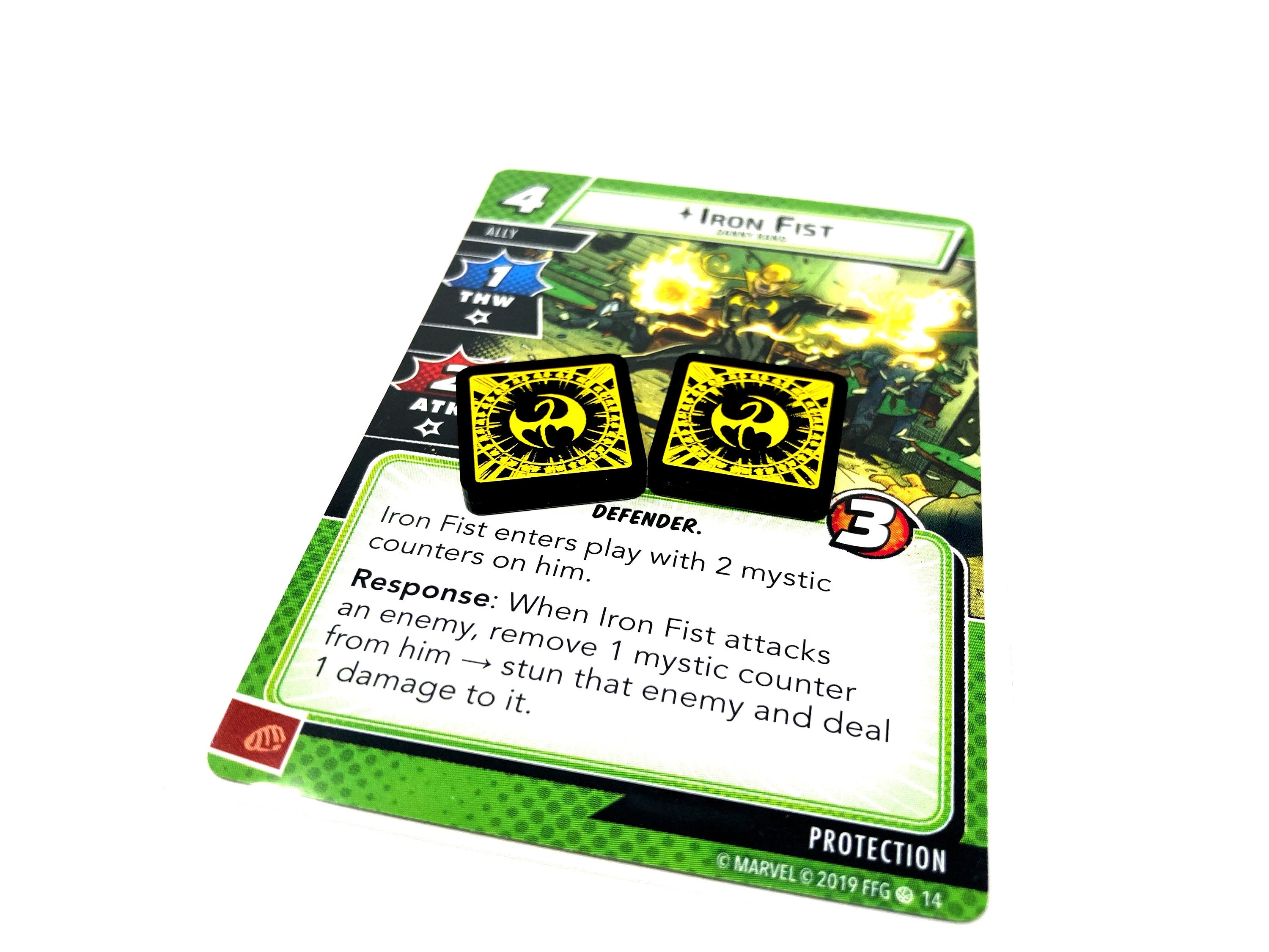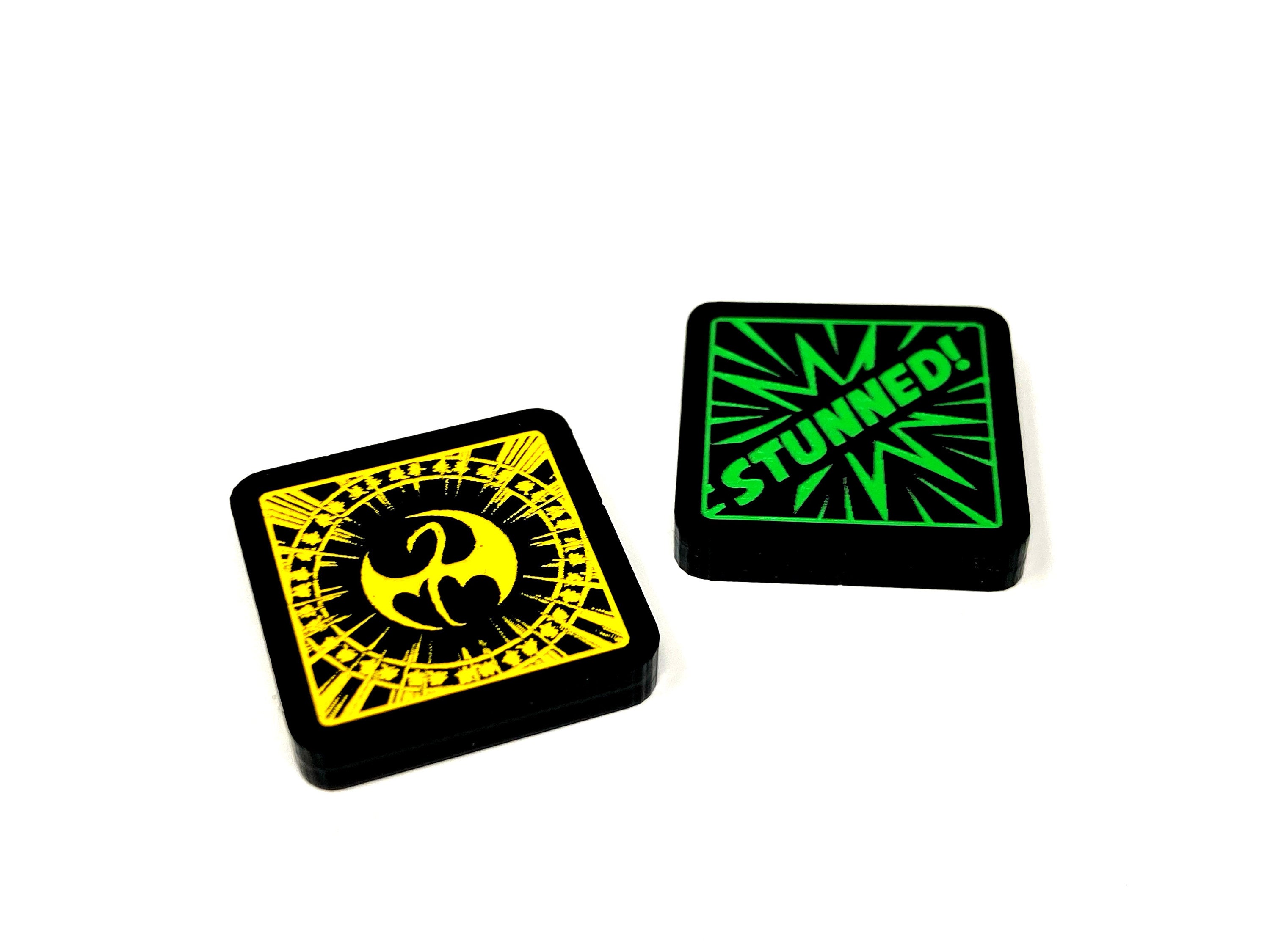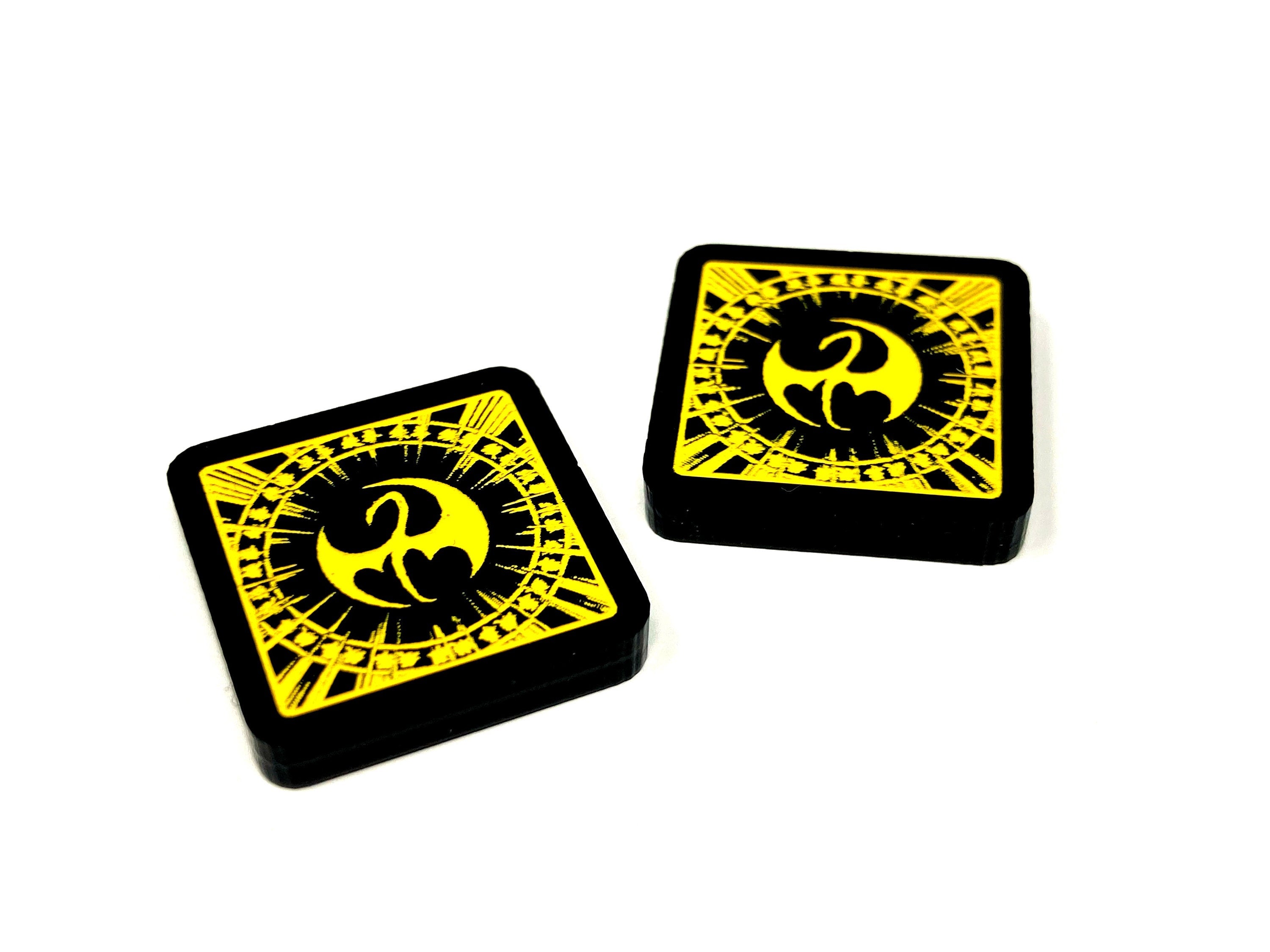 - 2 x Iron Fist Mystic Tokens, double sided with Iron Fist' design on one side and 'stunned' on the reverse side, etched and cut from opaque black acrylic, painted yellow and green respectively and measuring 18mm x 18mm