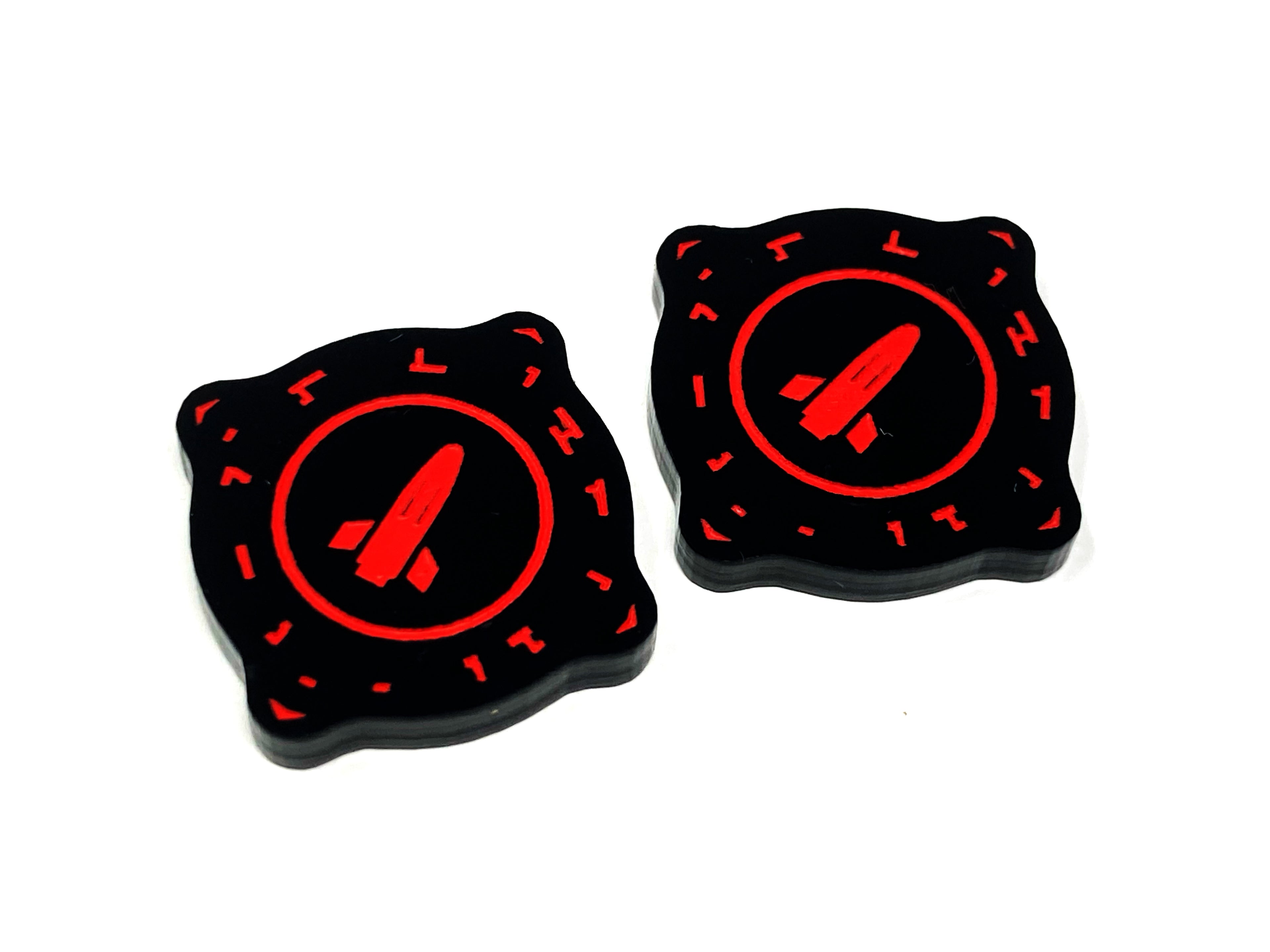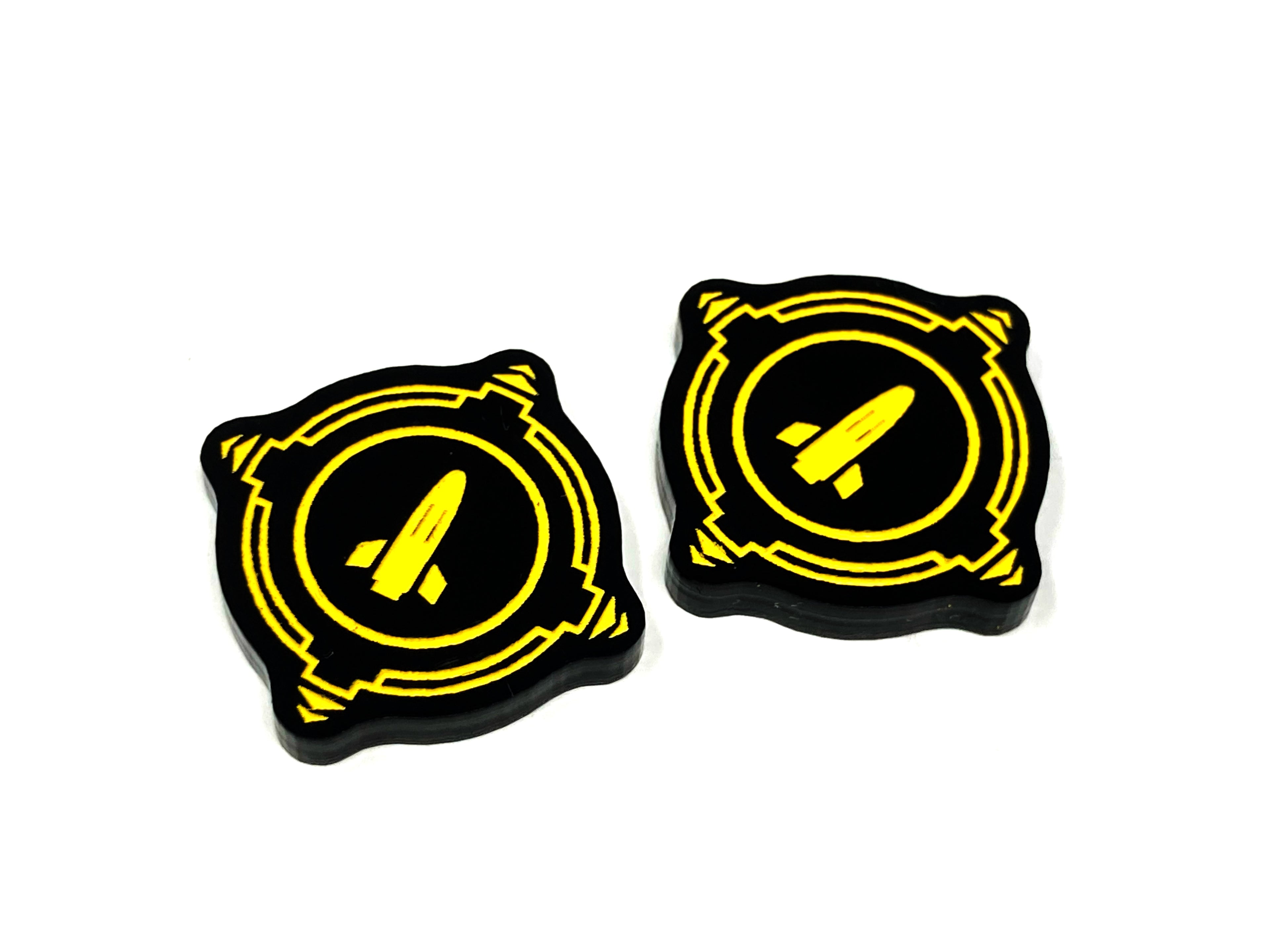 - 2 x Missile Charge tokens, laser etched and cut from opaque black acrylic and painted yellow on one side and painted red on the reverse, measuring 20mm x 20mm.