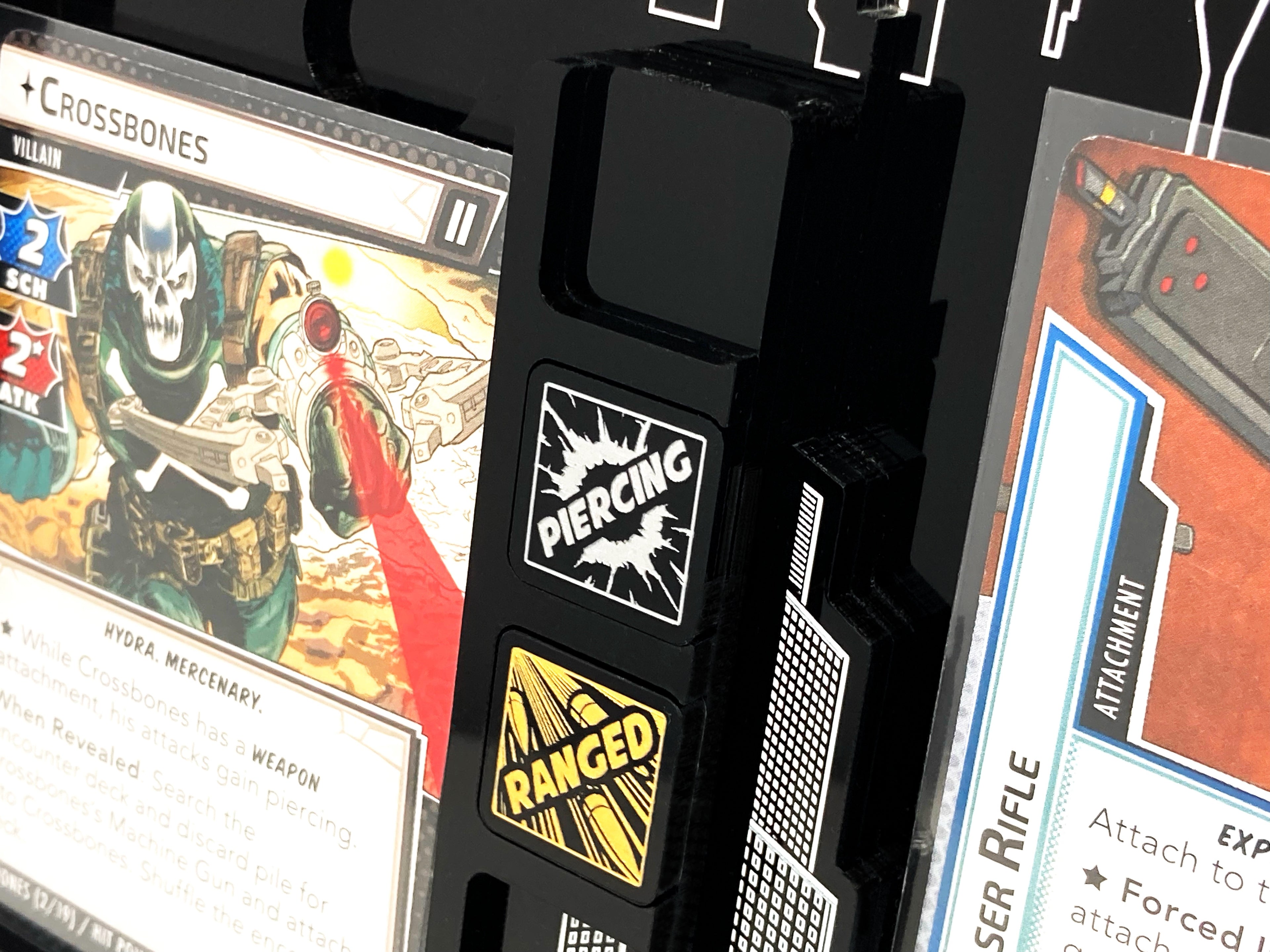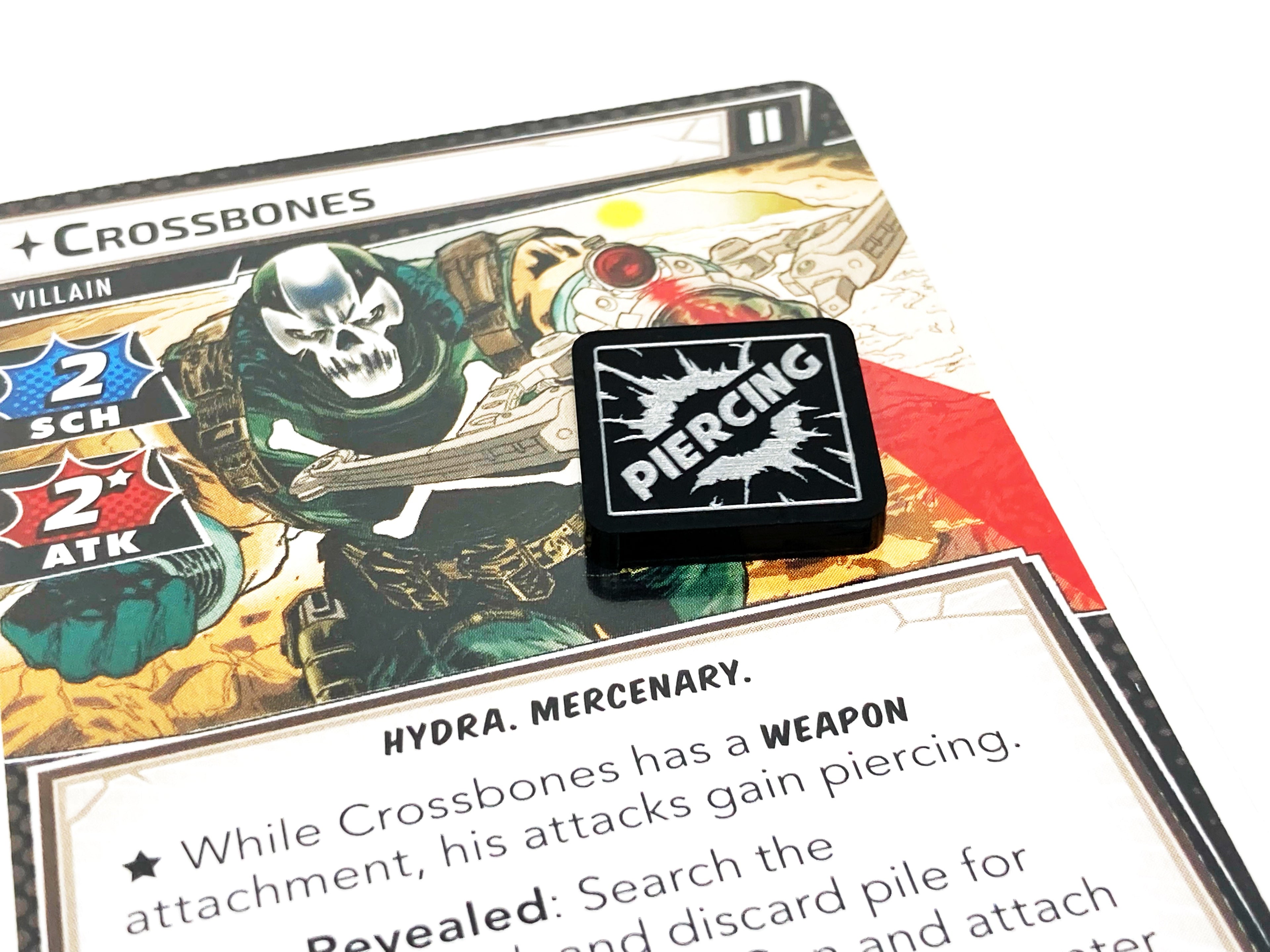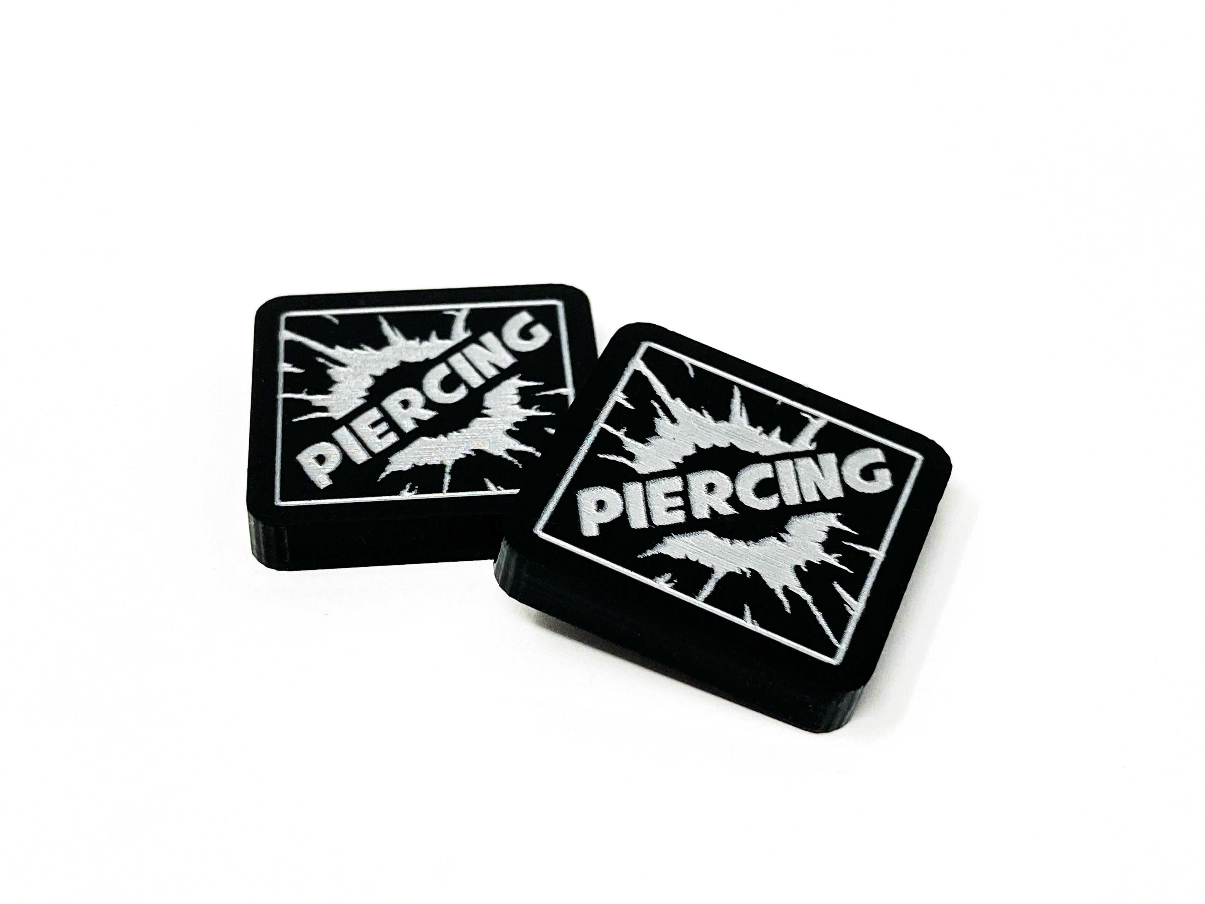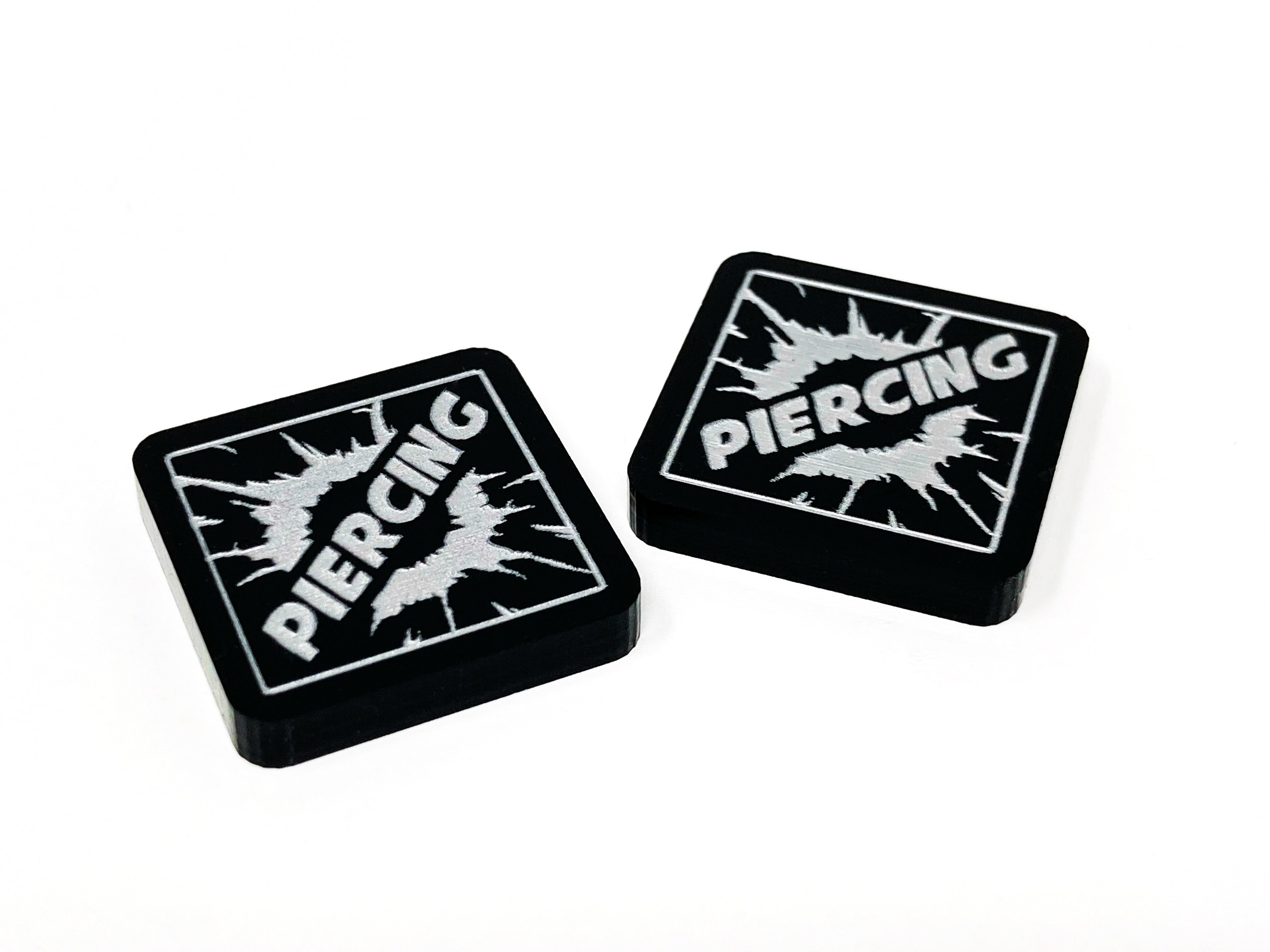 - 2 x Piercing Condition Tokens, double sided, etched and cut from opaque black acrylic, painted silver on both sides, and measuring 18mm x 18mm