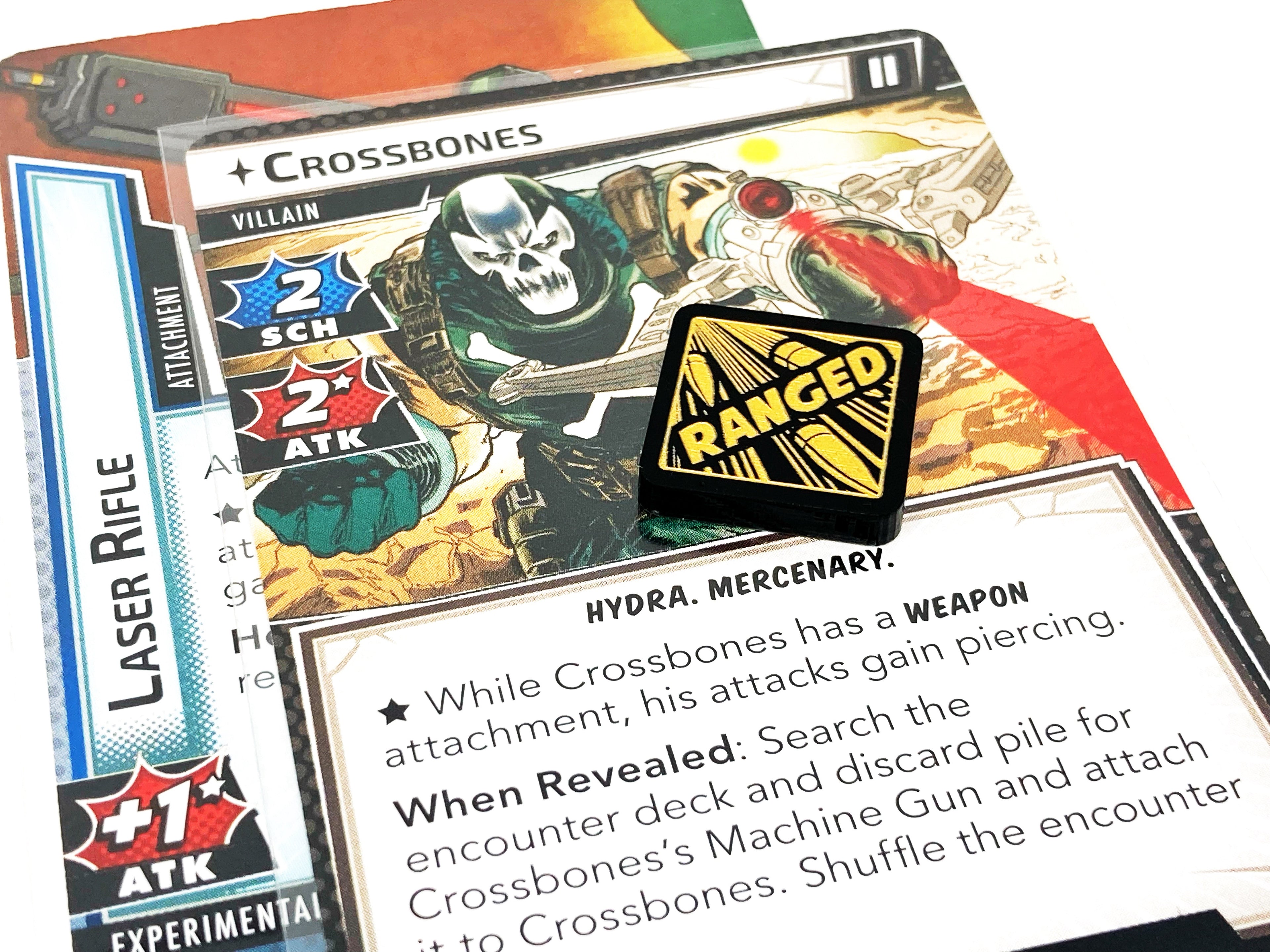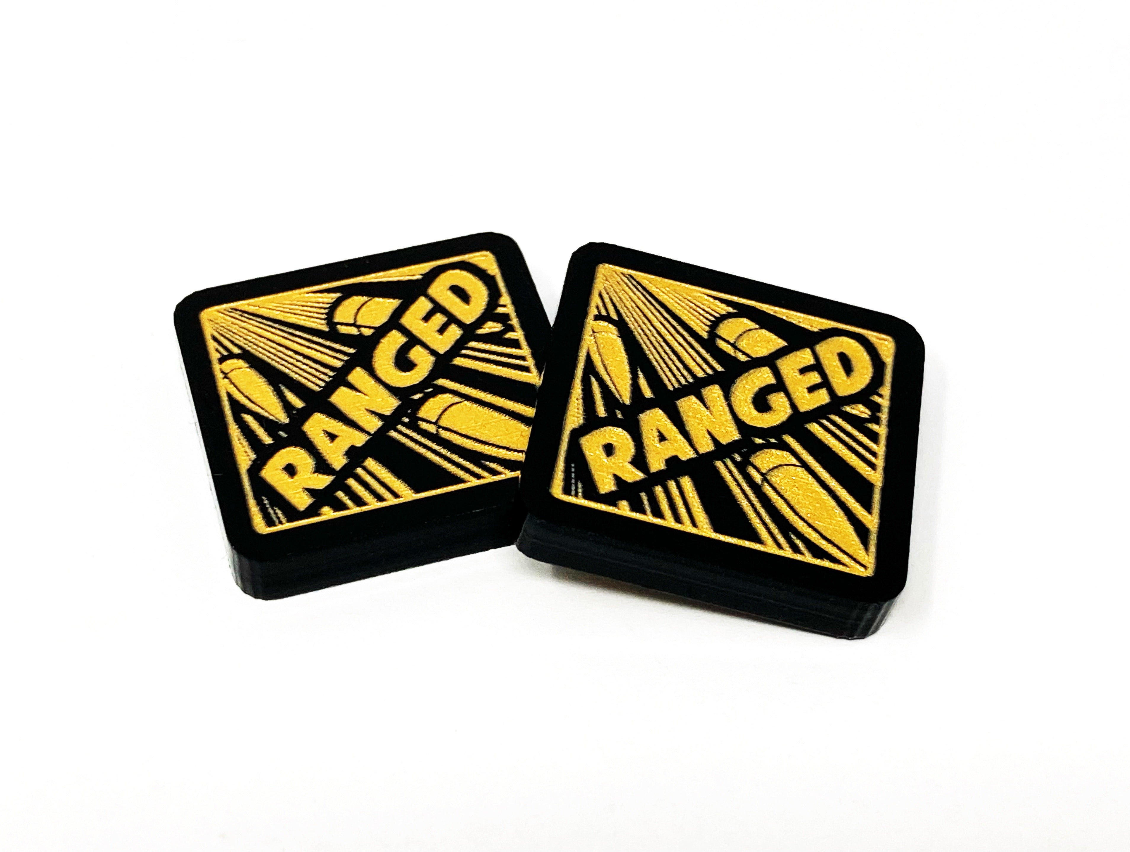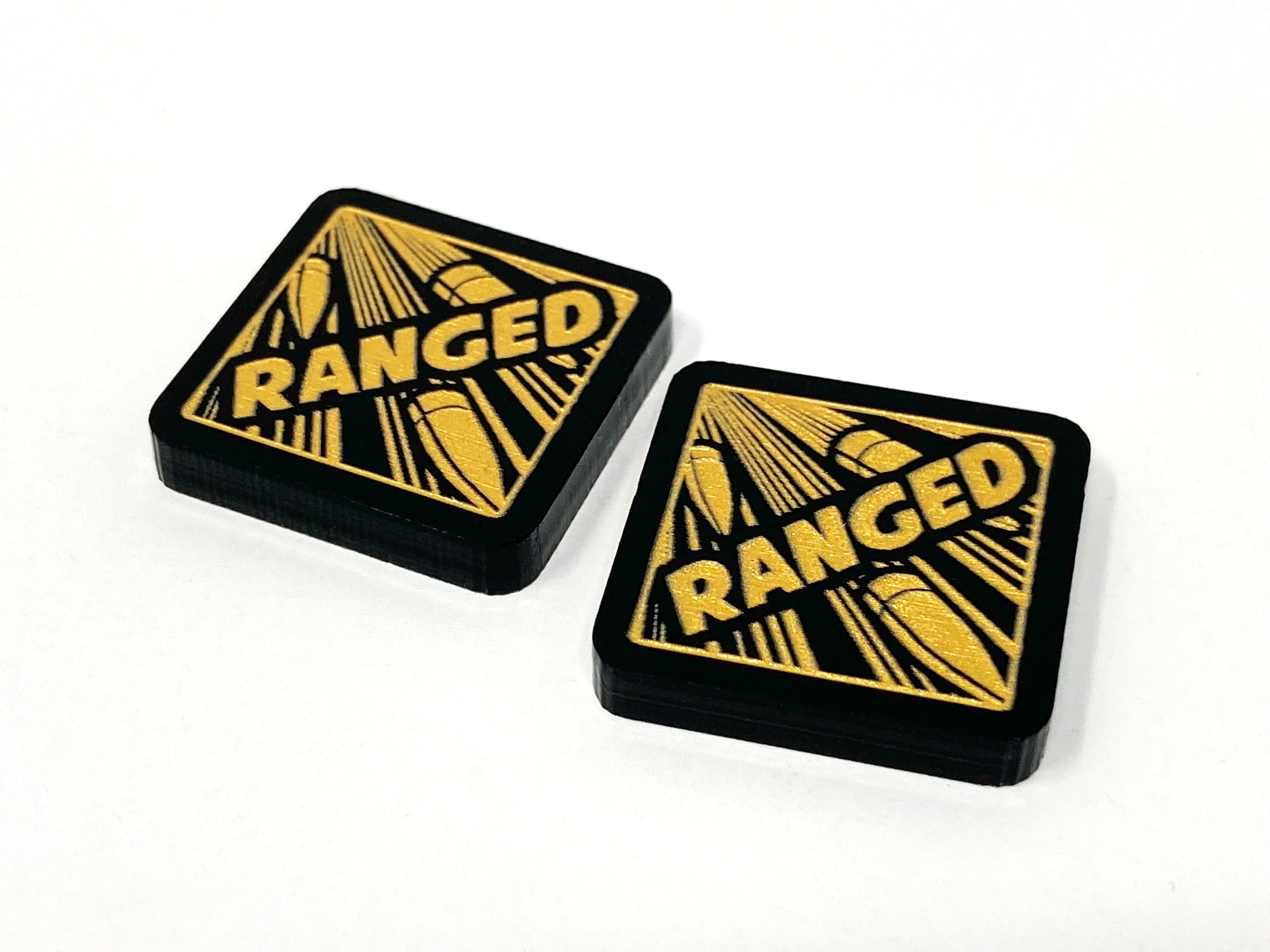 - 2 x Ranged Condition Tokens, double sided, etched and cut from opaque black acrylic, painted gold on both sides, and measuring 18mm x 18mm