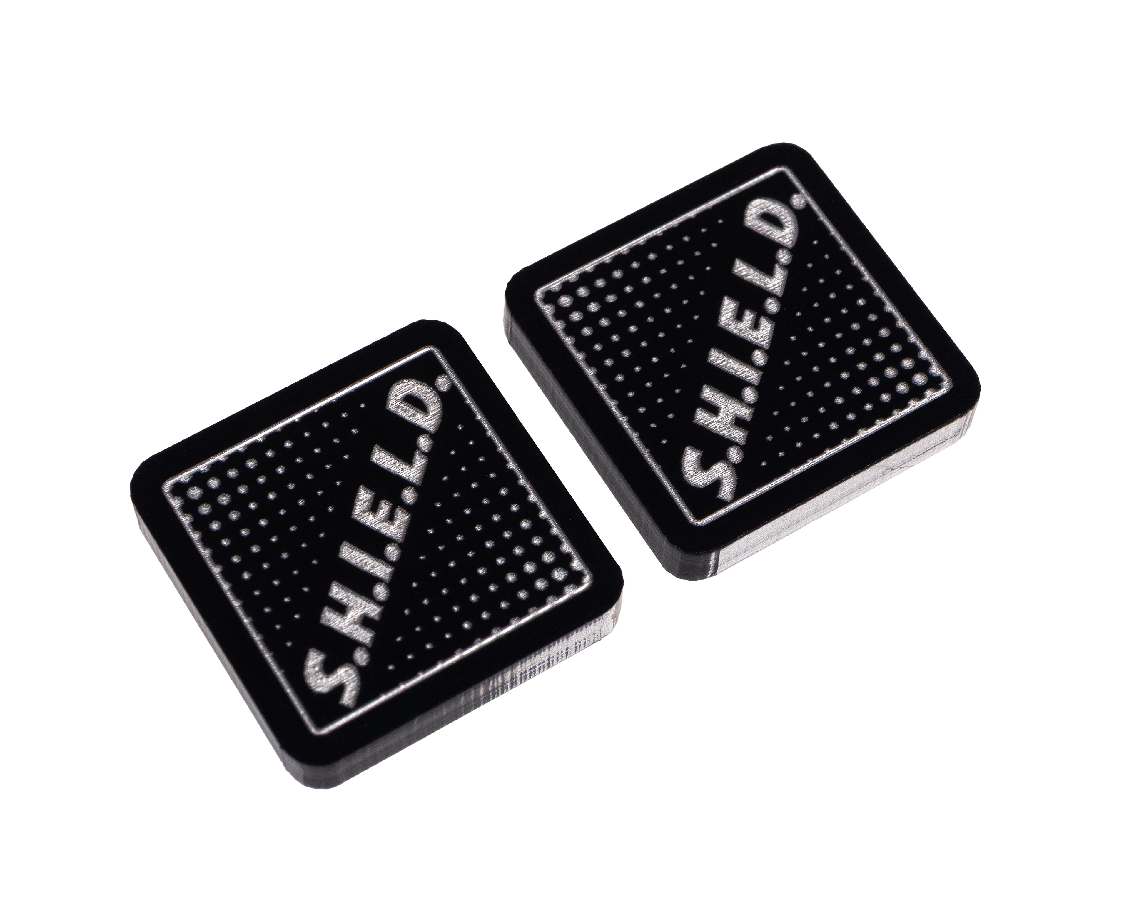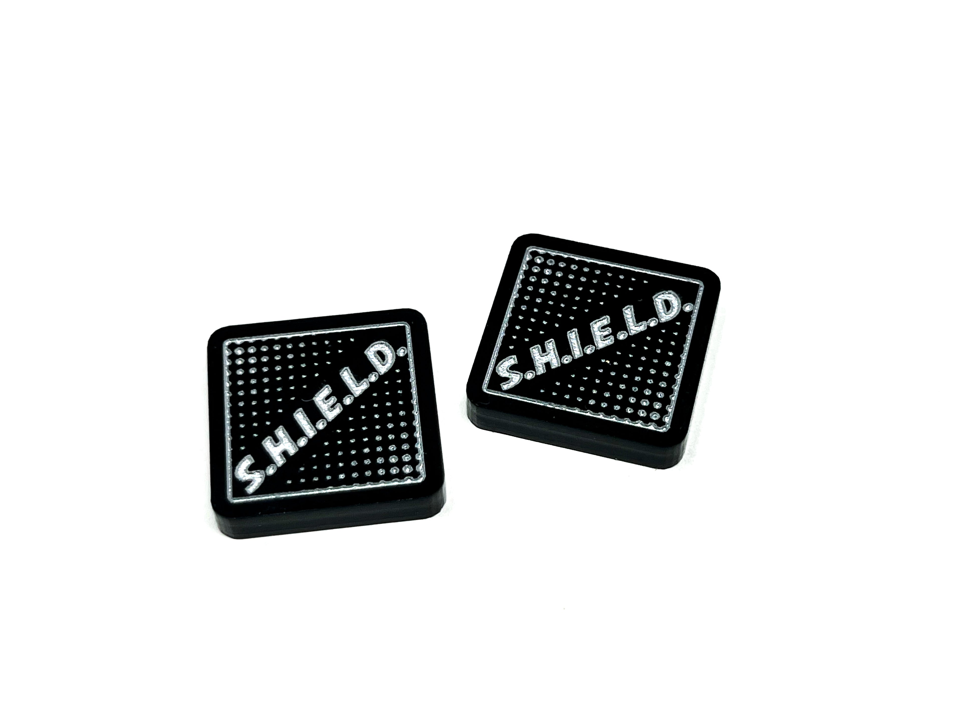 - 2 x S.H.I.E.L.D Trait Tokens, double sided, etched and cut from opaque black acrylic and painted gold on both sides. Measuring 18mm x 18mm