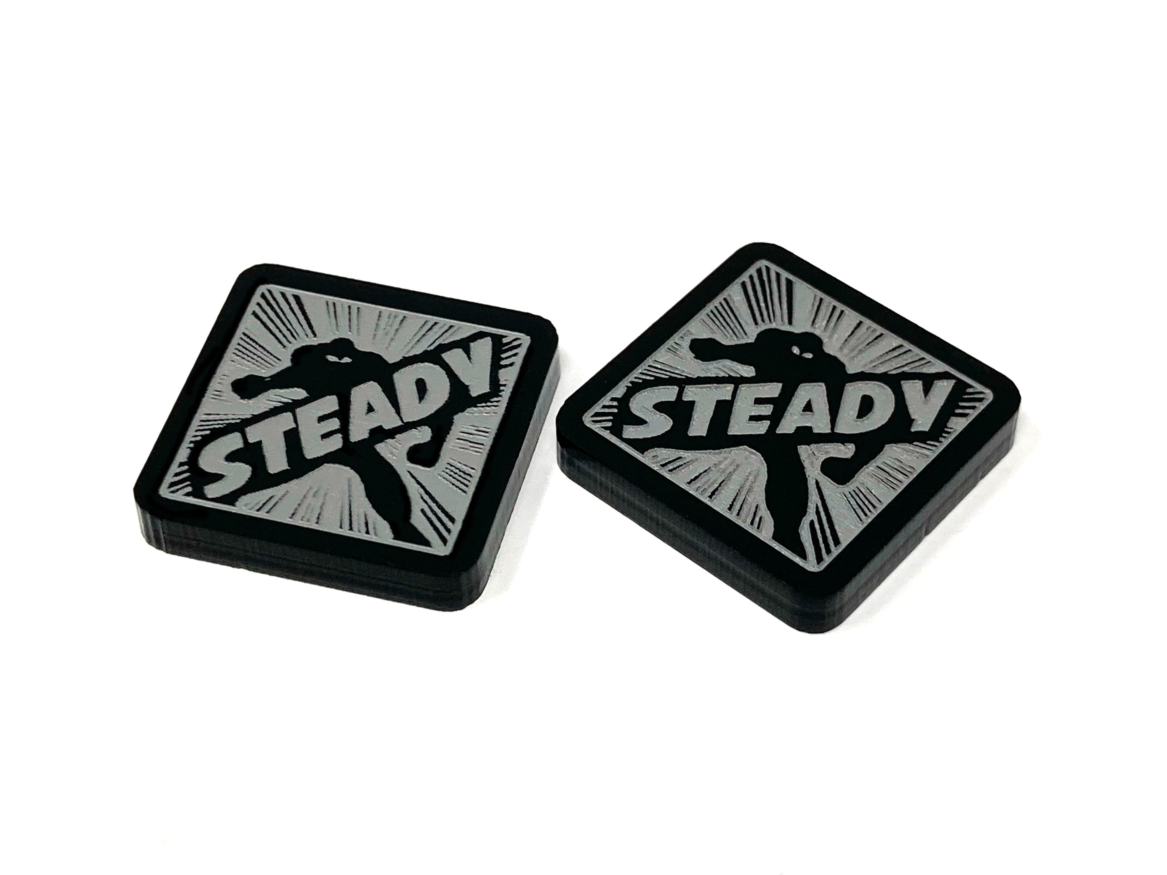 - 2 x Steady Condition Tokens, double sided, etched and cut from opaque black acrylic, painted grey on both sides, and measuring 18mm x 18mm