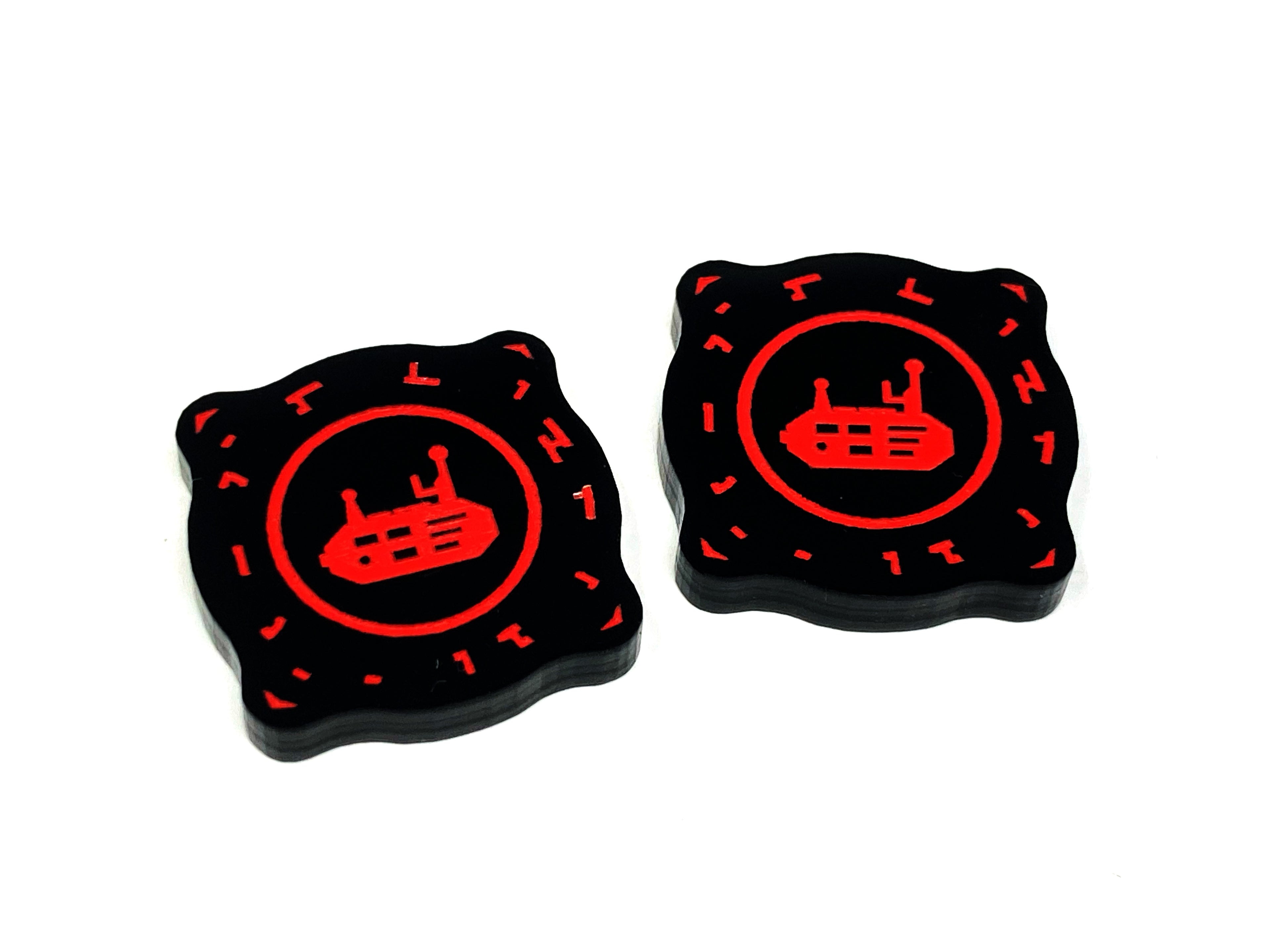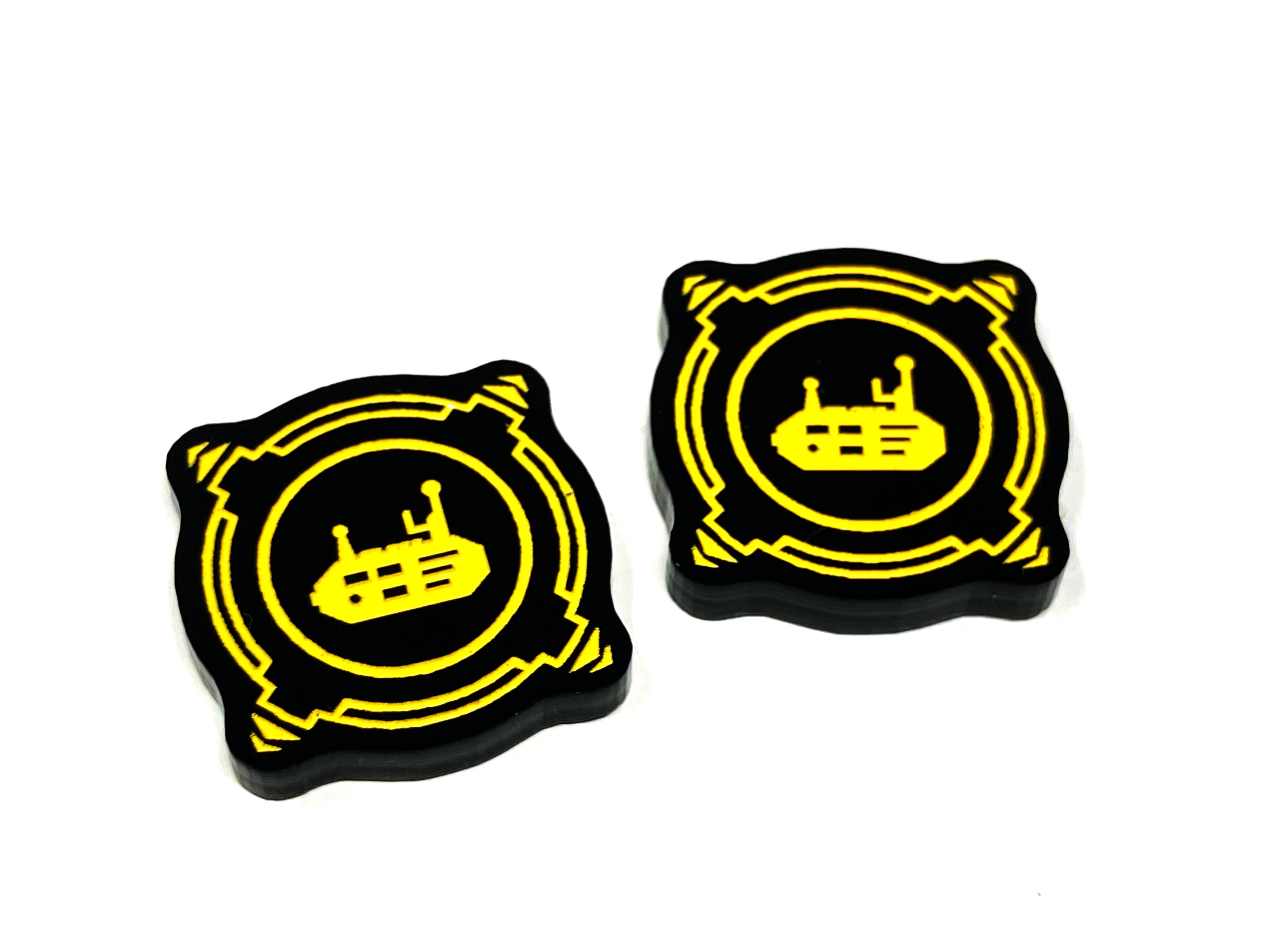 - 2 x Tech Charge tokens, laser etched and cut from opaque black acrylic and painted yellow on one side and painted red on the reverse, measuring 20mm x 20mm.