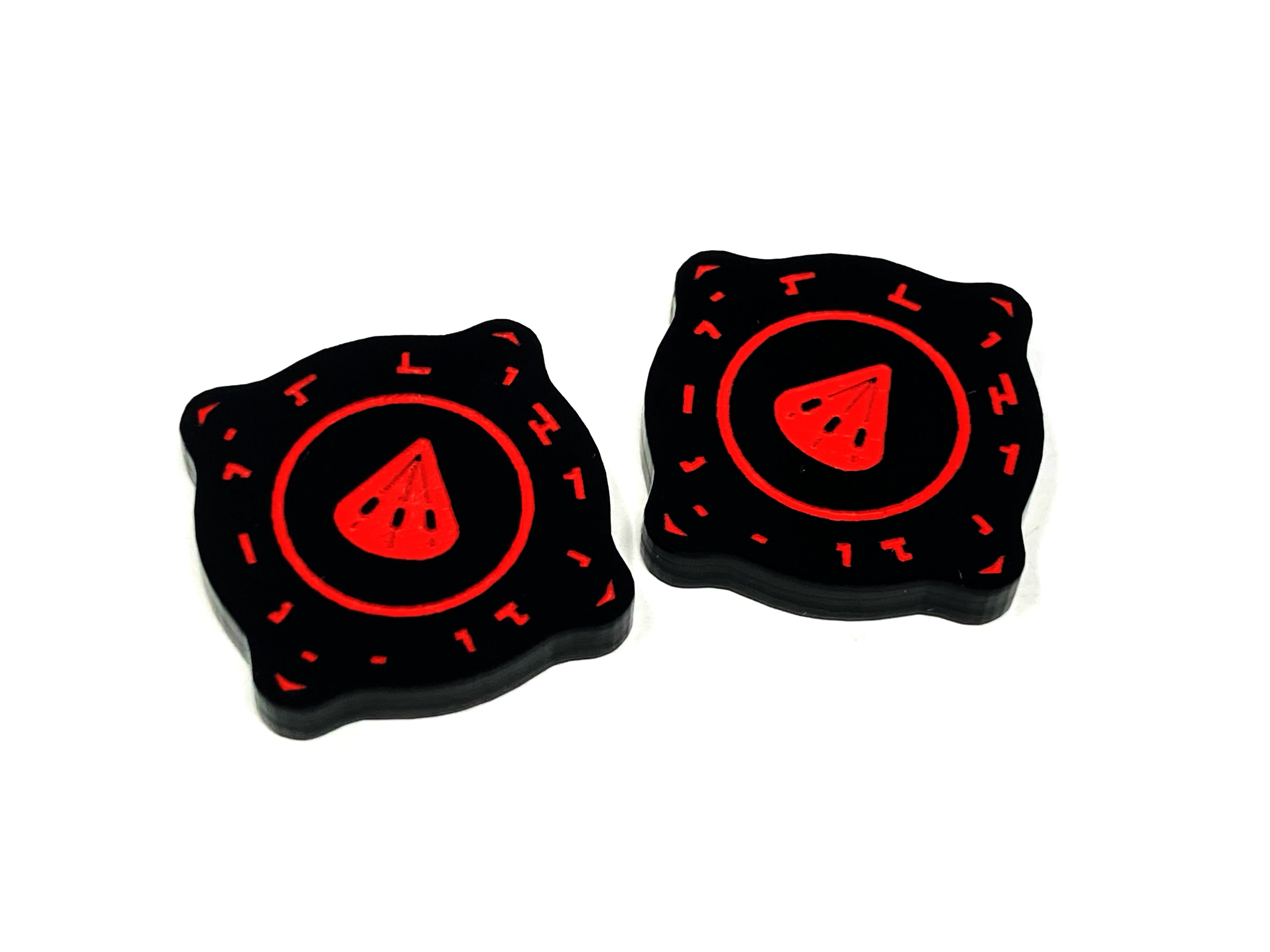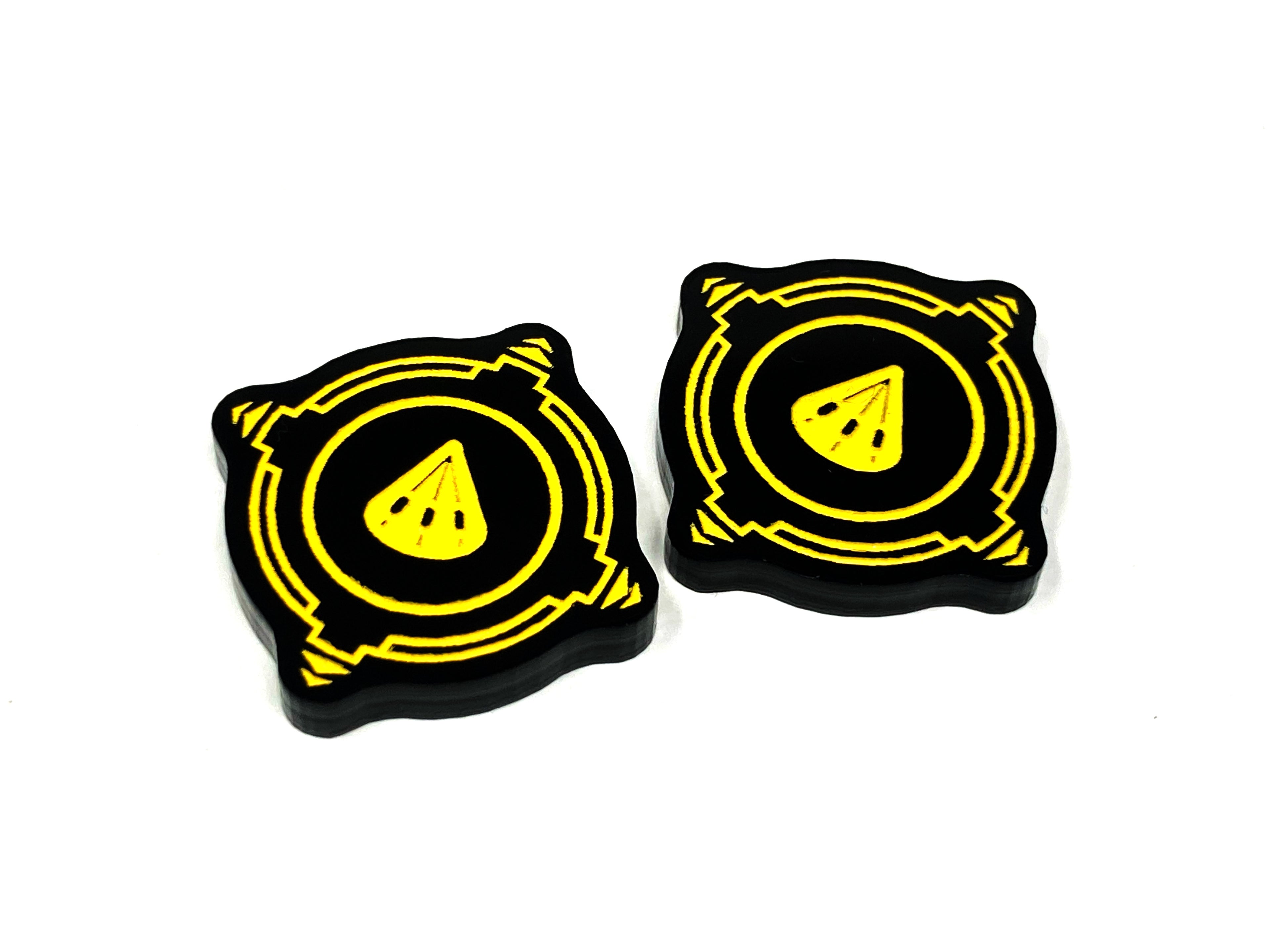 - 2 x Torpedo Charge tokens, laser etched and cut from opaque black acrylic and painted yellow on one side and painted red on the reverse, measuring 20mm x 20mm.