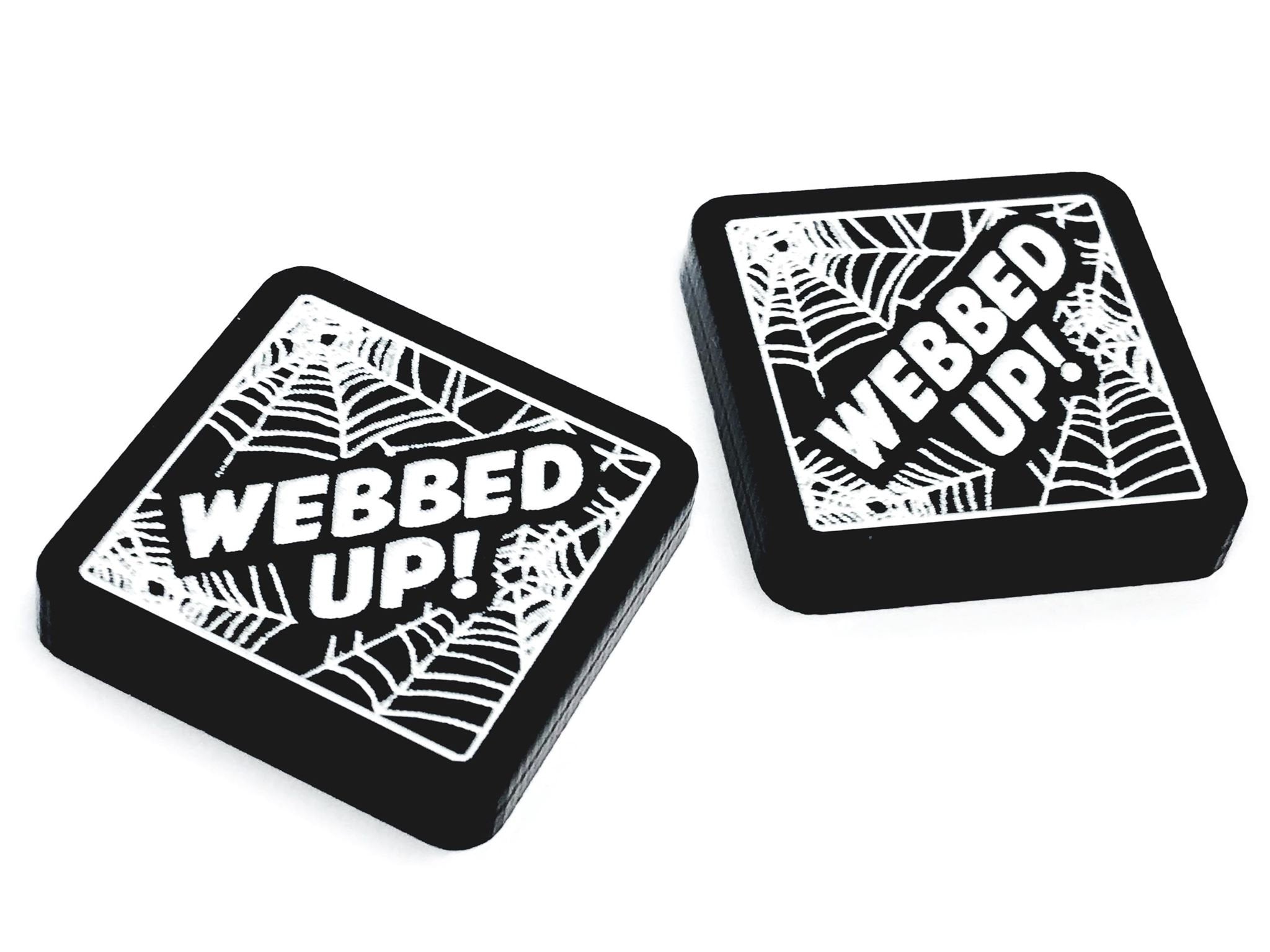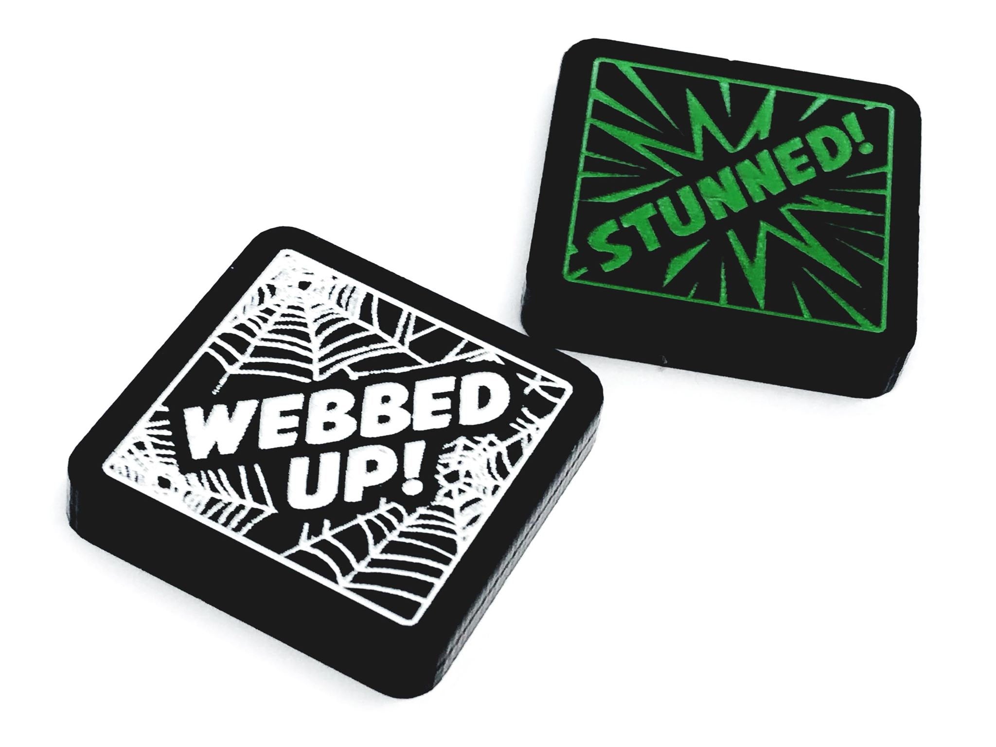 - 2 x Webbed Up /Stunned Tokens, double sided, etched and cut from opaque black acrylic, painted white showing a Webbed-Up image on one side, and painted dark green 'Stunned' on the other side, measuring 18mm x 18mm