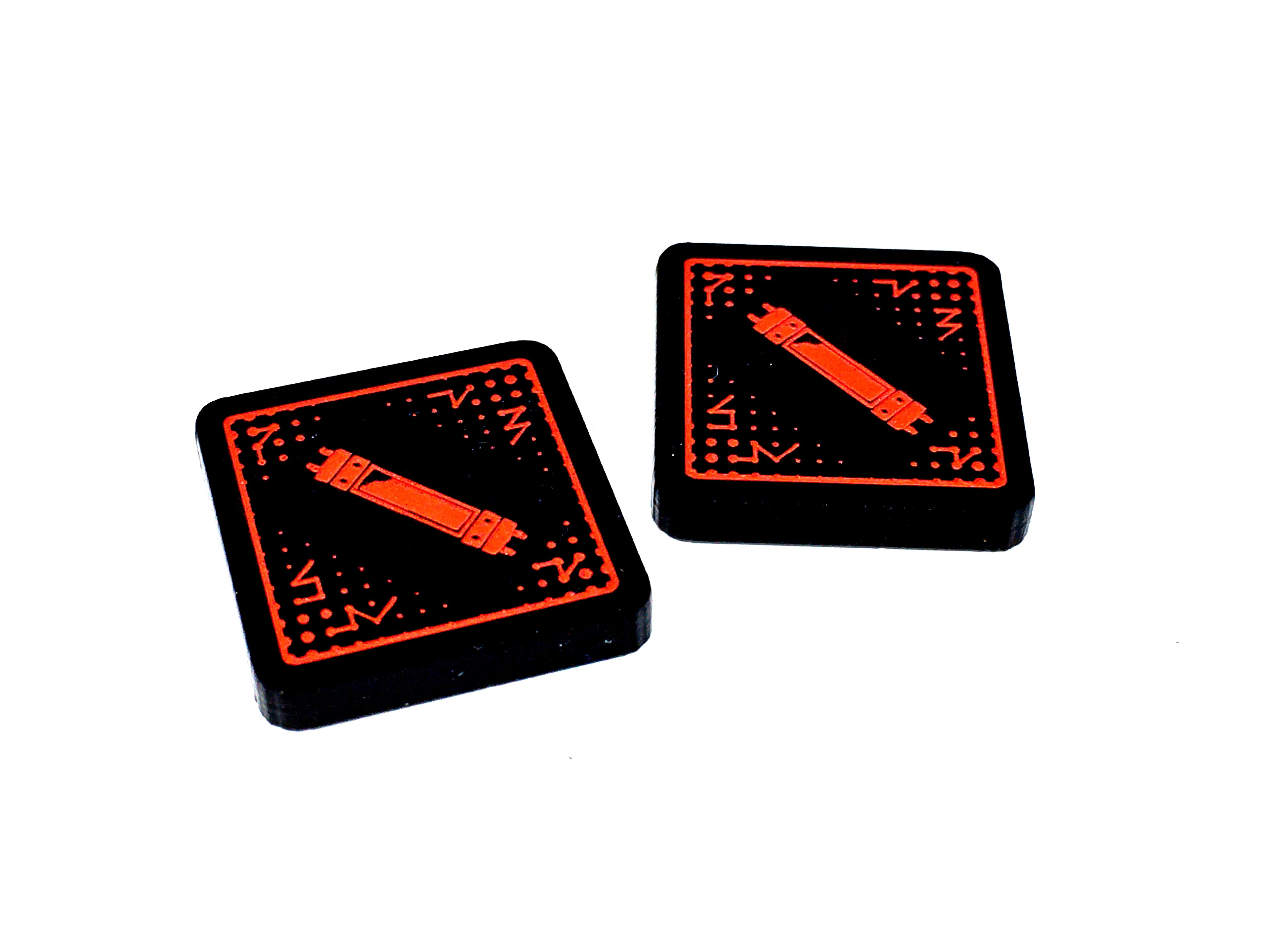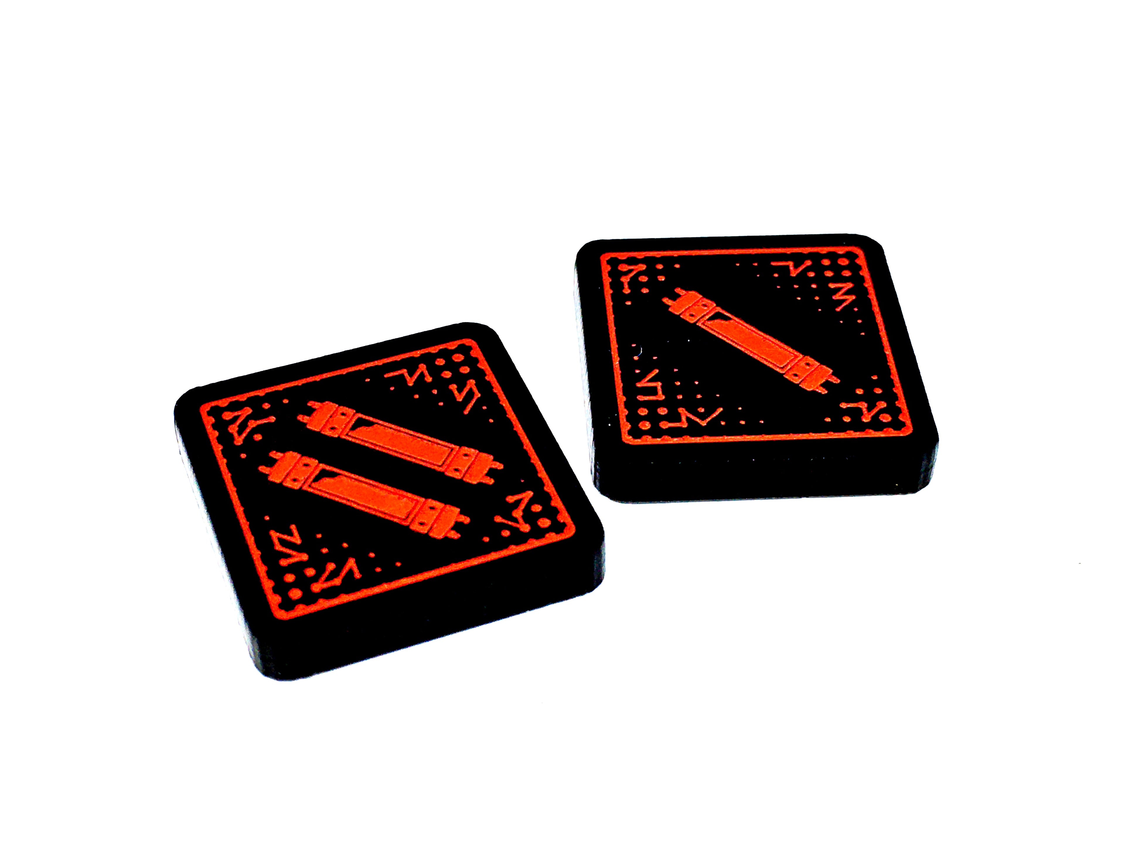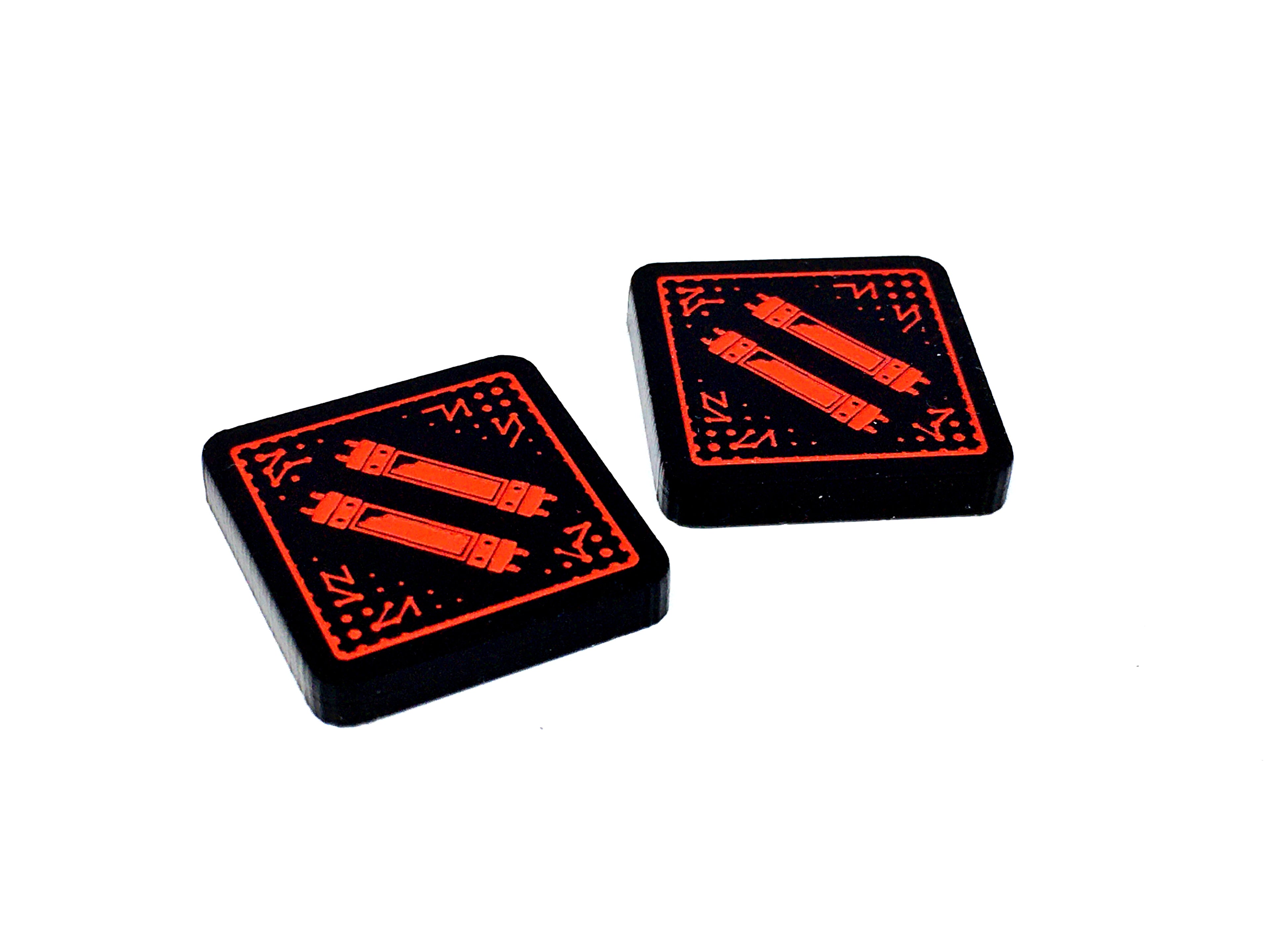 - 2 x Pym Tokens, double sided with a single one 'Pym' design on the one side and a two 'Pym' design on the reverse side, etched and cut from opaque black acrylic, painted red on both sides, and measuring 18mm x 18mm