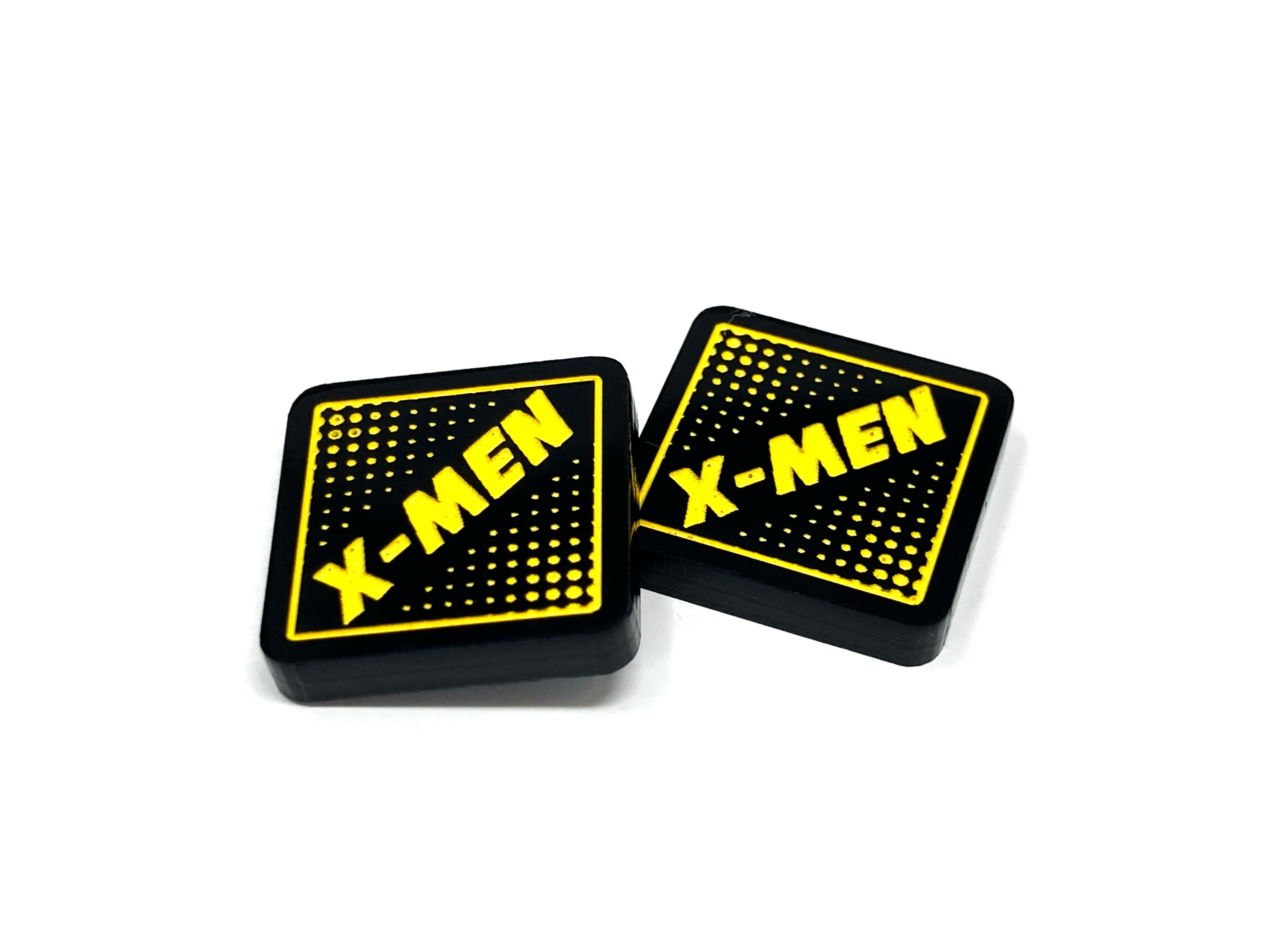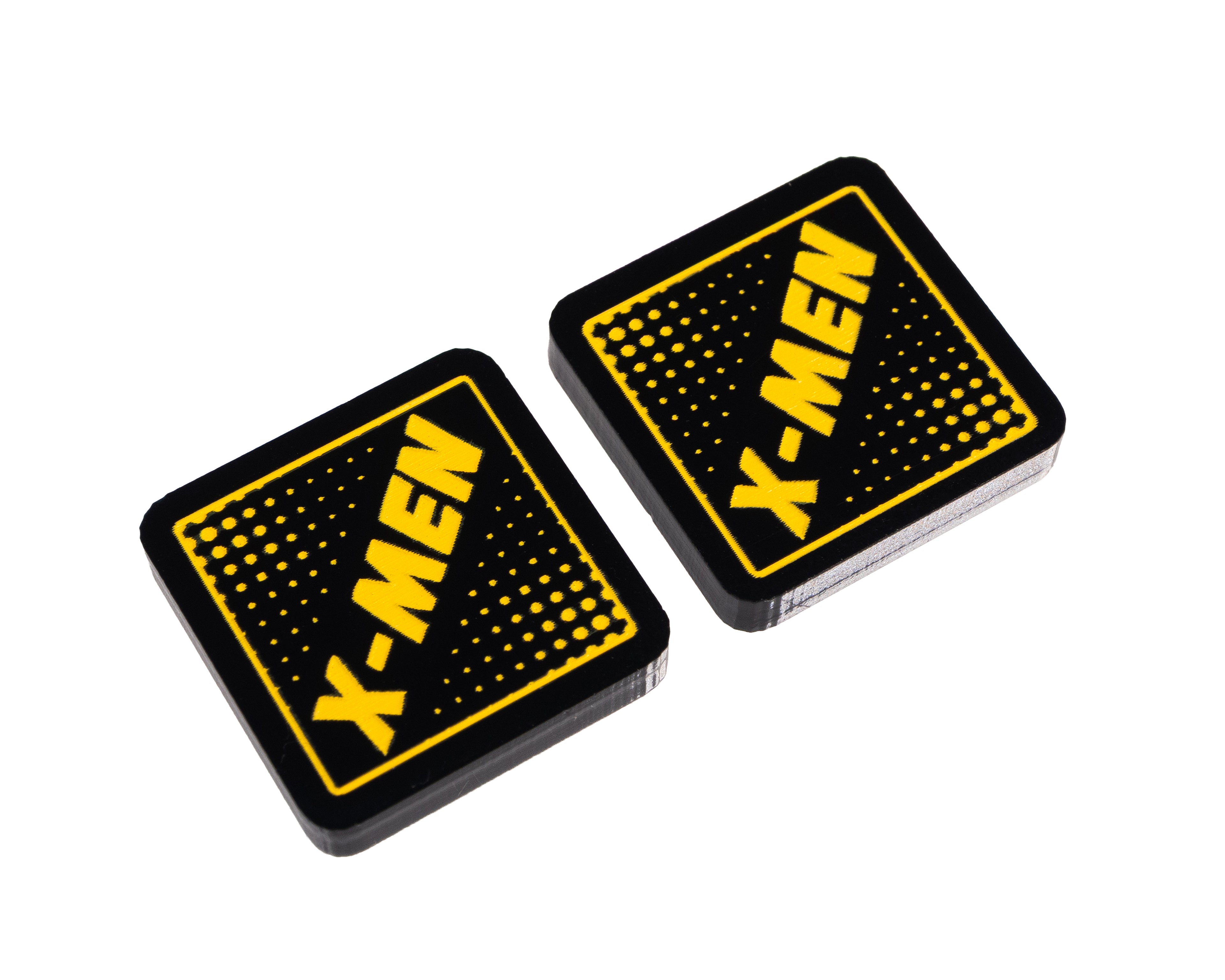 - 2 x X-Men Trait Tokens, double sided, etched and cut from opaque black acrylic and painted yellow on both sides. Measuring 18mm x 18mm