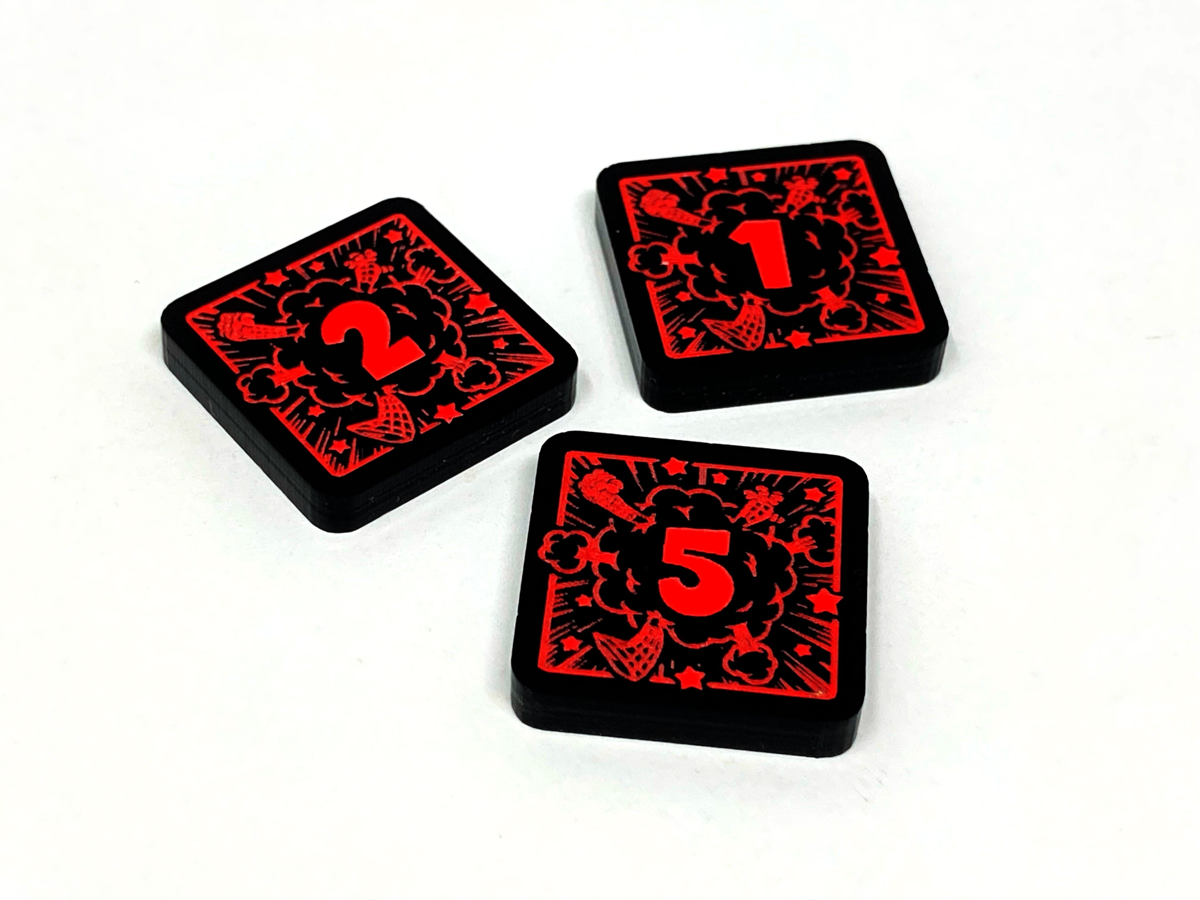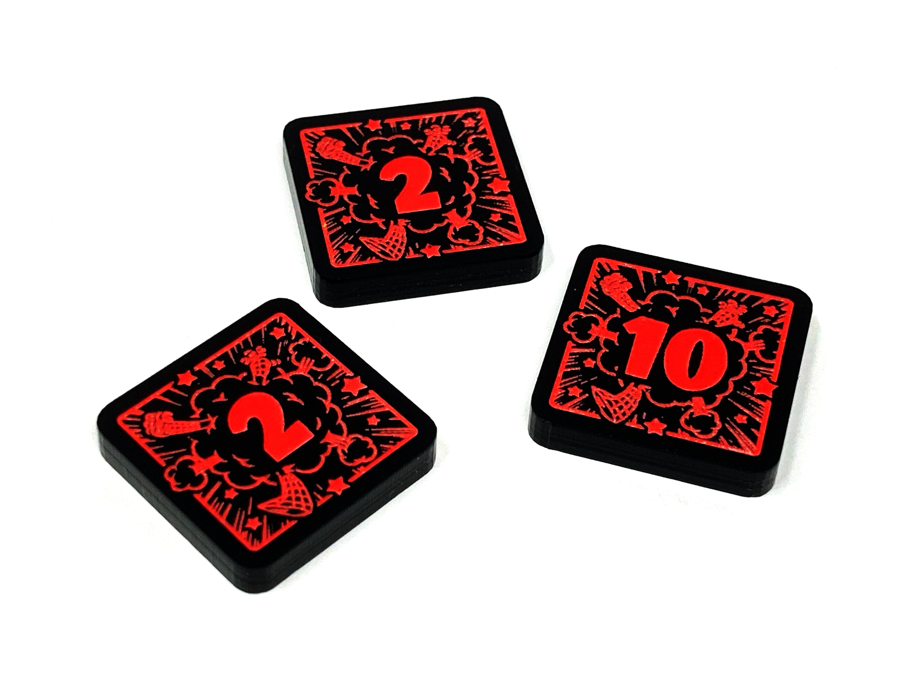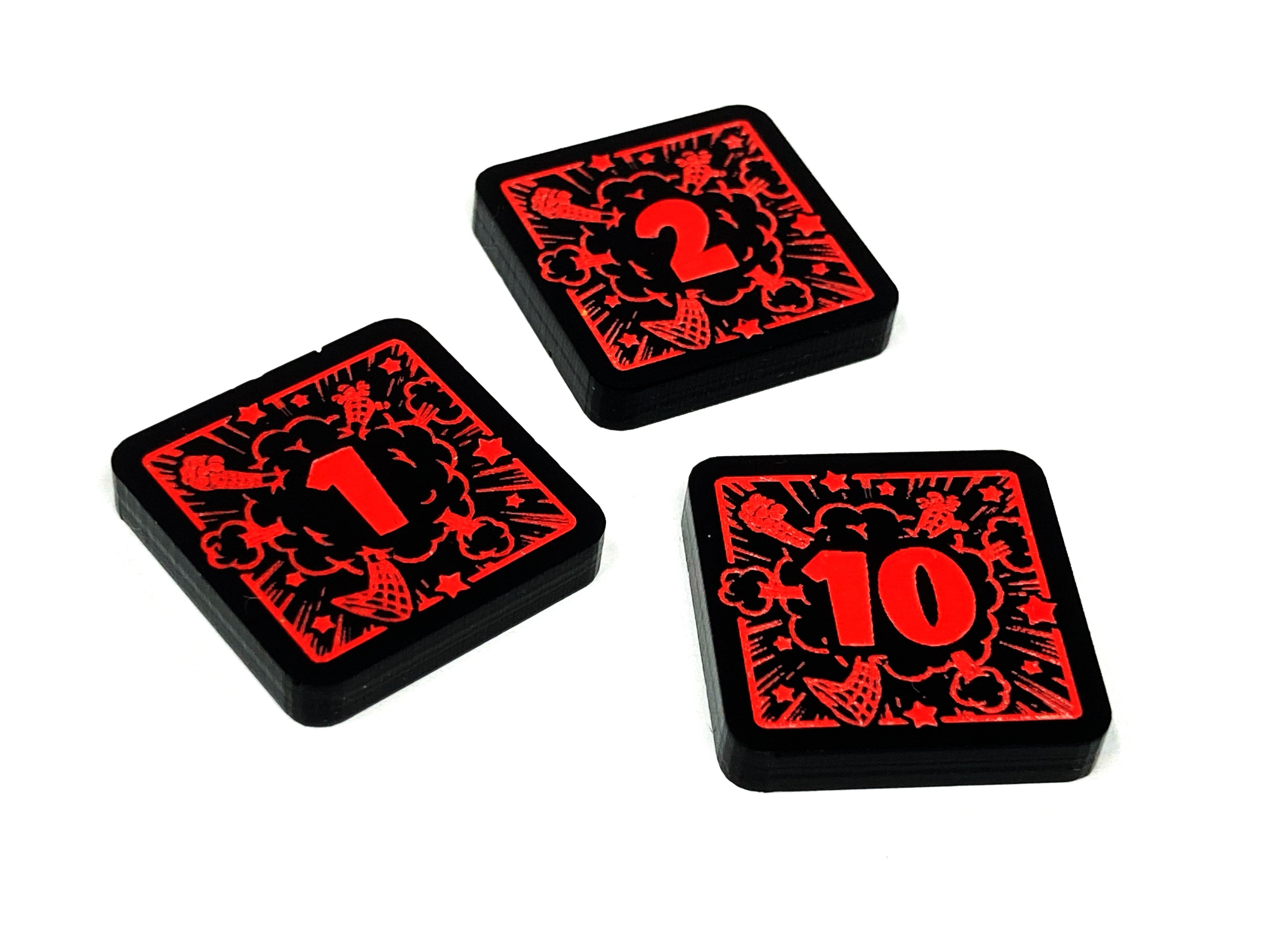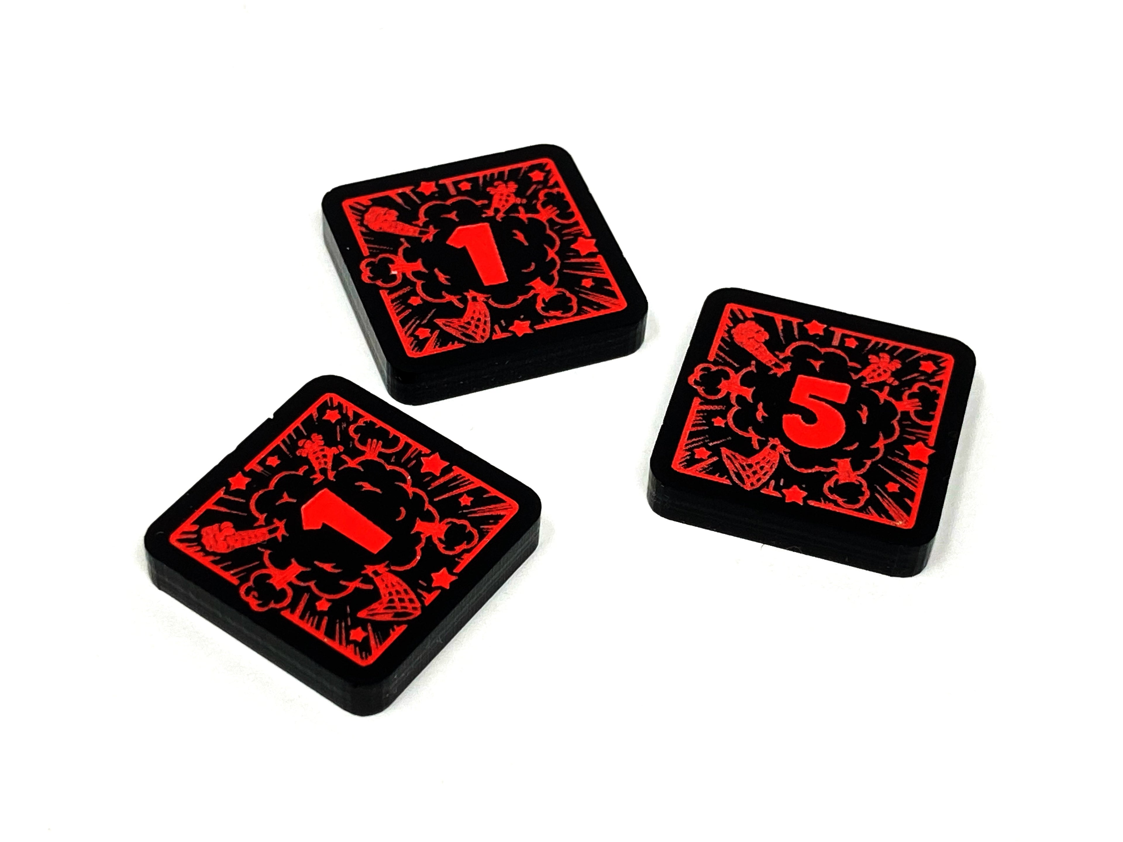 - 3 x Toon Tokens (2 x 1/2 denominations and 1 x 5/10 denominations), double sided, etched and cut from opaque black acrylic, painted fluorescent red and measuring 18mm x 18mm