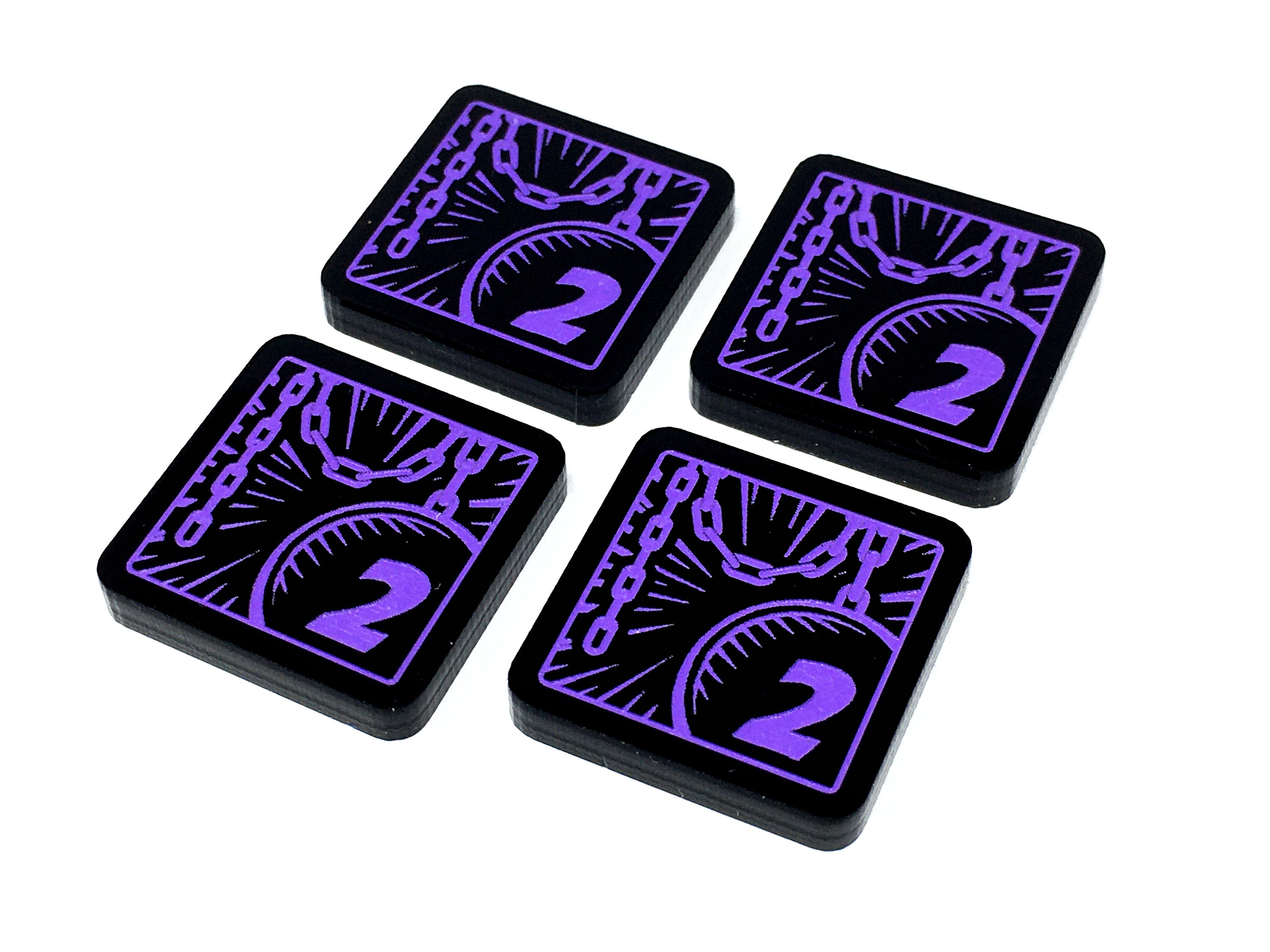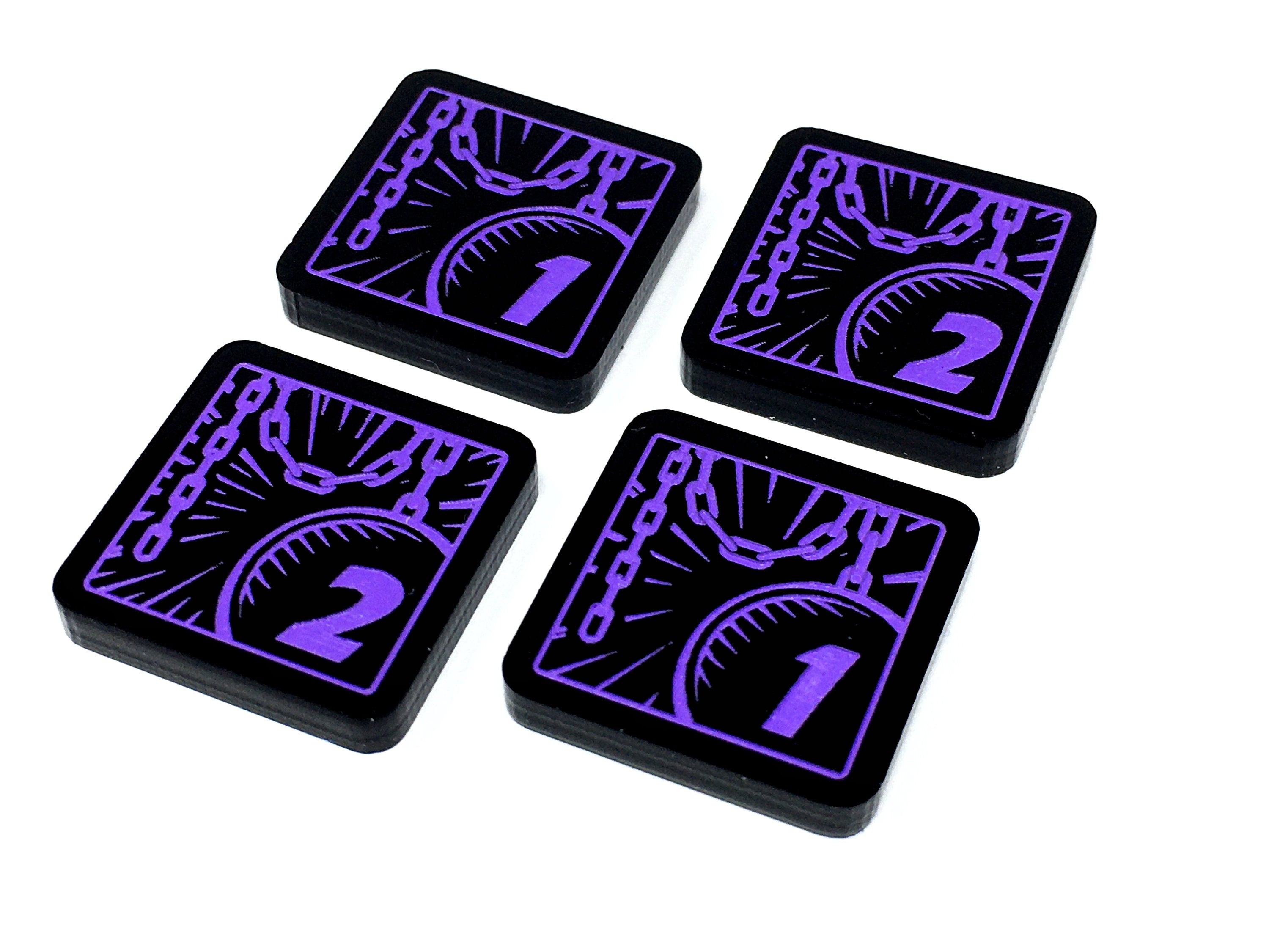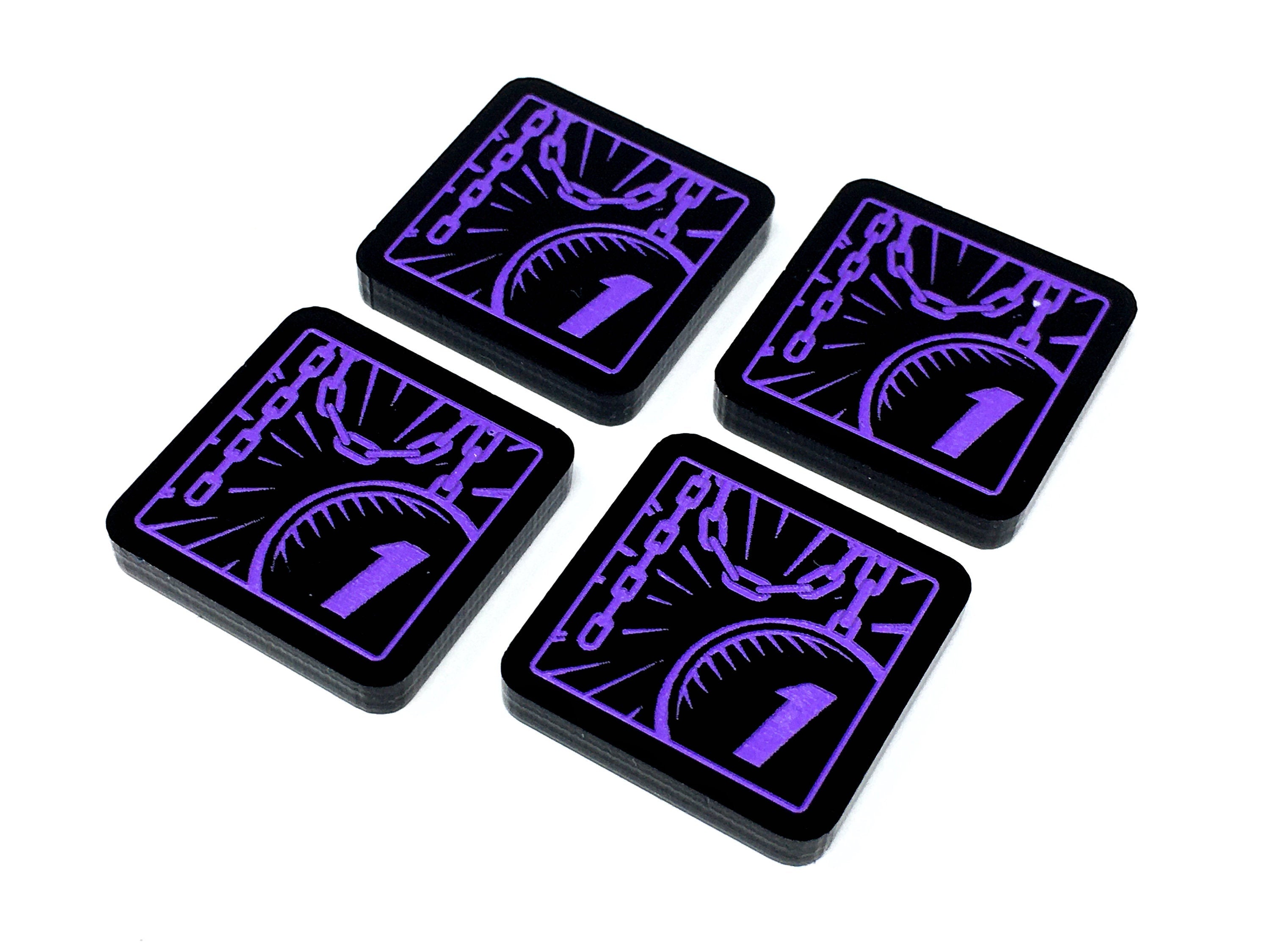 - 4 x Absorbing Man Delay Tokens, double sided 1/2 reversible, etched onto black acrylic and painted purple, measuring 18mm x 18mm