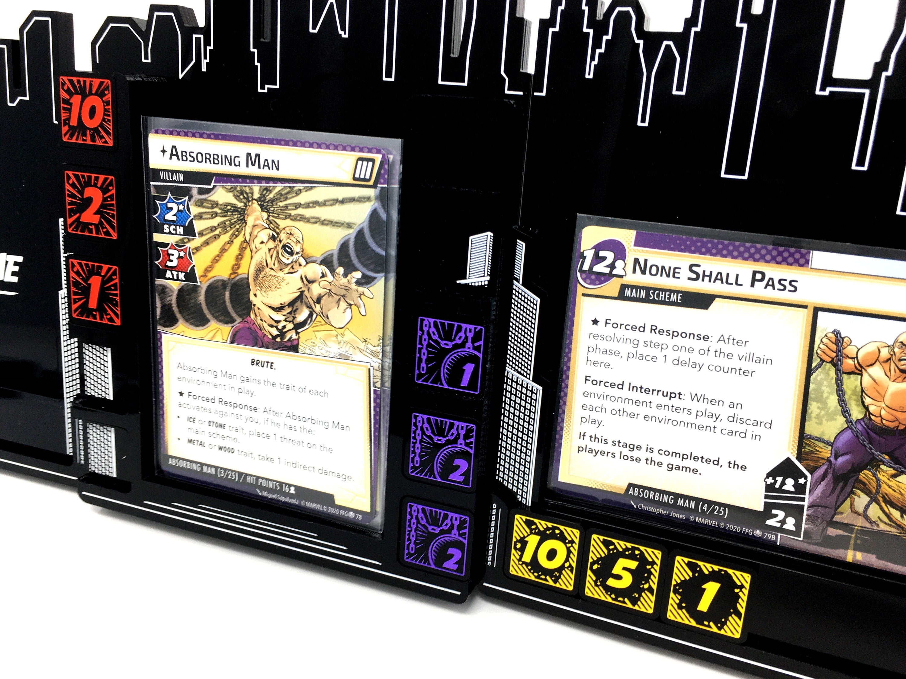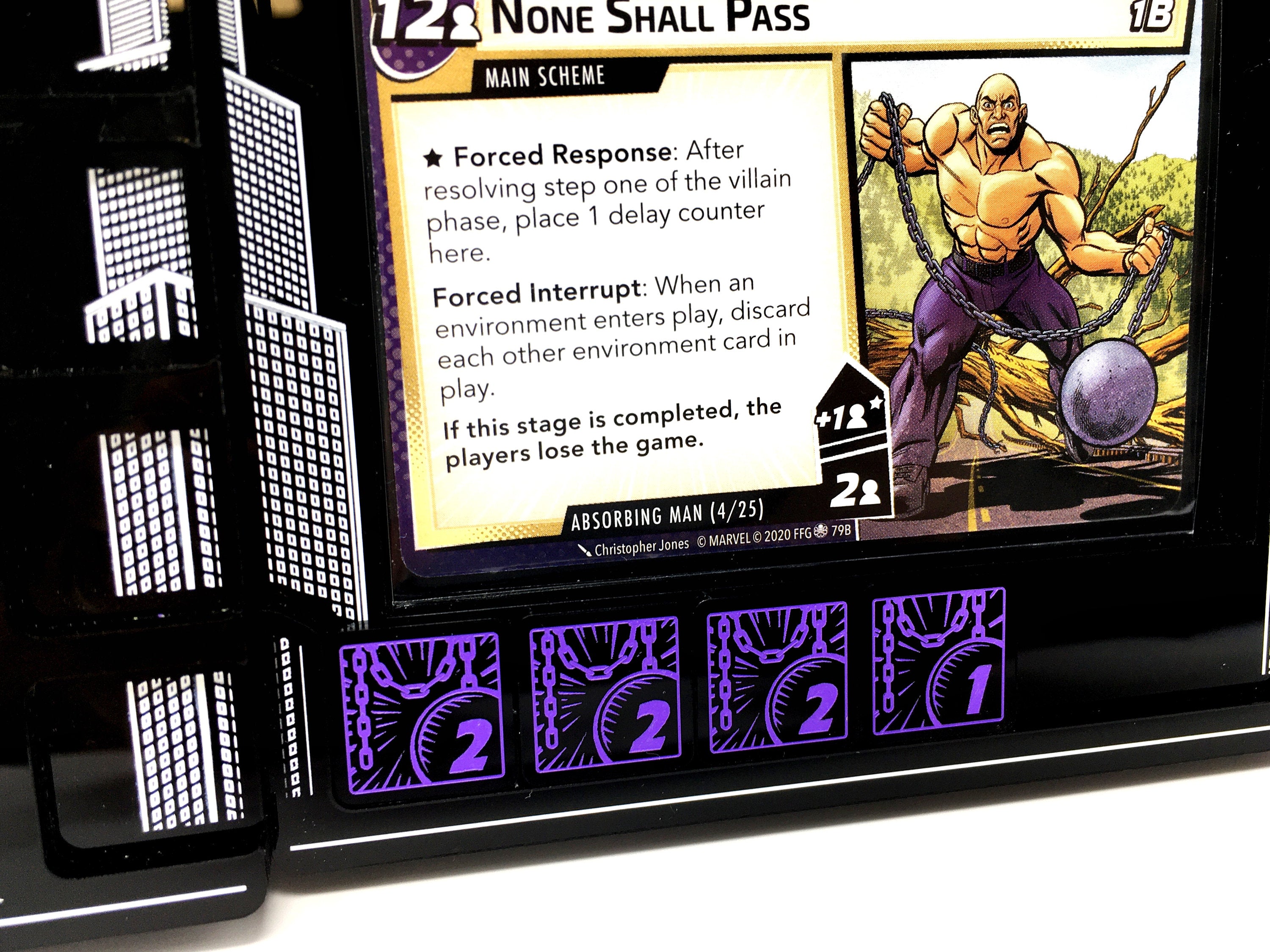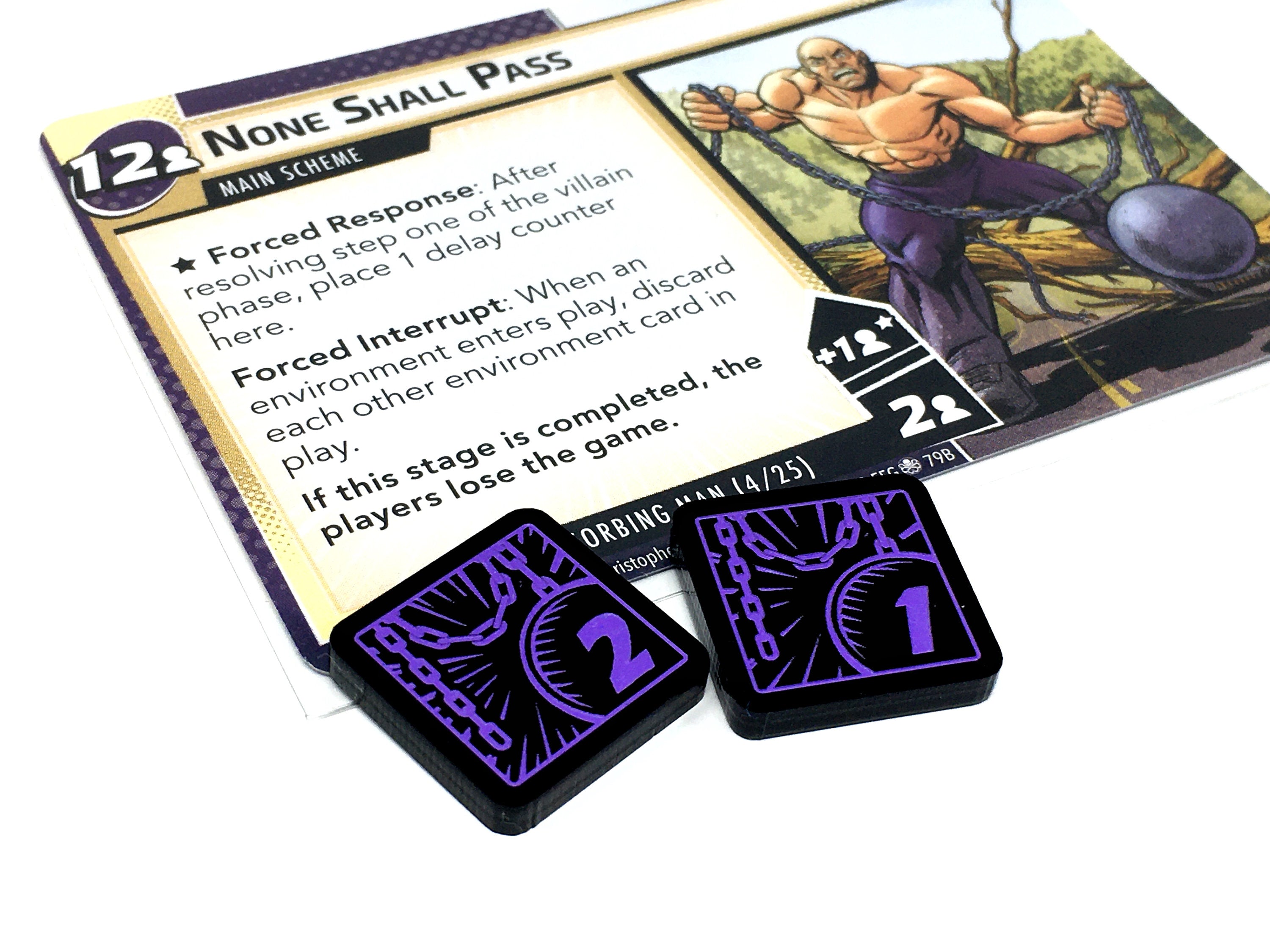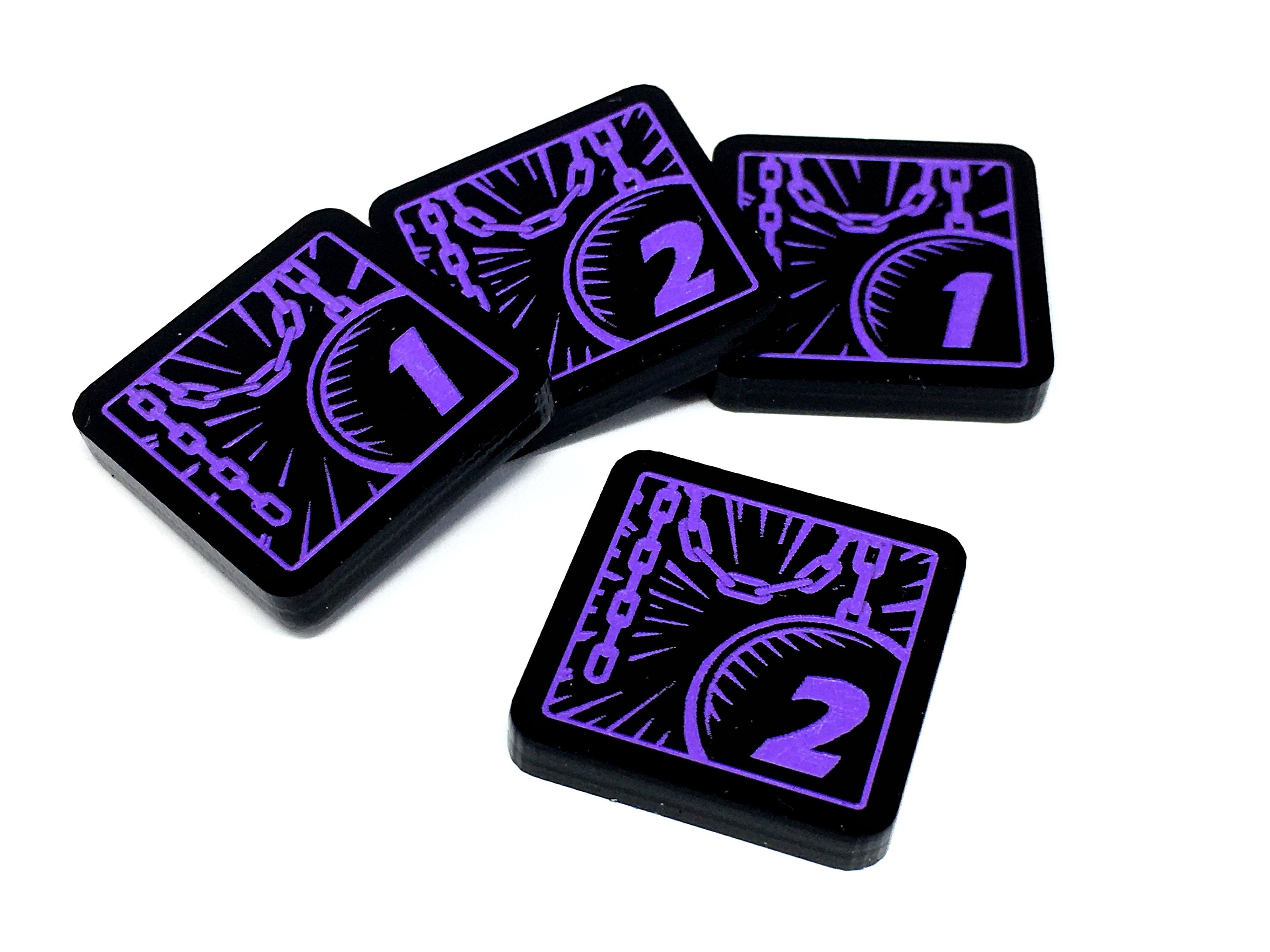 - 4 x Absorbing Man Delay Tokens, double sided 1/2 reversible, etched onto black acrylic and painted purple, measuring 18mm x 18mm
