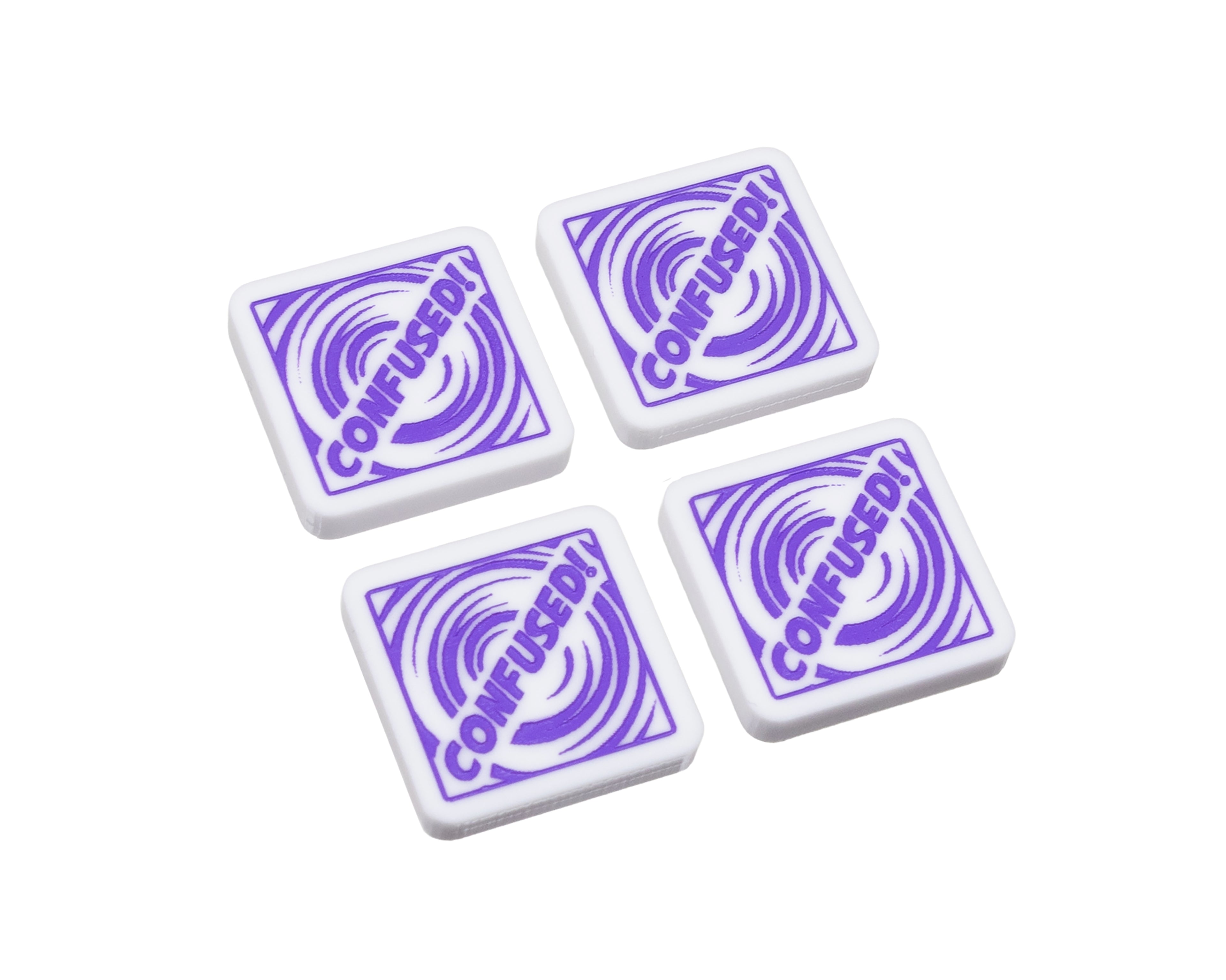 - 4 x Confused status tokens, double sided, measuring 18mm x 18mm