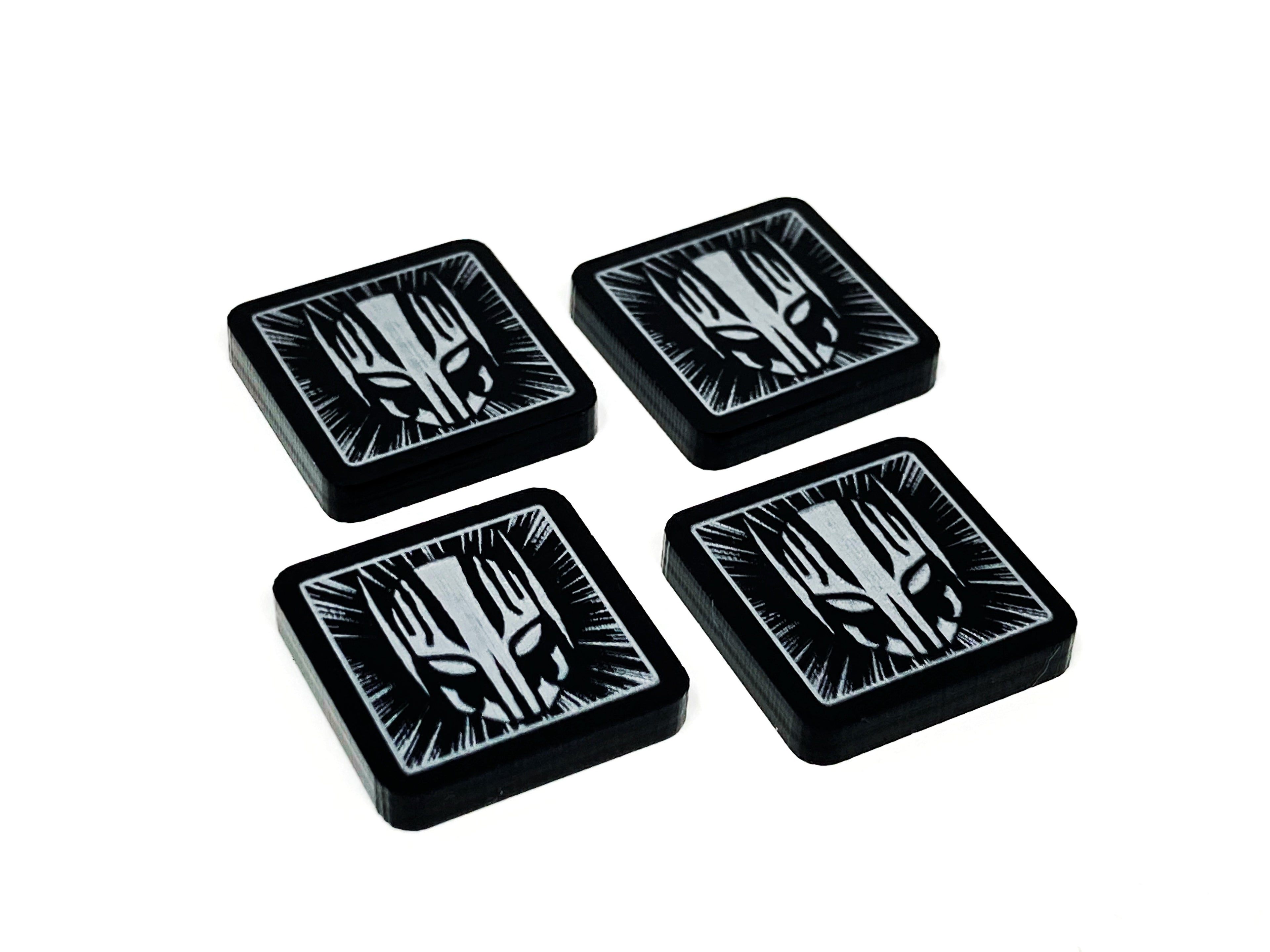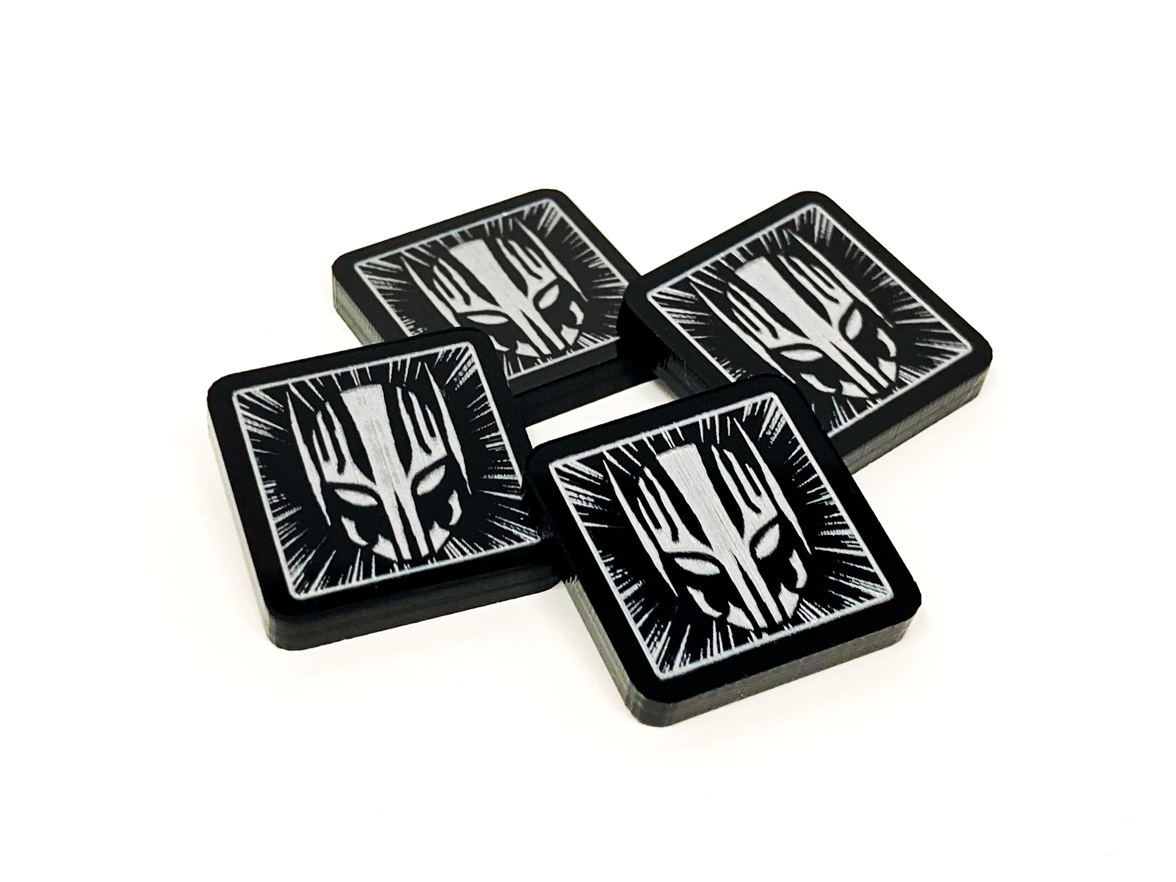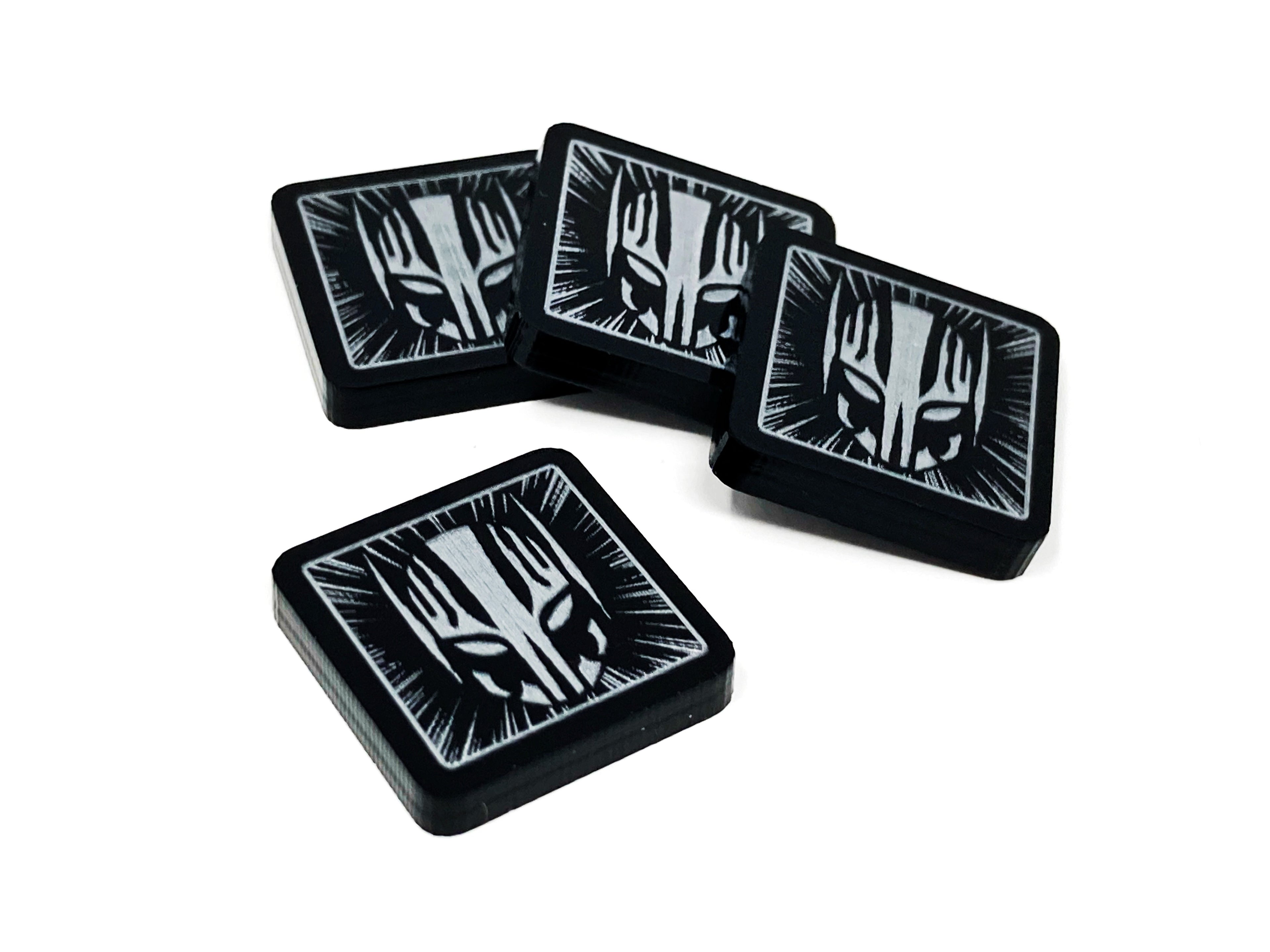 - 4 x Black acrylic double sided Drone tokens, painted Silver on both faces and measuring 18mm x 18mm