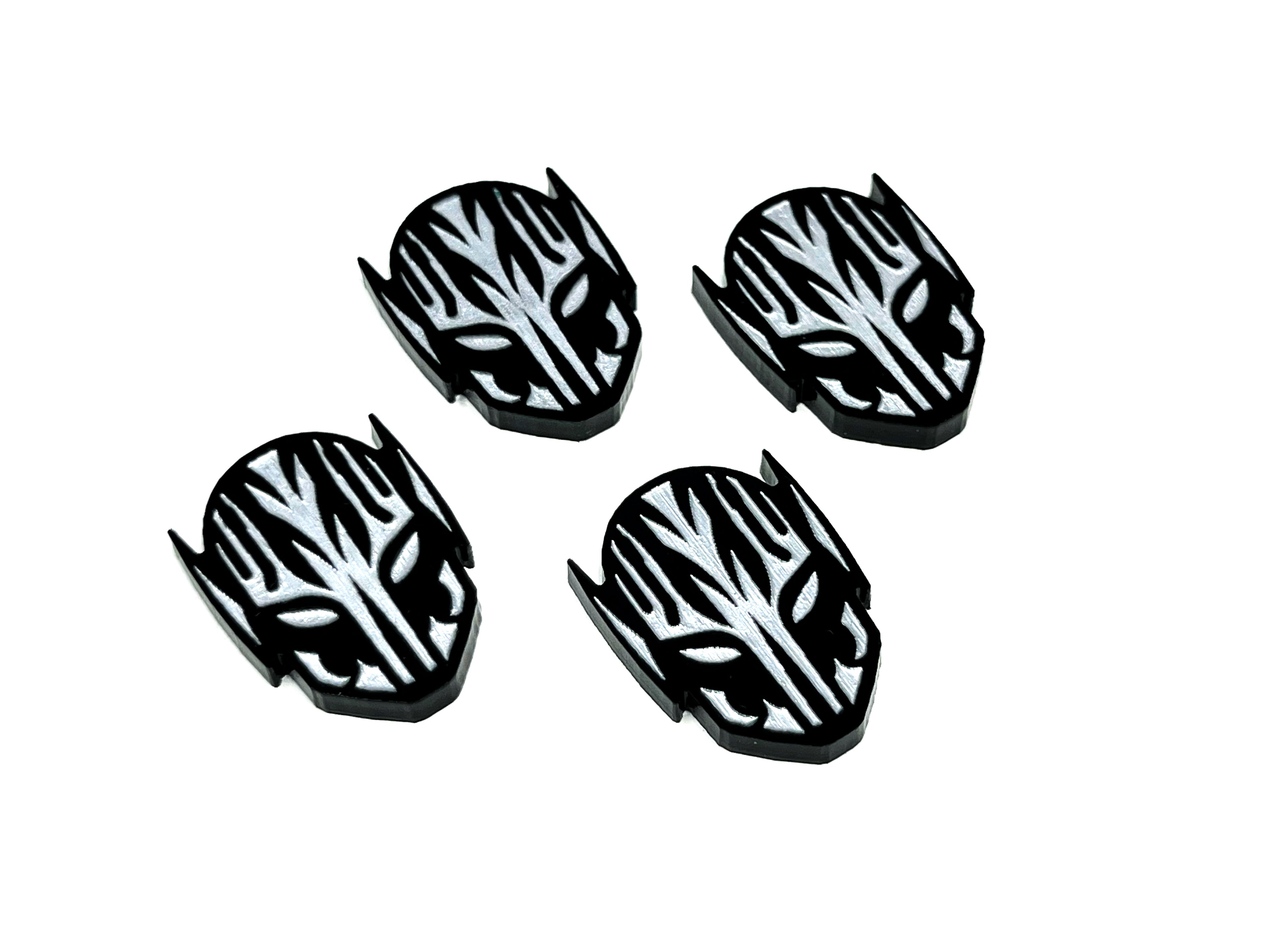 - 4 x Ultron Drone tokens, etched onto black acrylic and painted metallic silver, measuring approximately 18mm x 24mm, larger than our standard tokens so they stand out on player cards