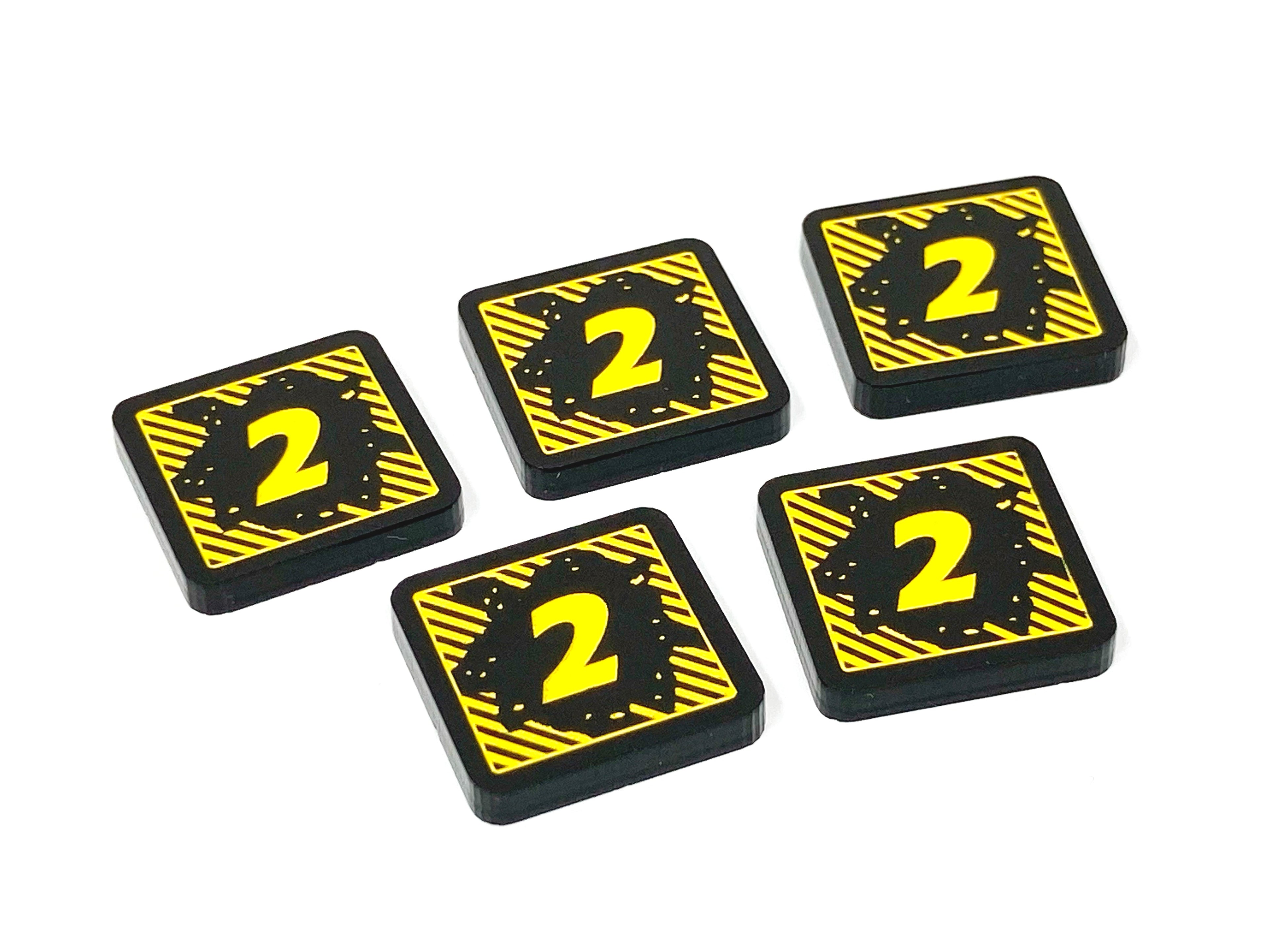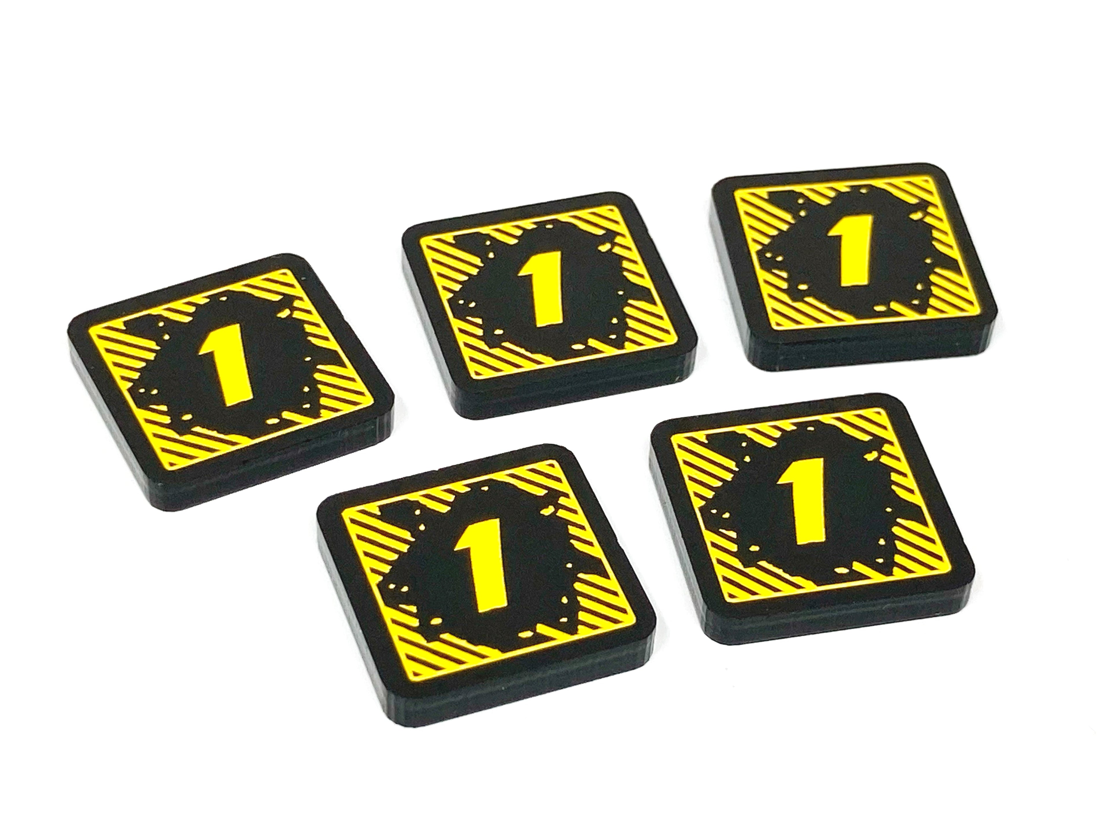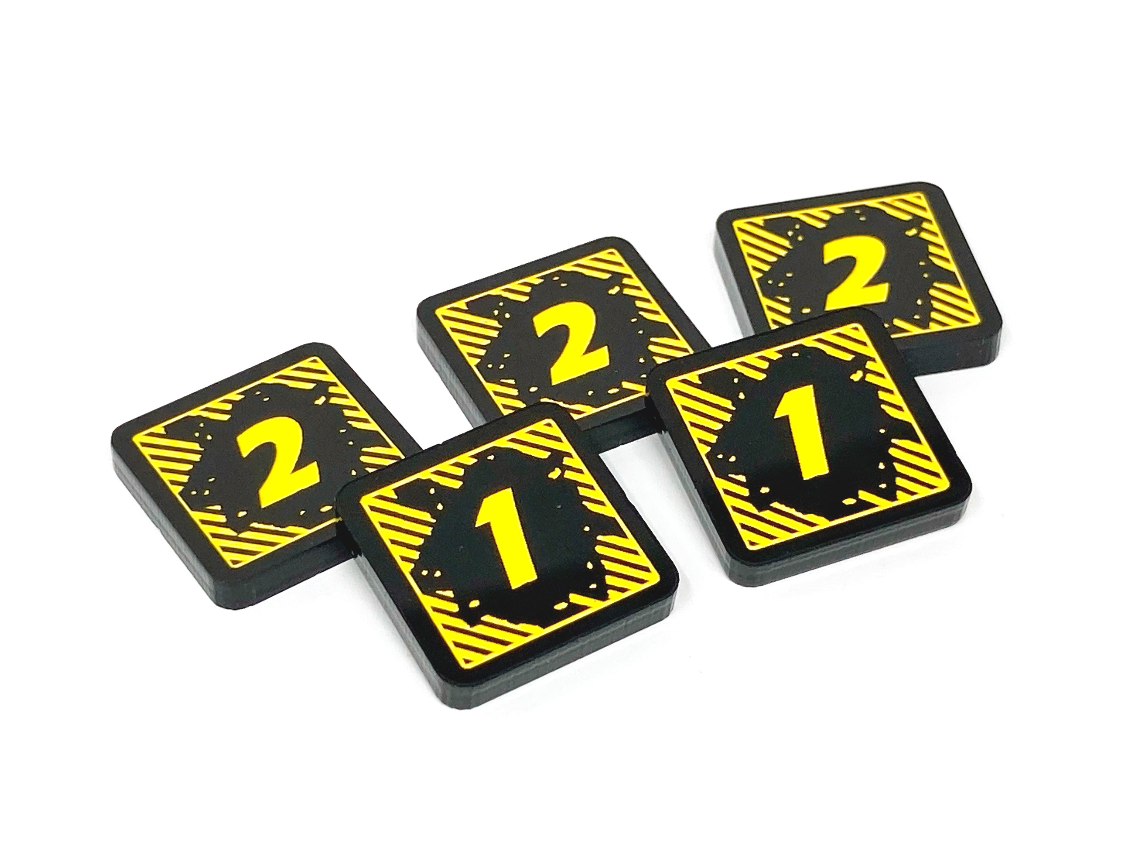 - 5 x Threat tokens 1/2, double sided showing 1 and 2, etched and cut from opaque black acrylic and painted yellow on both sides, measuring 18mm x 18mm
