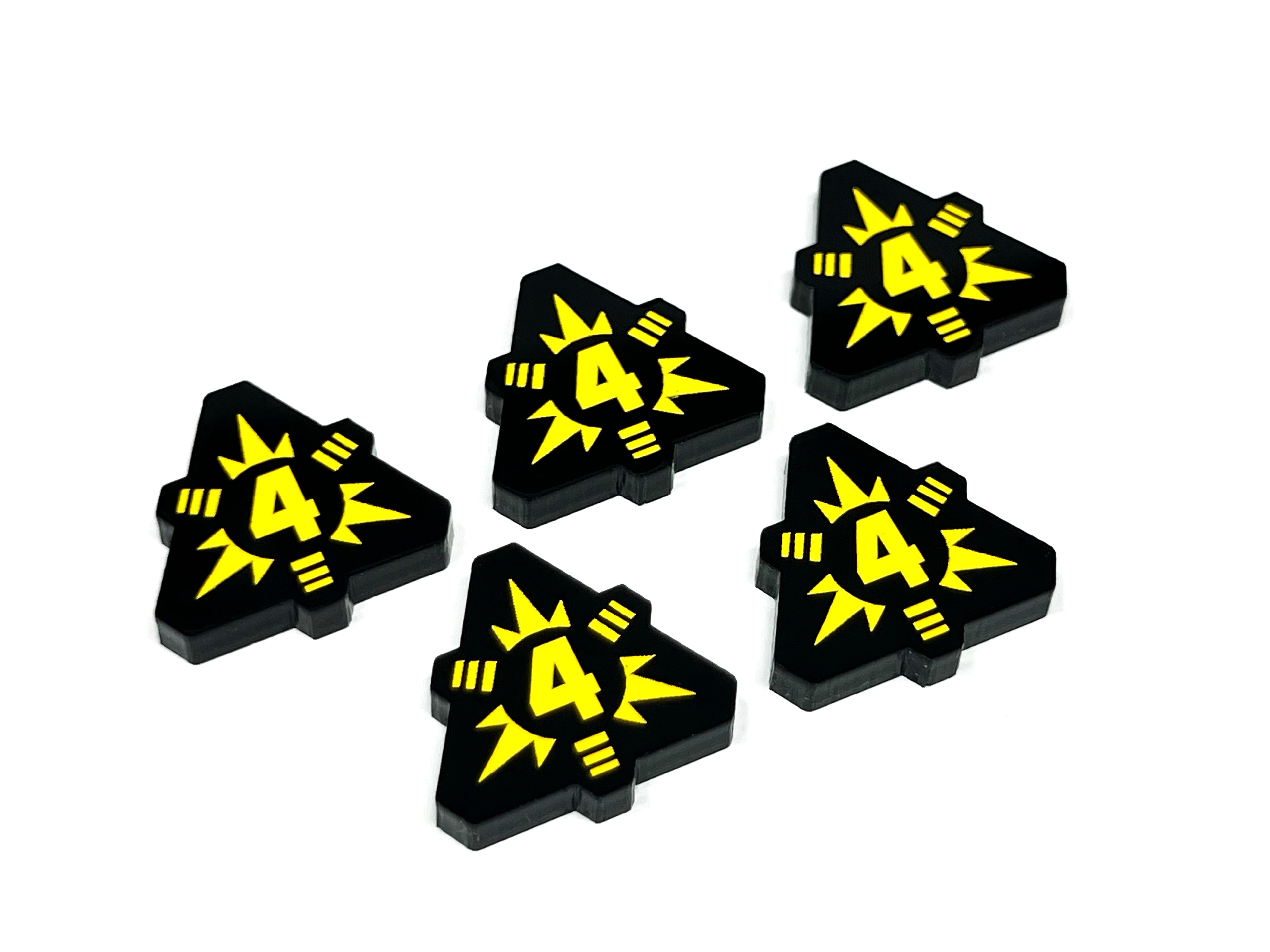 - 5 x suppression tokens (Double sided, solid black acrylic, painted yellow)These tokens are etched with a '3' suppression on one side and '4' suppression on the reverse.