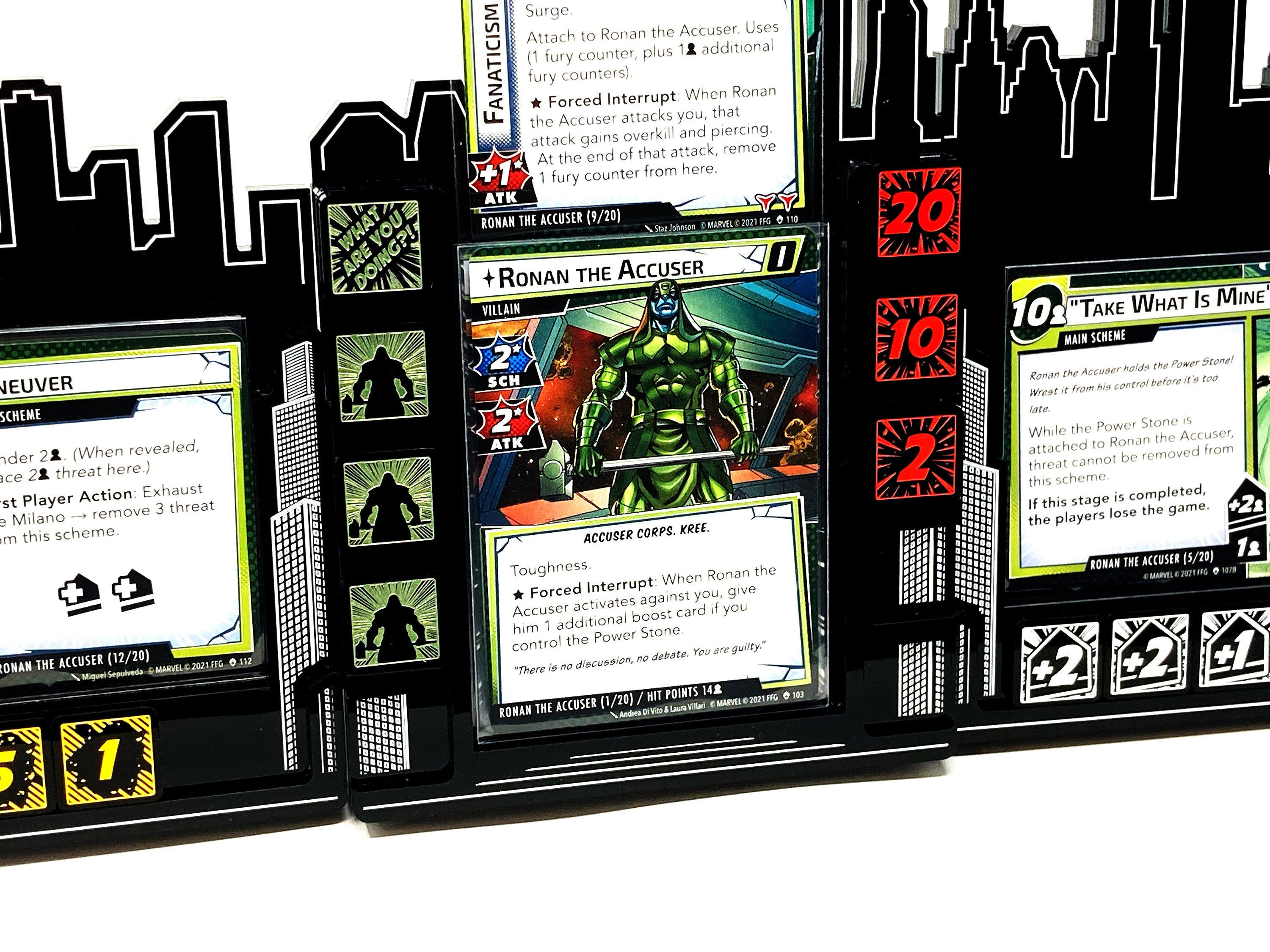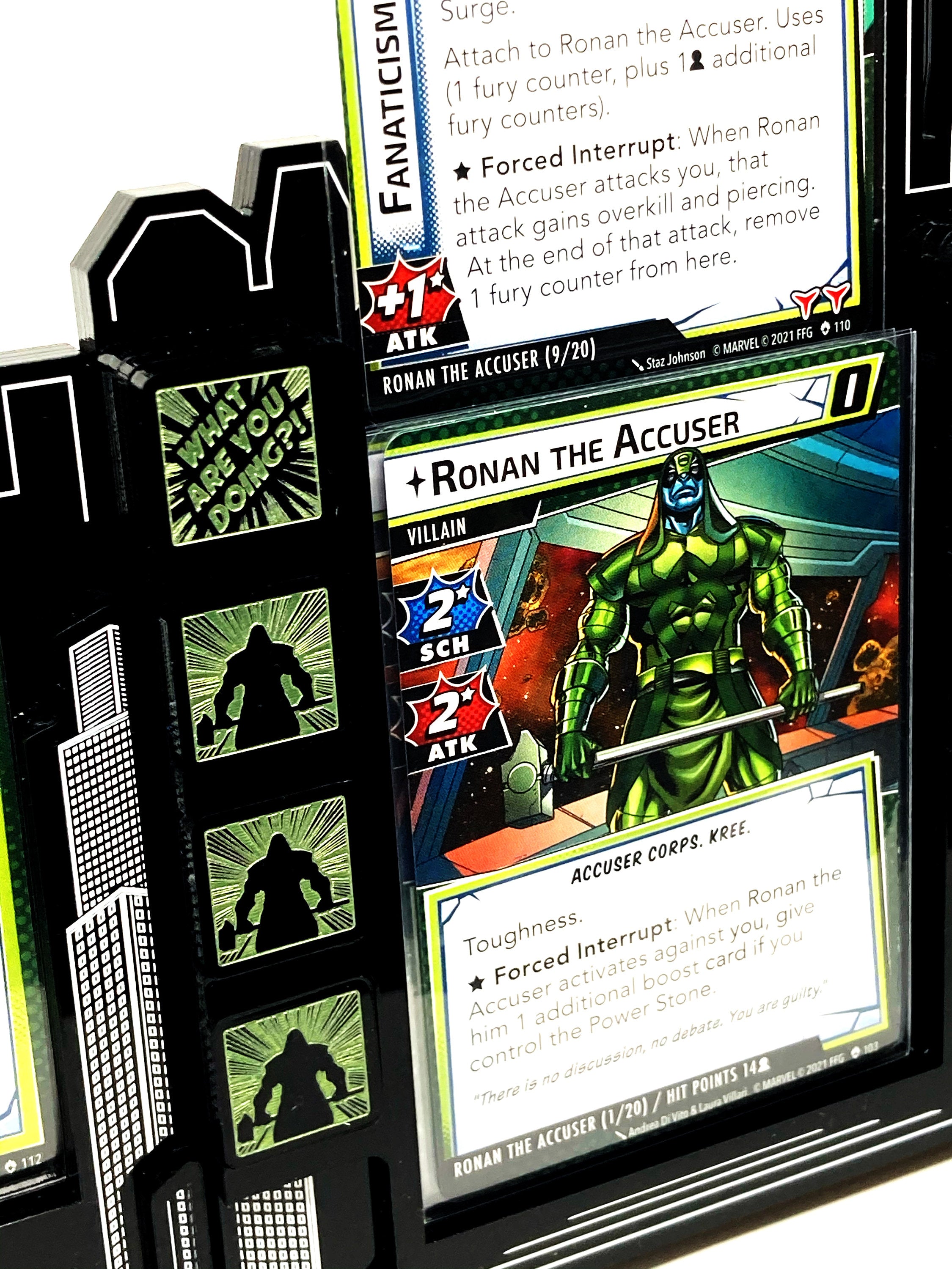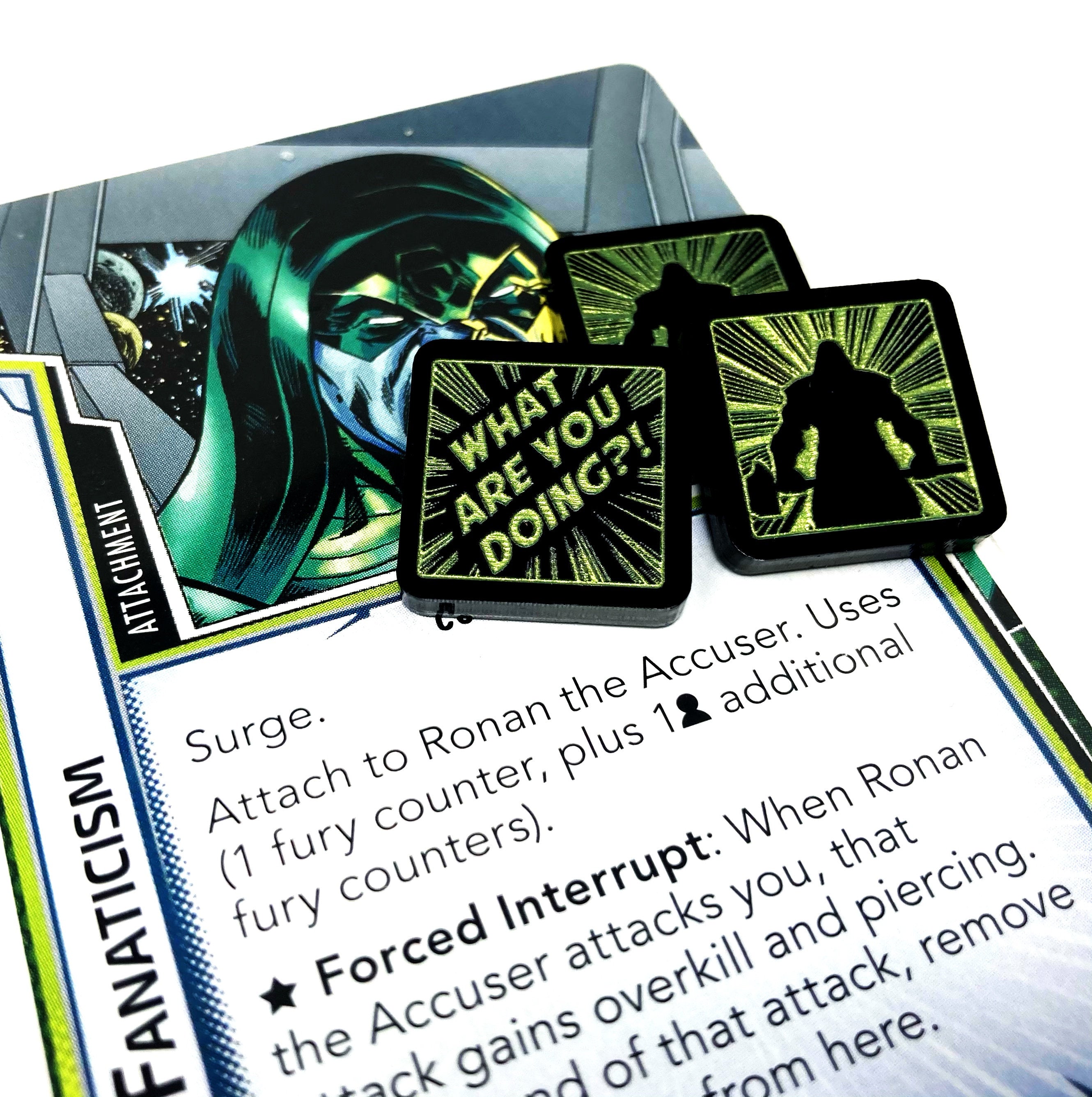 - 5 x Fury tokens, etched onto black acrylic depicting Ronan on one face and a quote on the reverse. Painted metallic green and measuring 18mm x 18mm