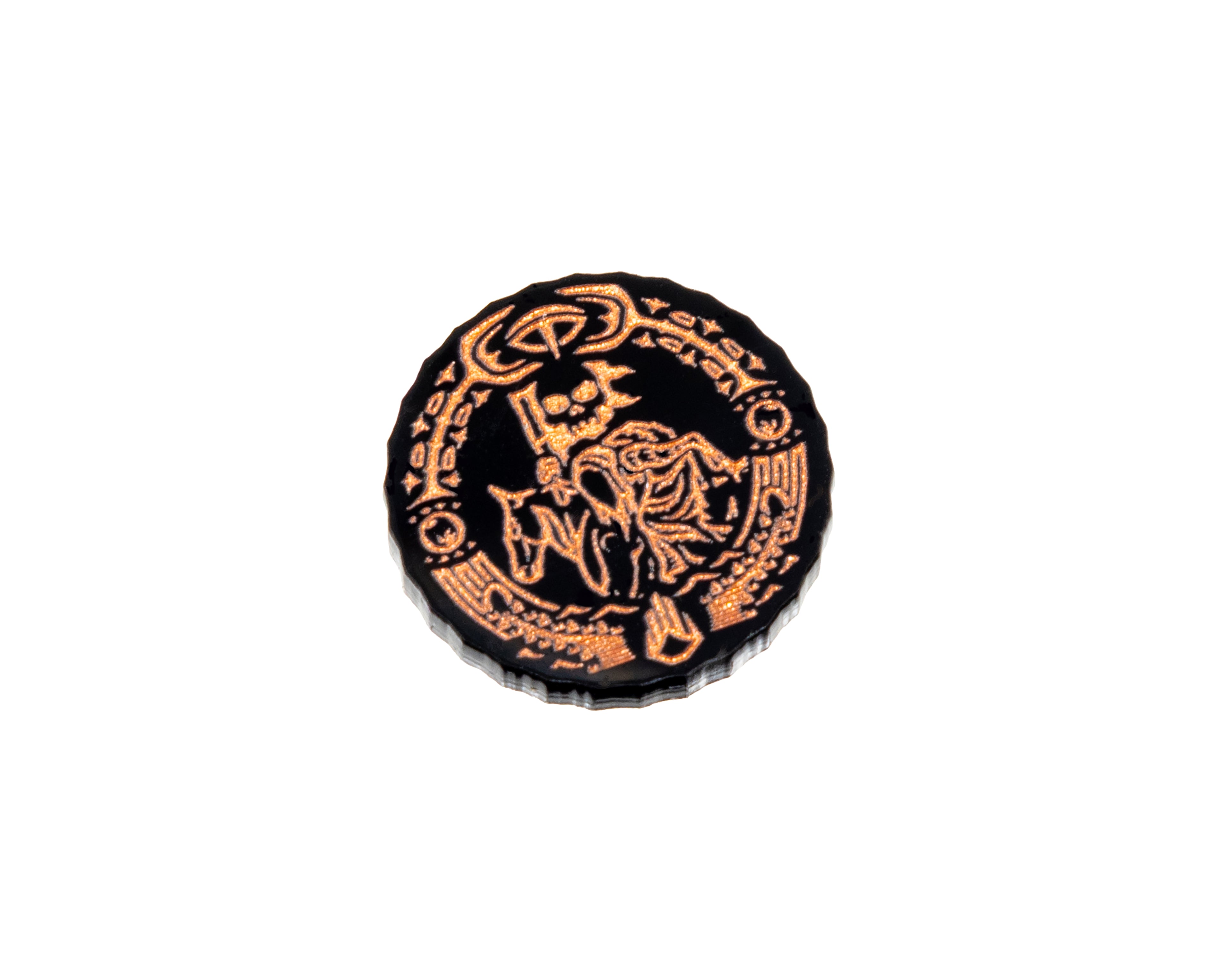 5 x Shadow Journey/Combat Tokens, made from black acrylic and etched with alternative designs on both sides. Painted copper and measuring 21mm in diameter.
