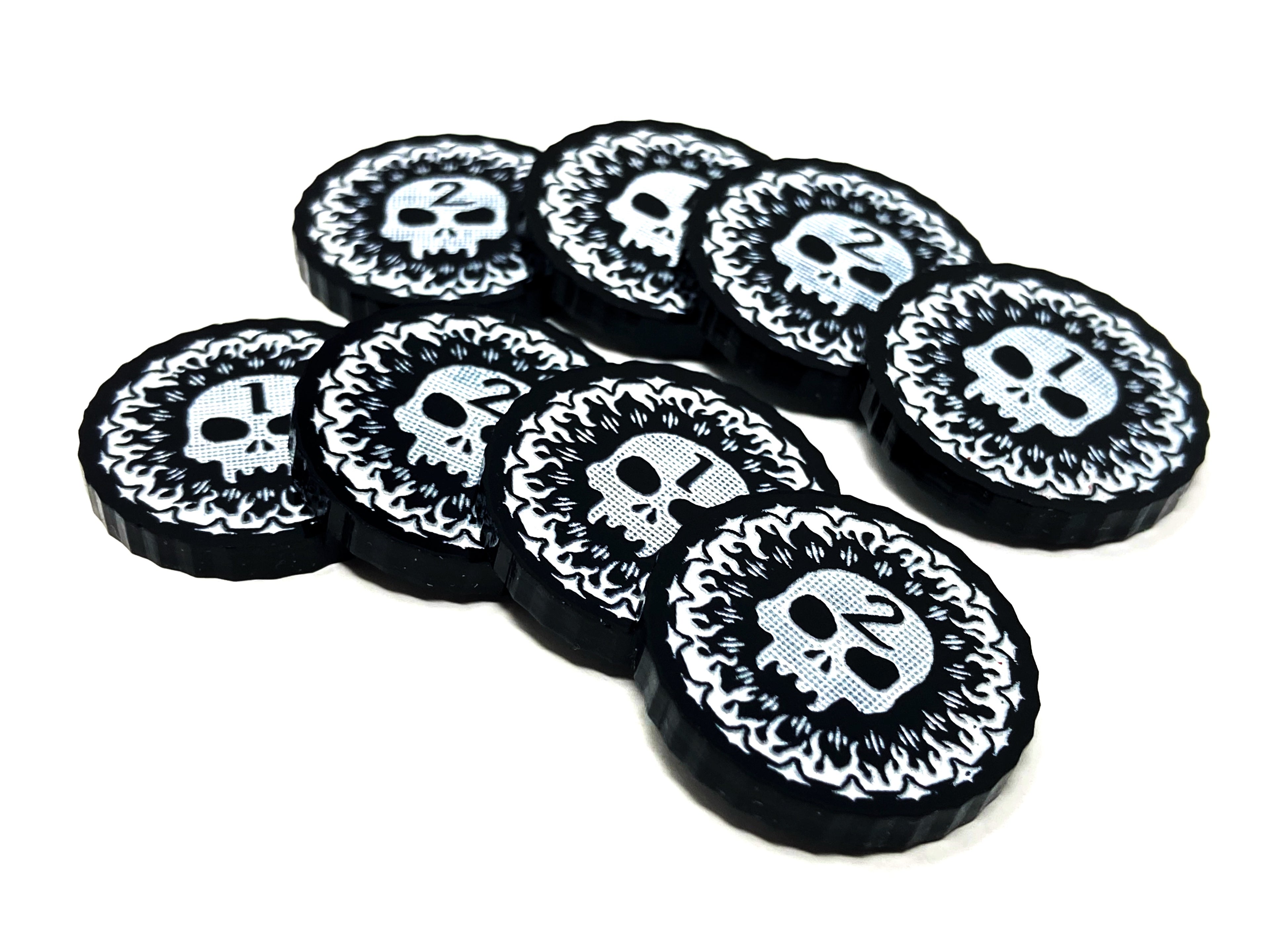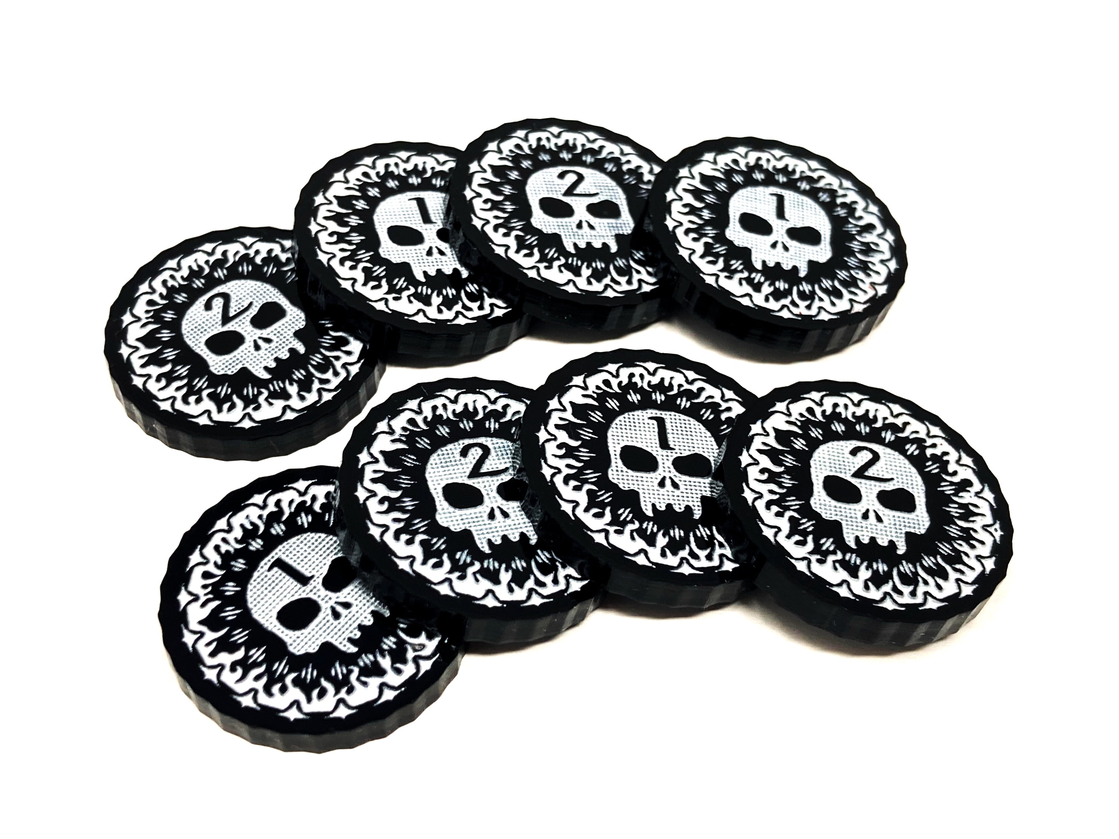 8 x Corruption Tokens, made from black acrylic and etched with alternative denominations (1/2) on both sides. Painted silver white and measuring 21mm in diameter.