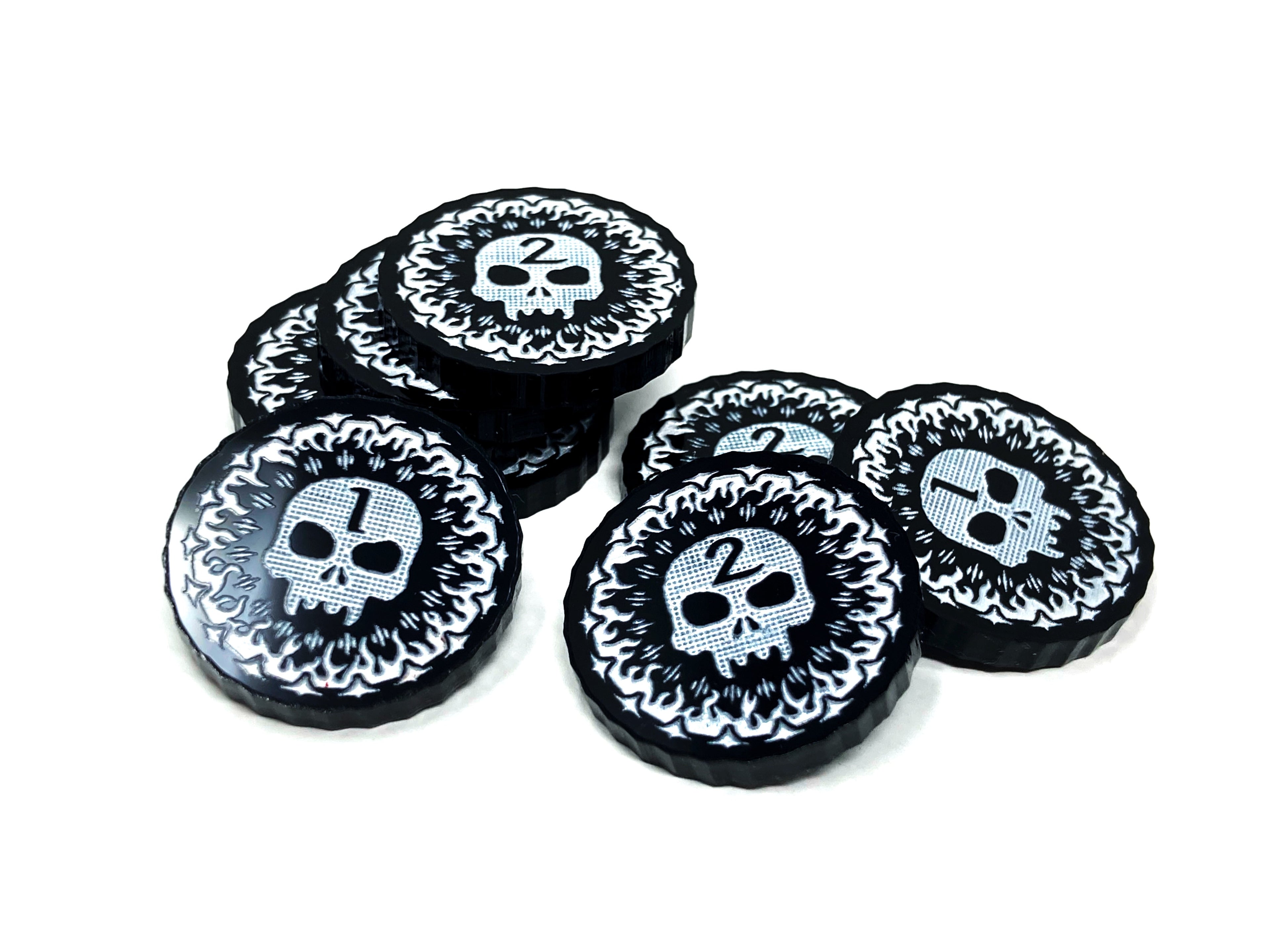 Double sided Corruption tokens featuring alternate denominations on each side, means a token can be simply flipped rather than adding another. It also means fewer tokens are required during play.