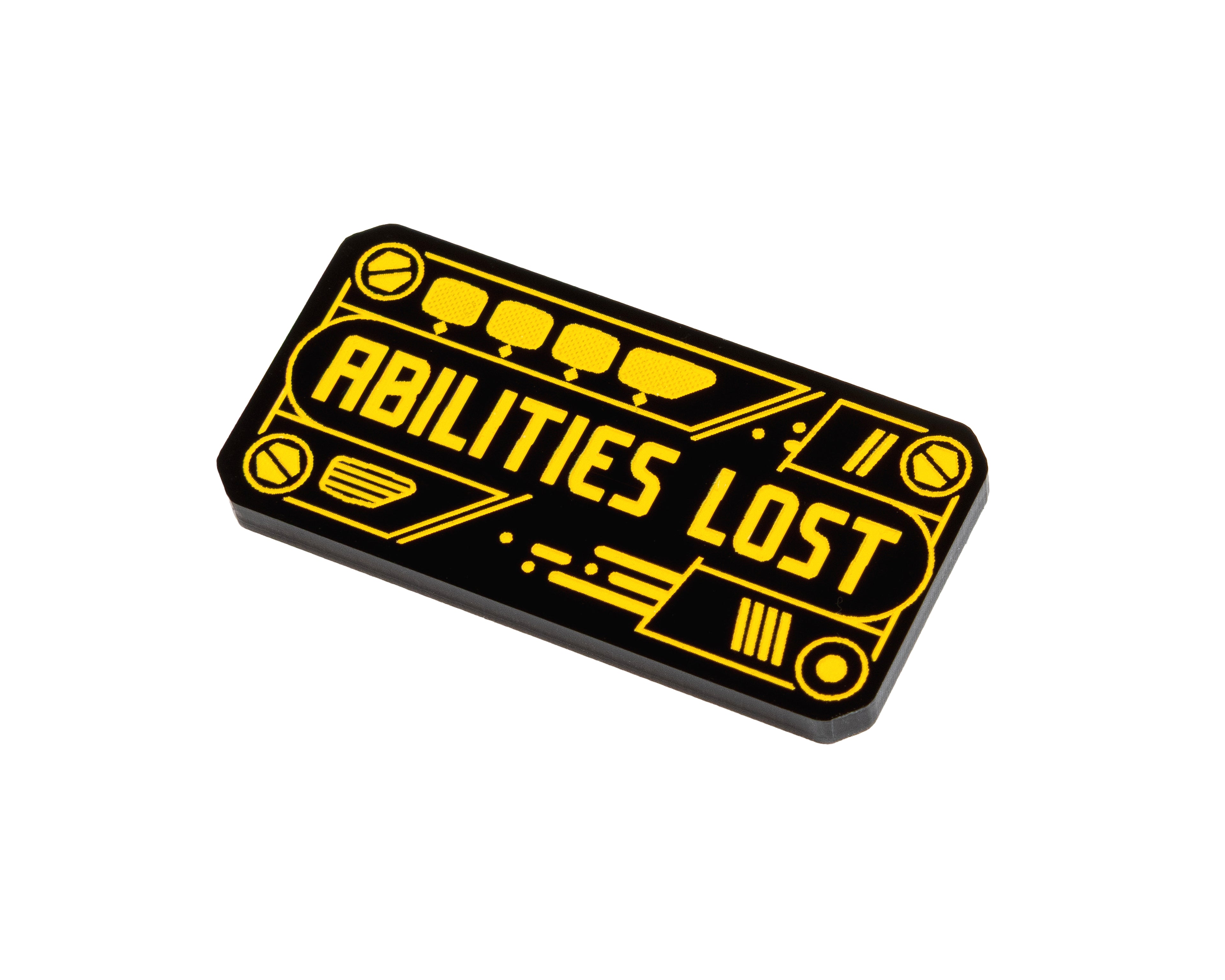- 1 x Ability Lost Token, etched and cut from 3mm black opaque acrylic and painted yellow orange on both sides. Measuring 40mm x 20mm