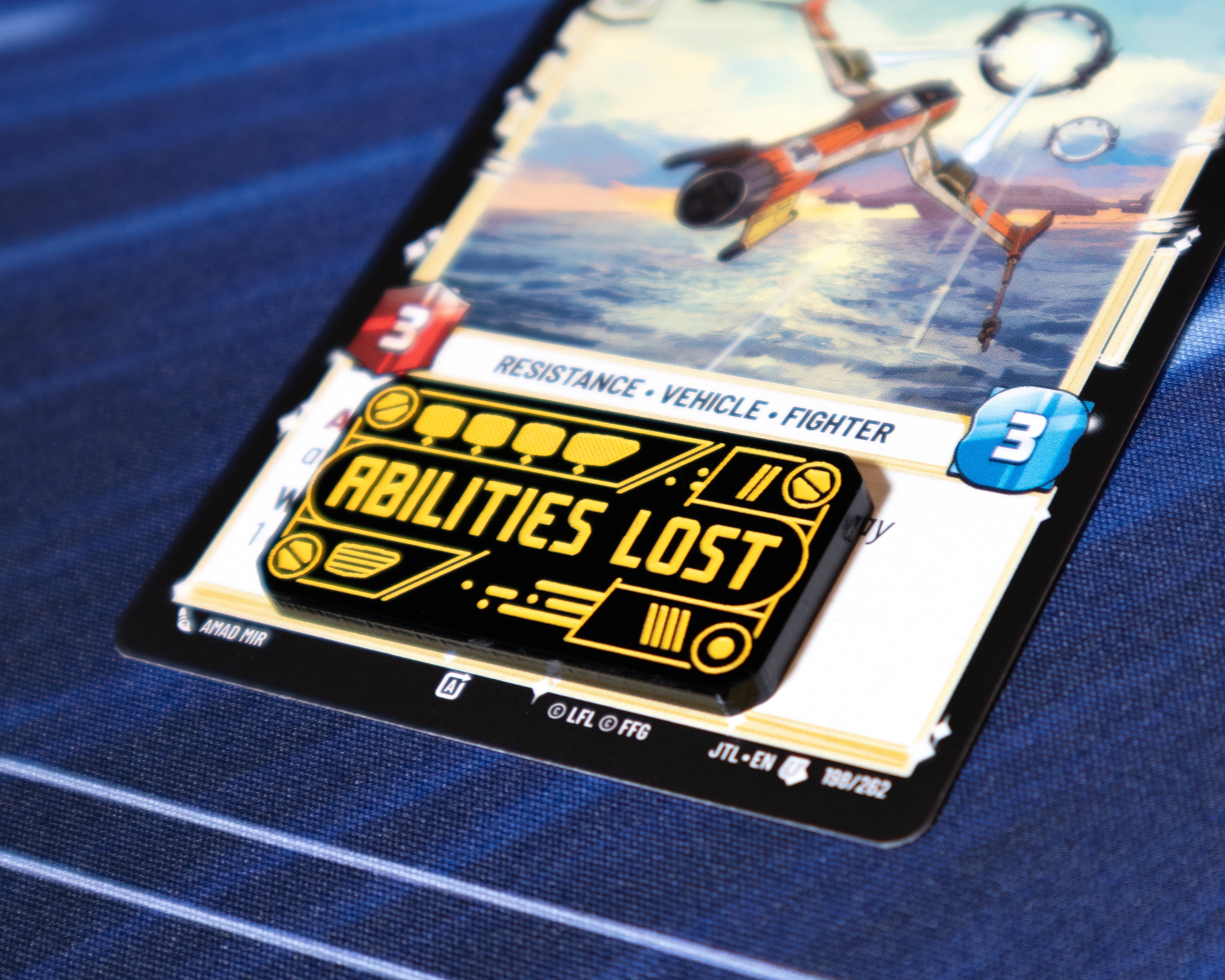 A thematic, easy to read double sided token design specifically for characters such as Kazuda Xiono to indicate when a unit has lost their abilities.