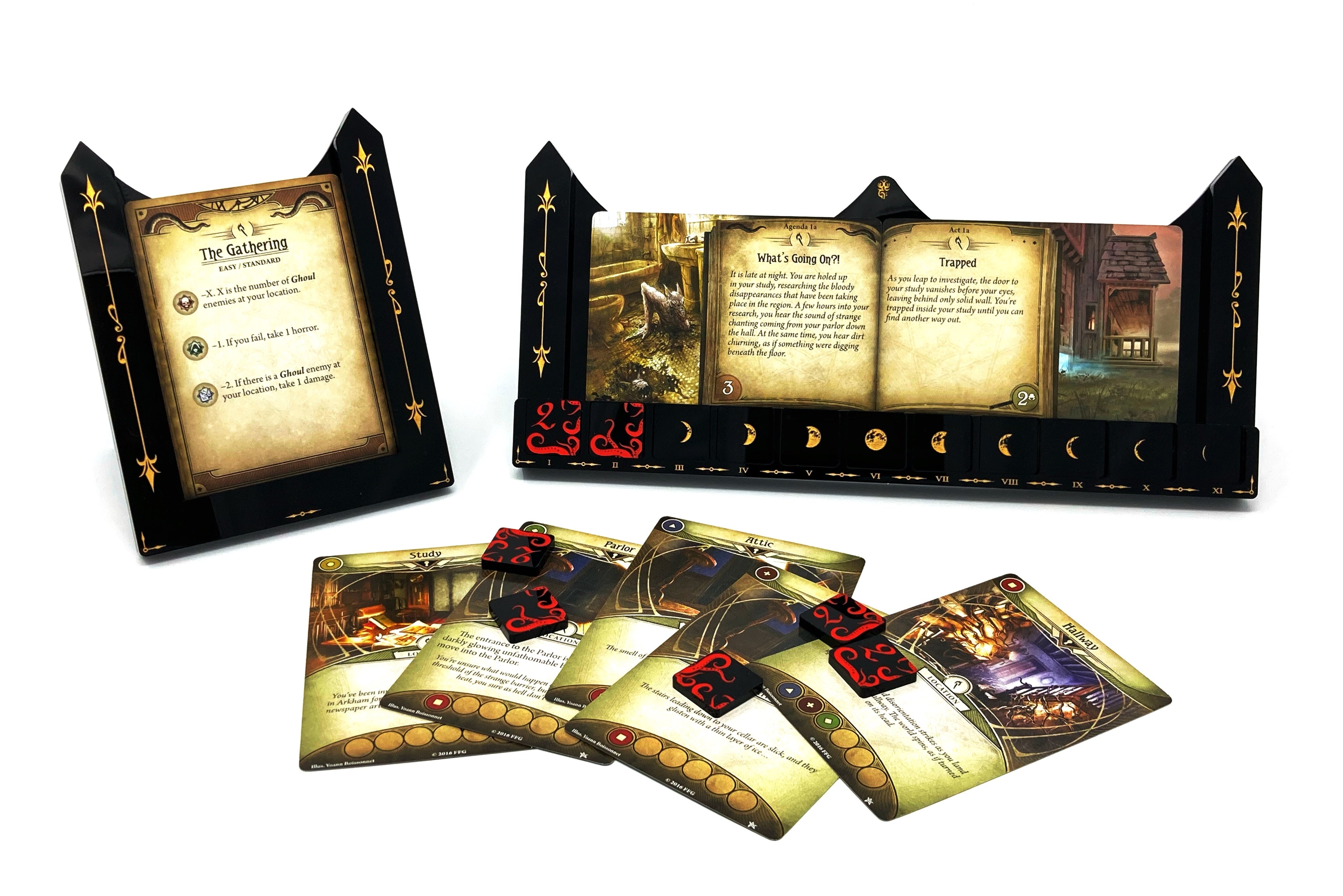 The Act and Agenda display has been specifically designed to fit the mythos of your Arkham Horror Games. We have designed this stand to hold the Act and Agenda Cards as well as our Doom Tokens for your Arkham Scenarios. By being mounted on display, it not only makes your games more immersive but provides the convenience of being able to easily read the cards themselves and count the Doom Tokens that you are amassing!