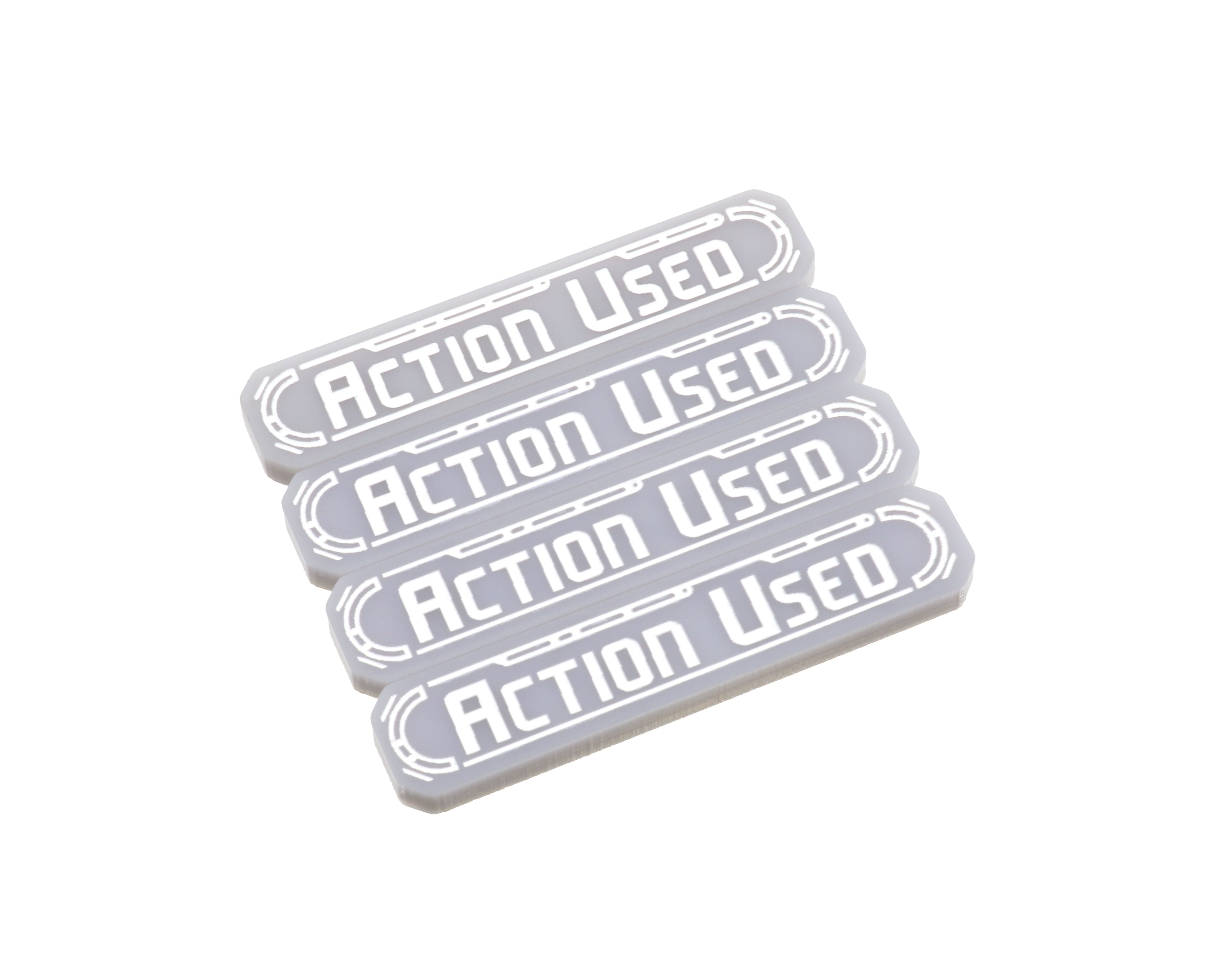 - 4 x Action Used Token, etched and cut from silver 3mm acrylic and painted black on both sides. Measuring 45mm x 9mm