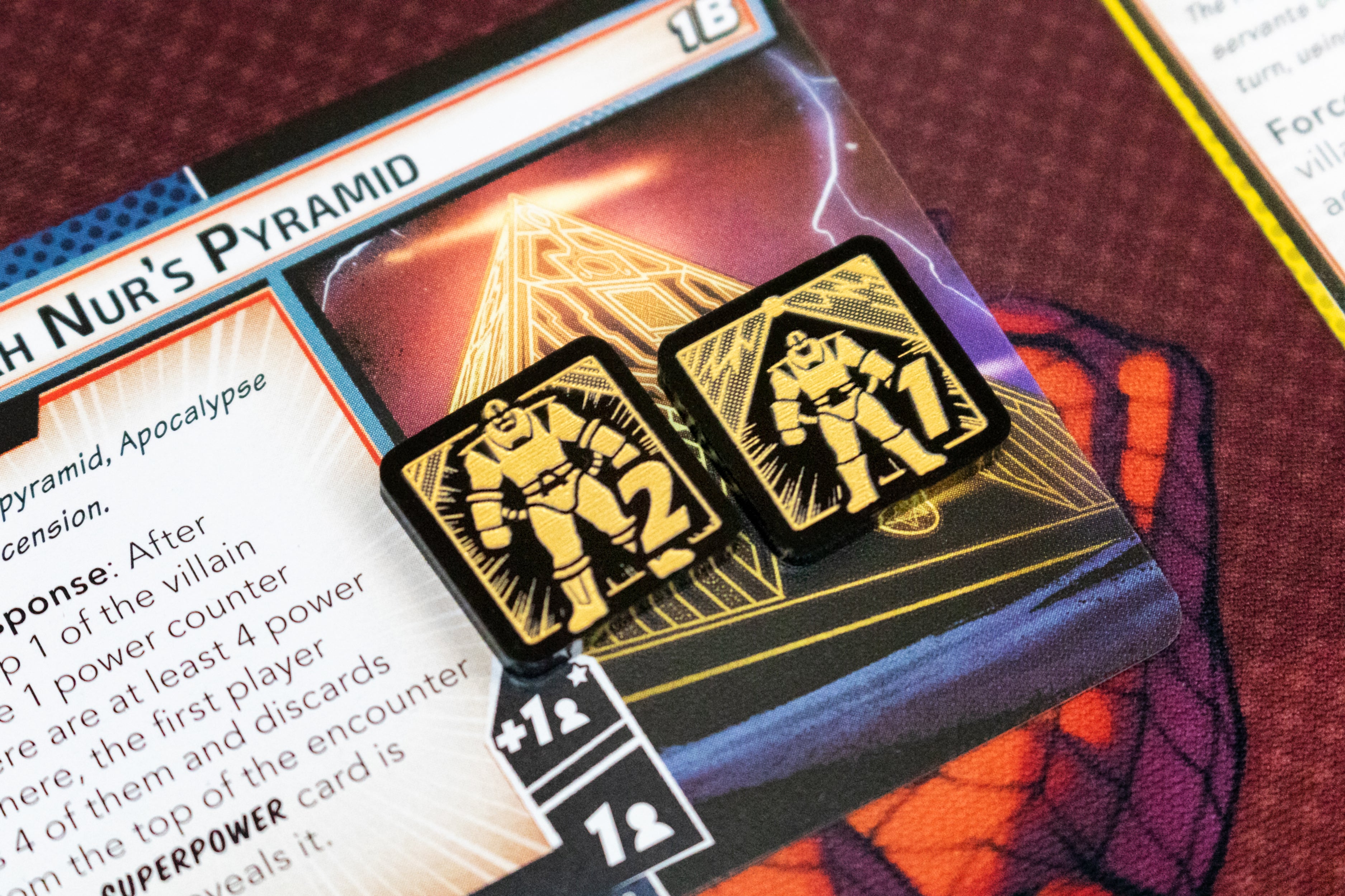 These thematic Apocalypse Power tokens will help you to keep track of the increasing power level while battling the Apocalypse. Showing a bright, bold and detailed design depicting Apocalypse growing in size, keeping track of the Villains abilities has never been easier.