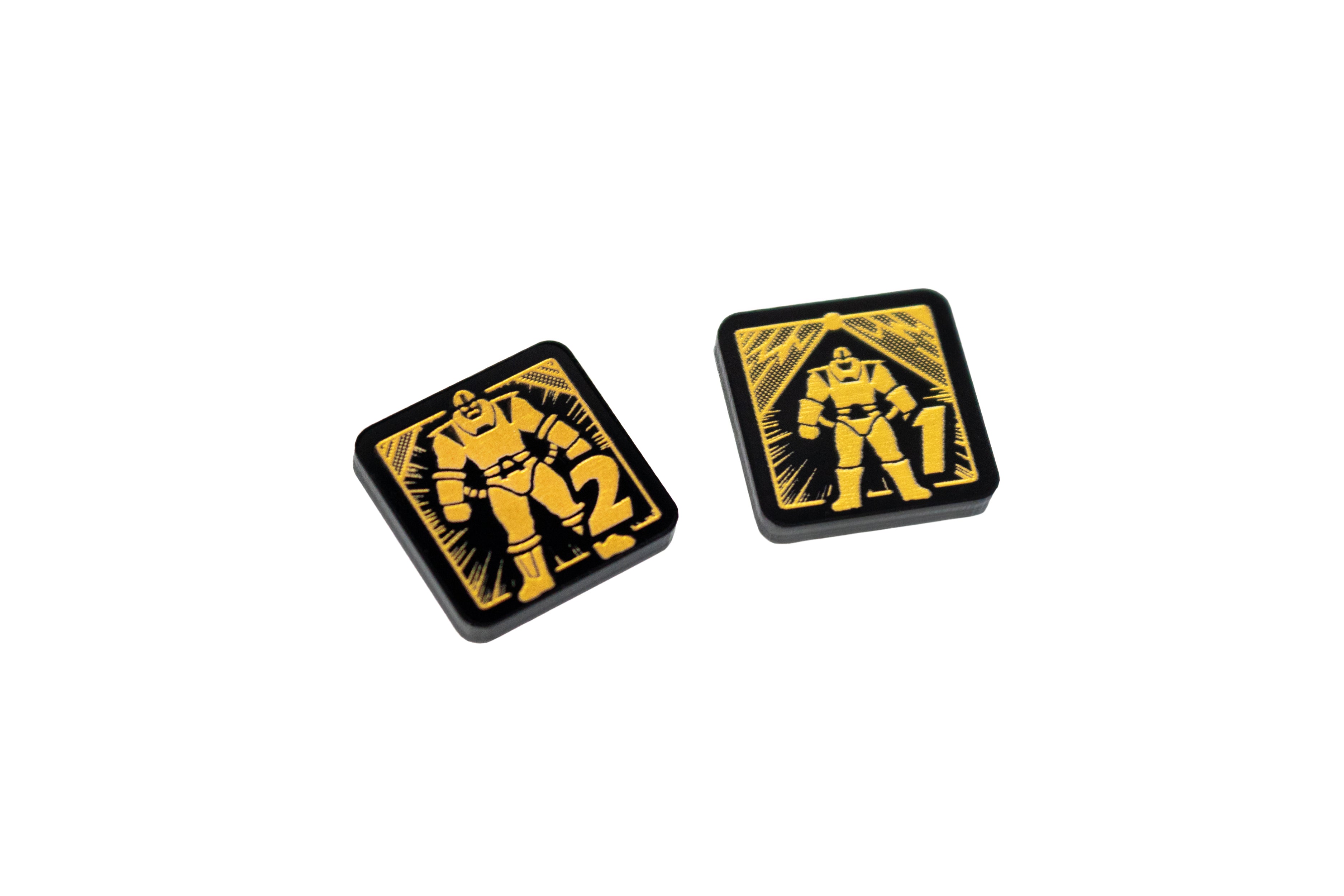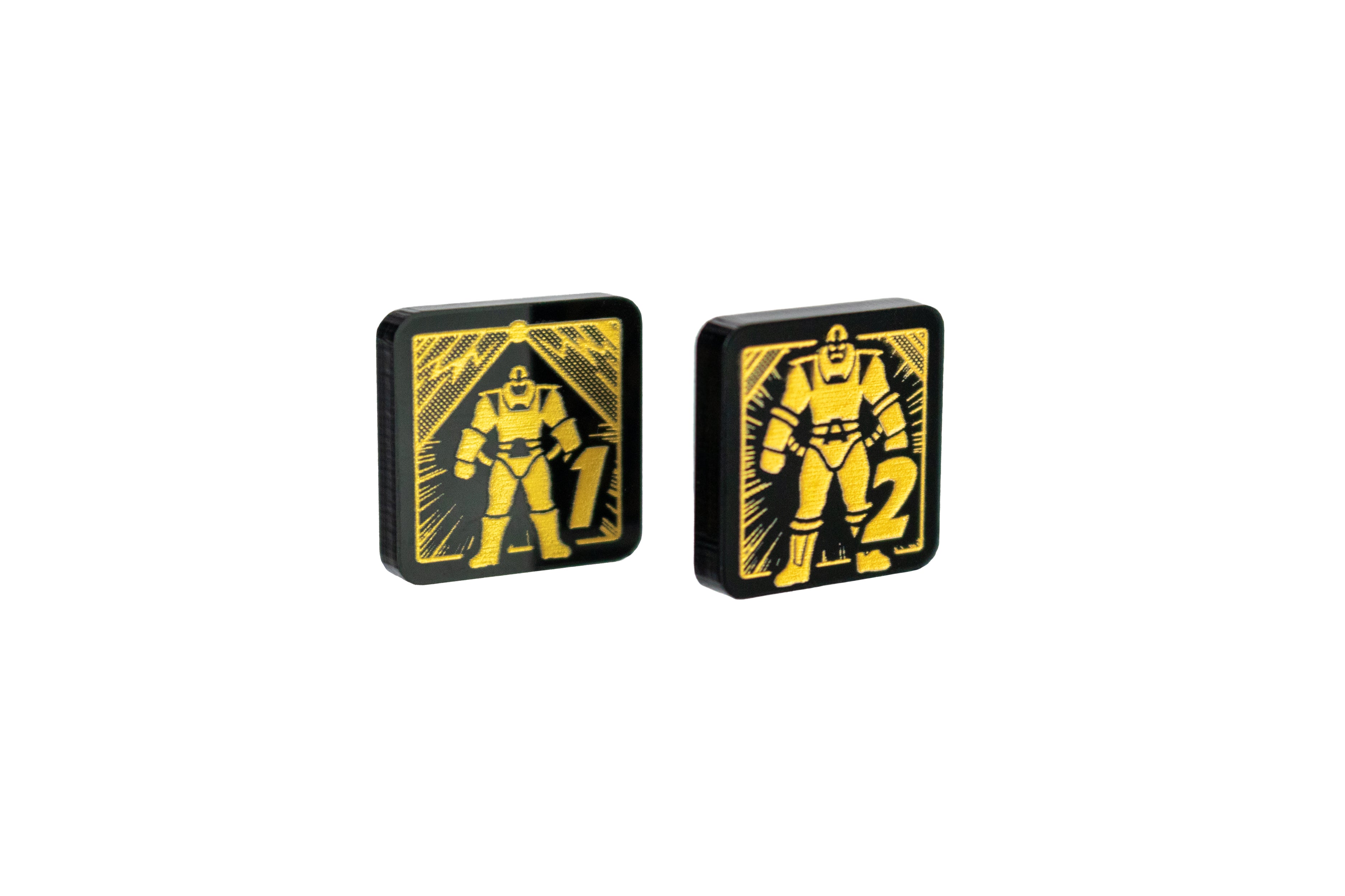 - 2 x Apocalypse Power Tokens 1/2, double sided showing a '1' on one side and '2' on the reverse side, etched and cut from opaque black acrylic, painted gold on both sides, measuring 18mm x 18mm
