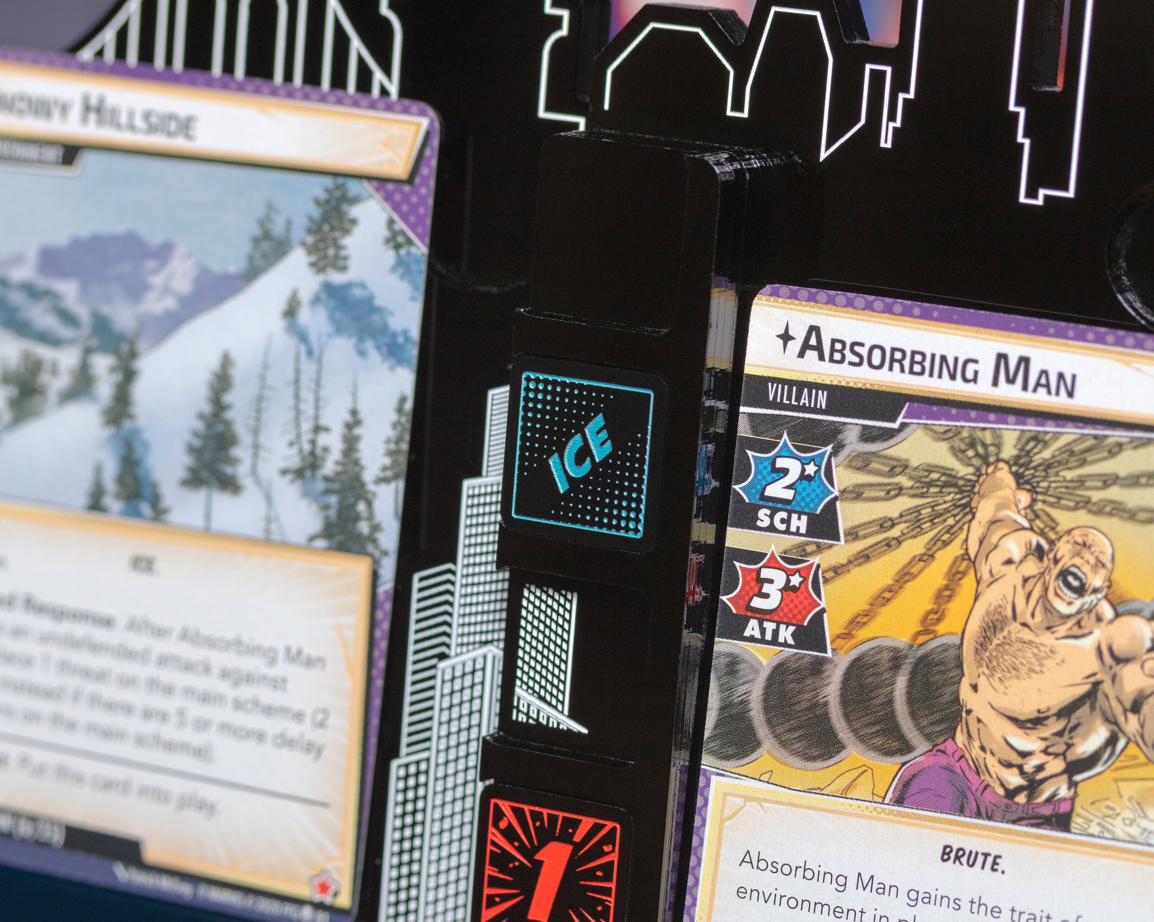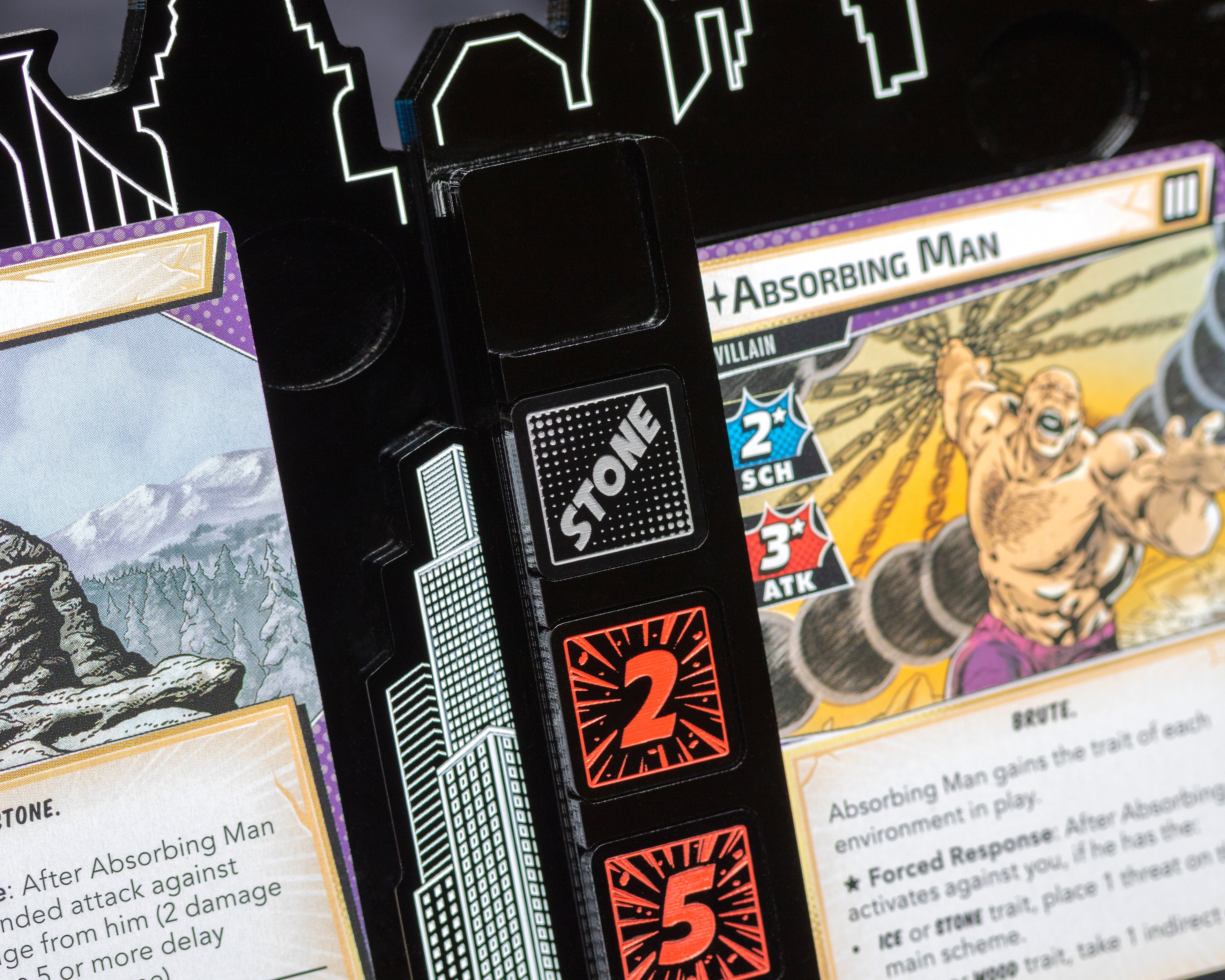 Designed specifically for the Absorbing Man villain encounter, these tokens clearly display one of four distinct traits—Wood, Metal, Ice or Stone—with high-contrast designs for easy readability. They provide a thematic and practical way to monitor which environmental property Absorbing Man has assimilated, allowing players to strategically plan their attacks against this adaptive villain throughout your game.