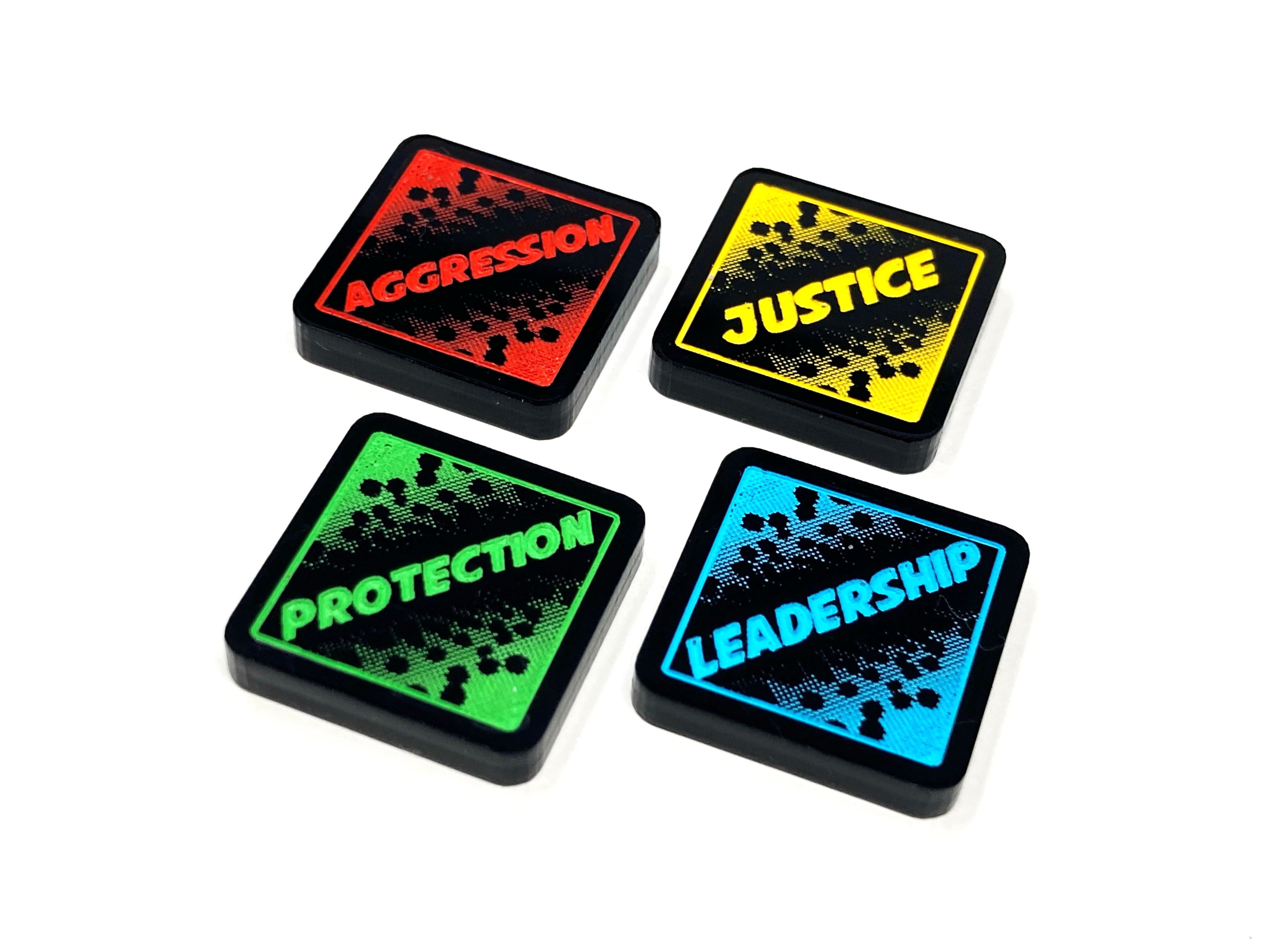 - 1 x Leadership Aspect token, etched and cut from opaque black acrylic and painted red on both sides. Measuring 18mm x 18mm