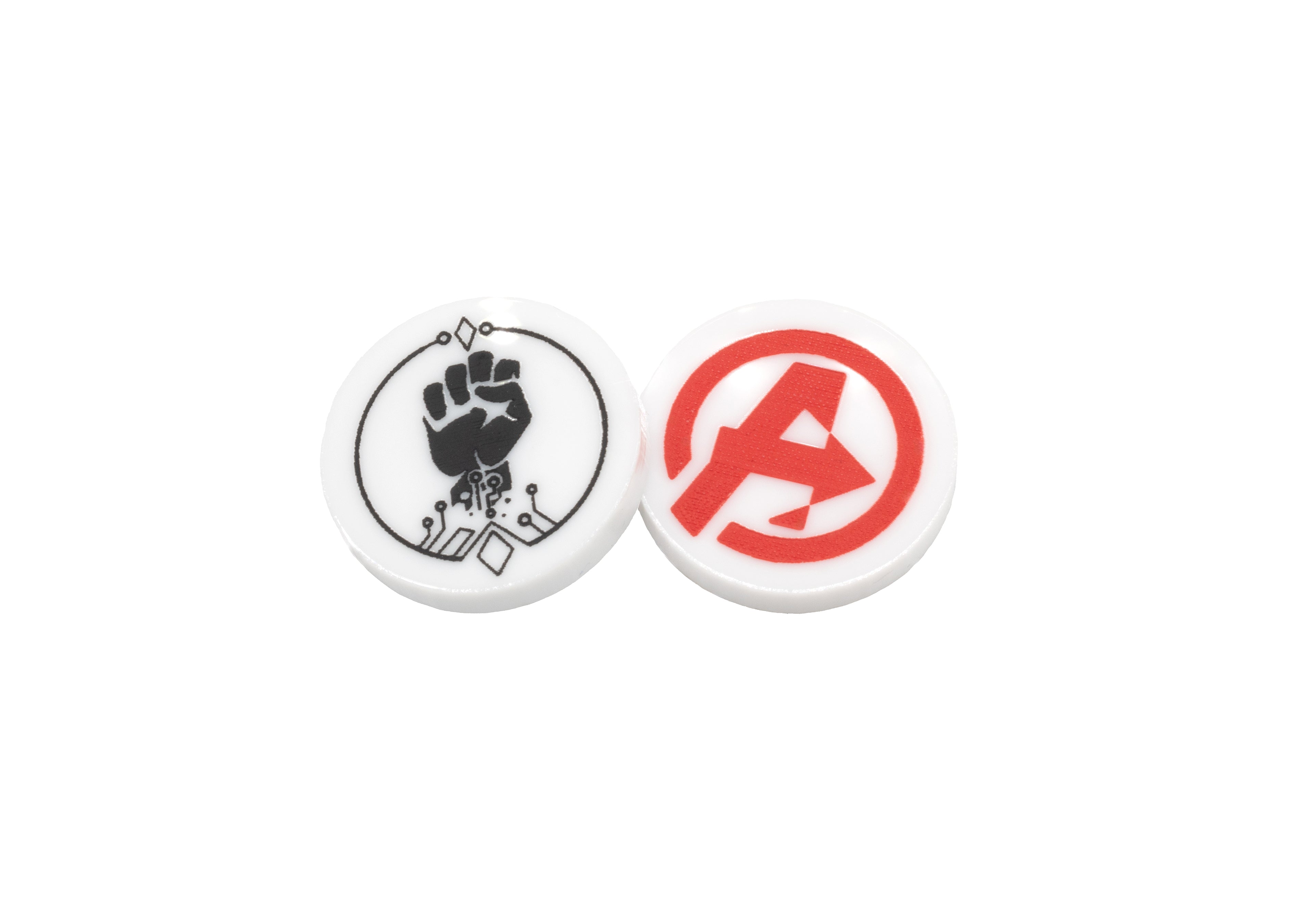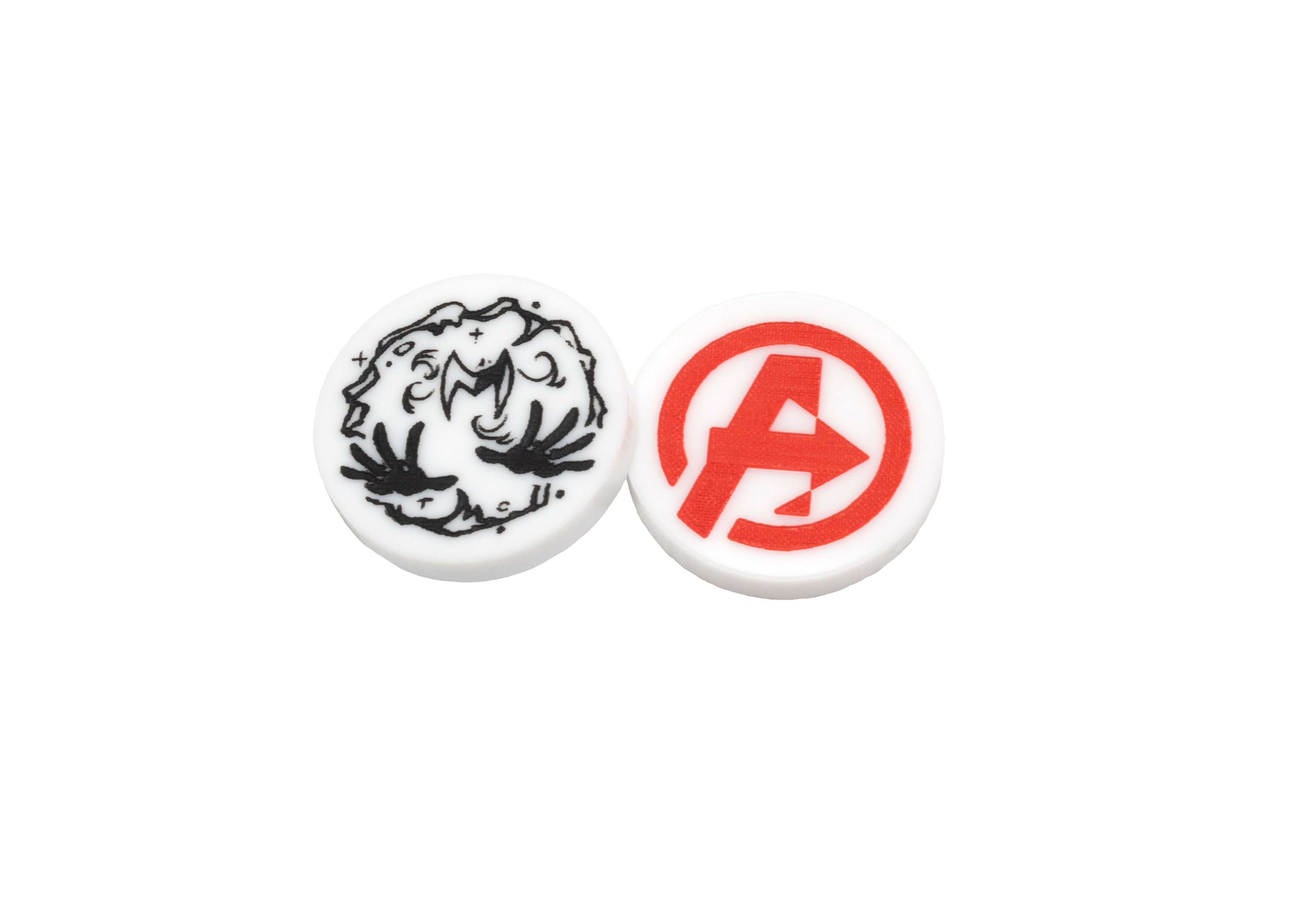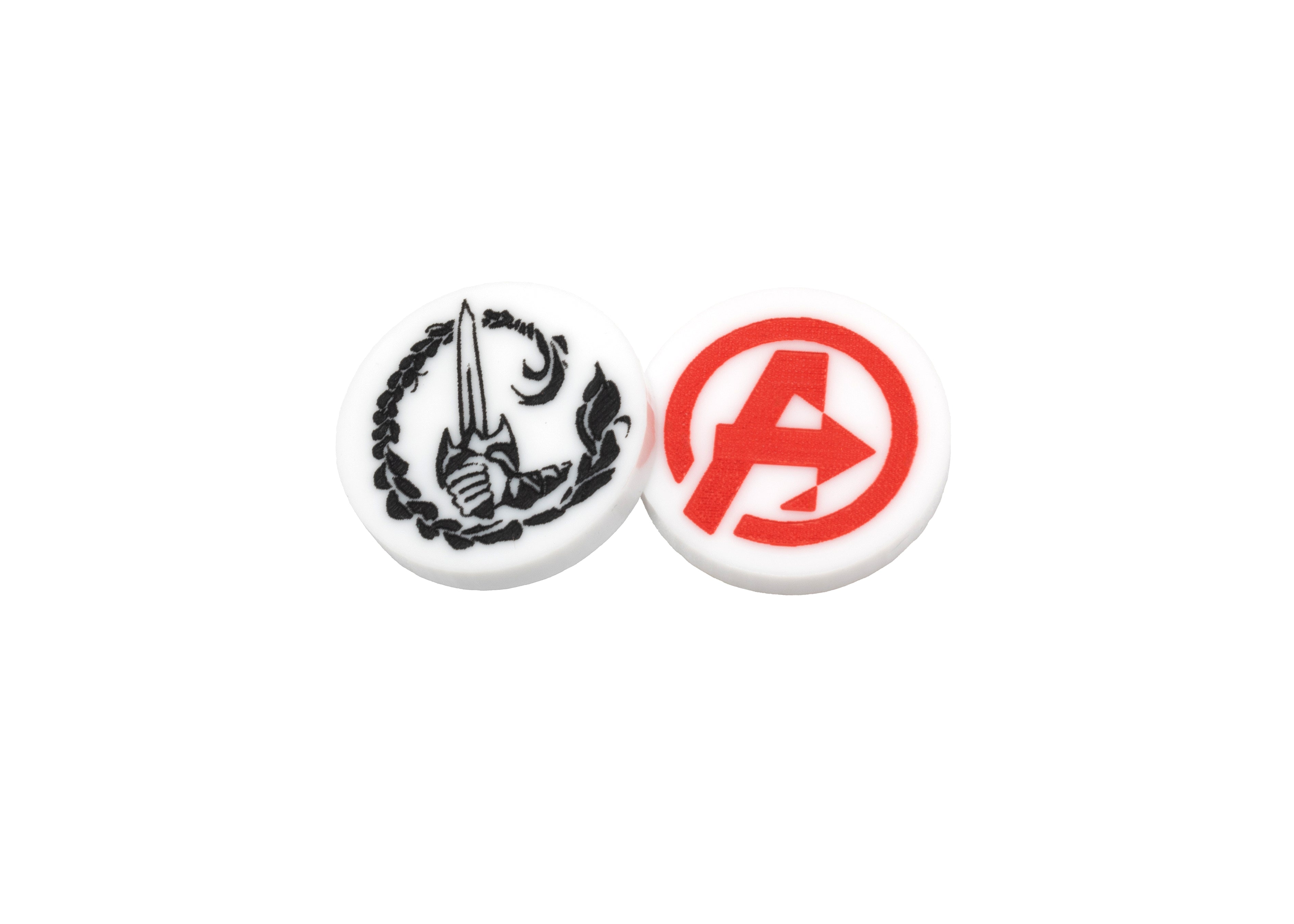 - 15 x Hero Specific Activation Tokens, etched and cut from opaque white acrylic, painted black on the active side and red on the reverse, inactive side. Measuring approximately 18mm diameter.