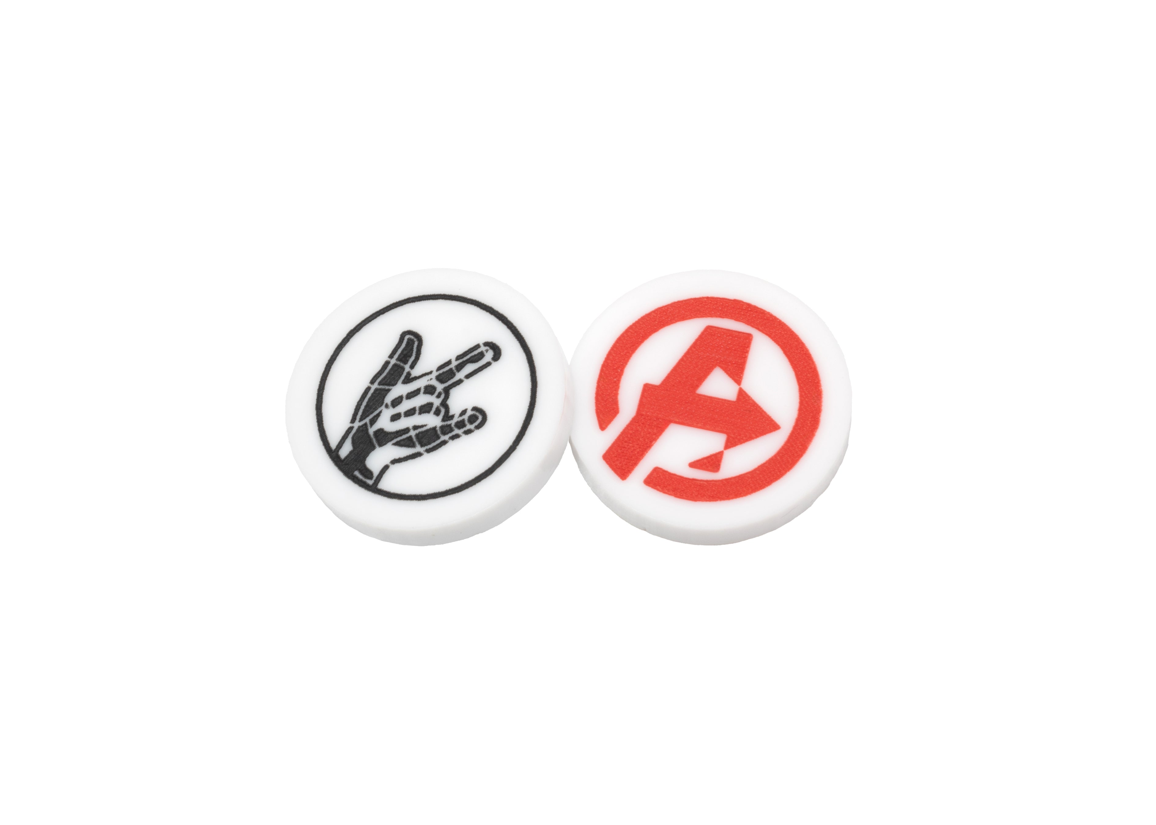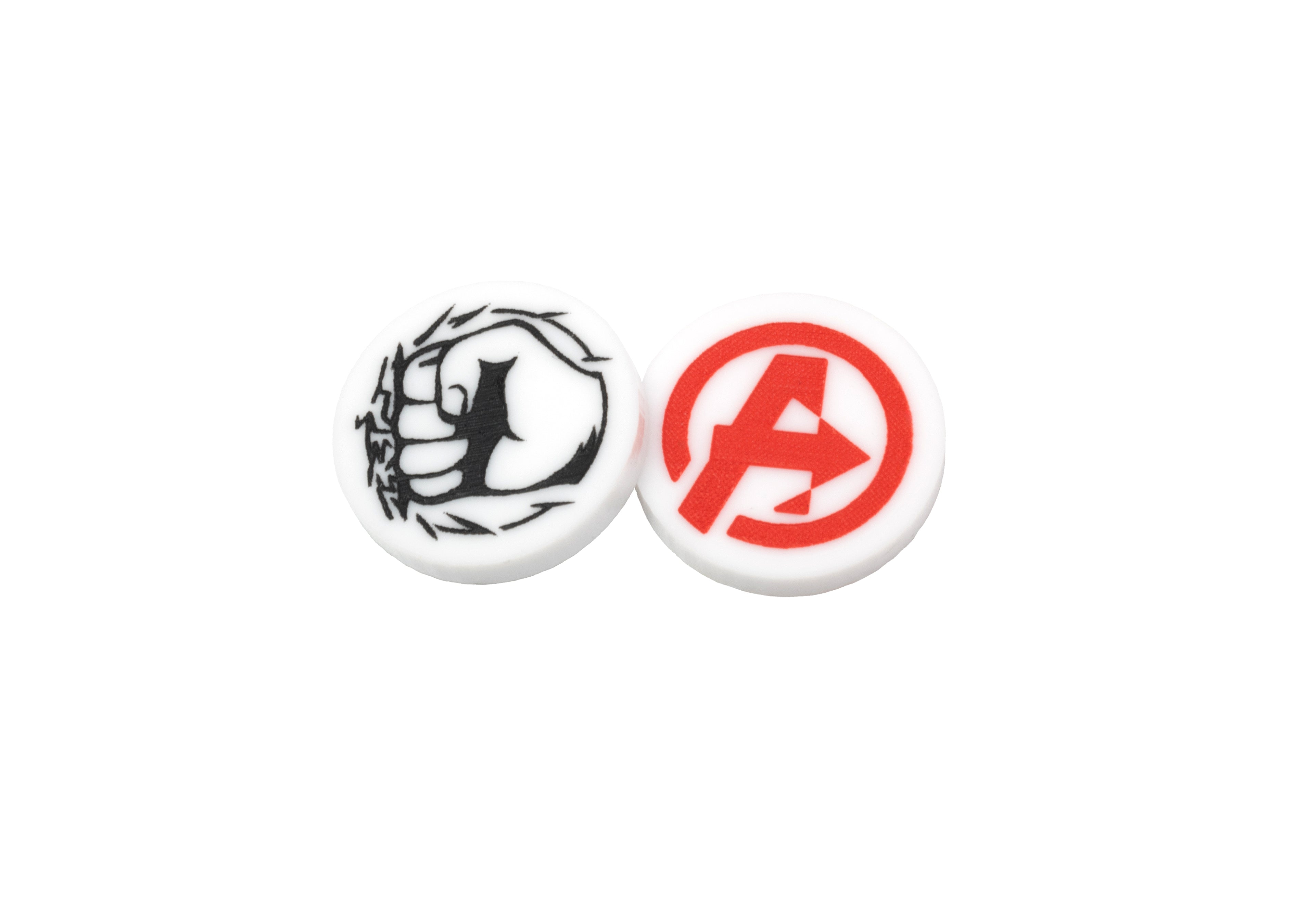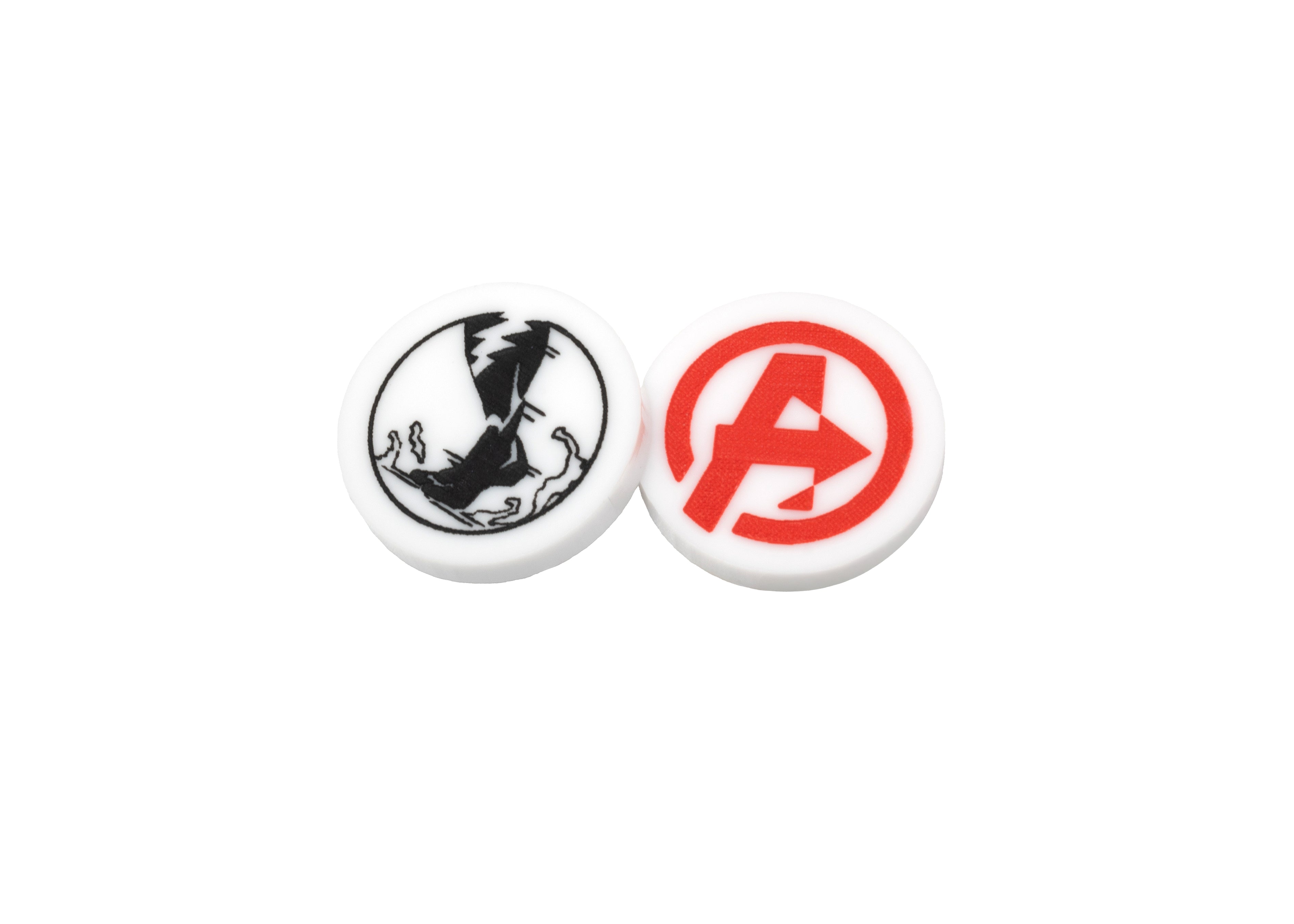 - 15 x Hero Specific Activation Tokens, etched and cut from opaque white acrylic, painted black on the active side and red on the reverse, inactive side. Measuring approximately 18mm diameter.
