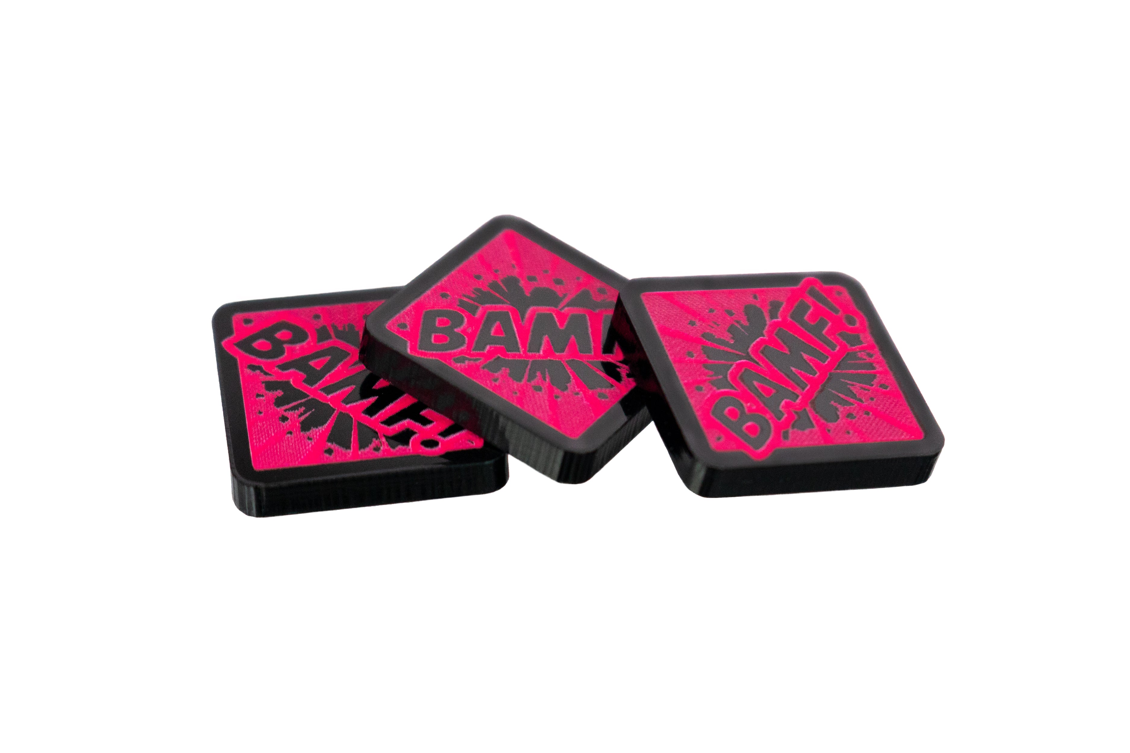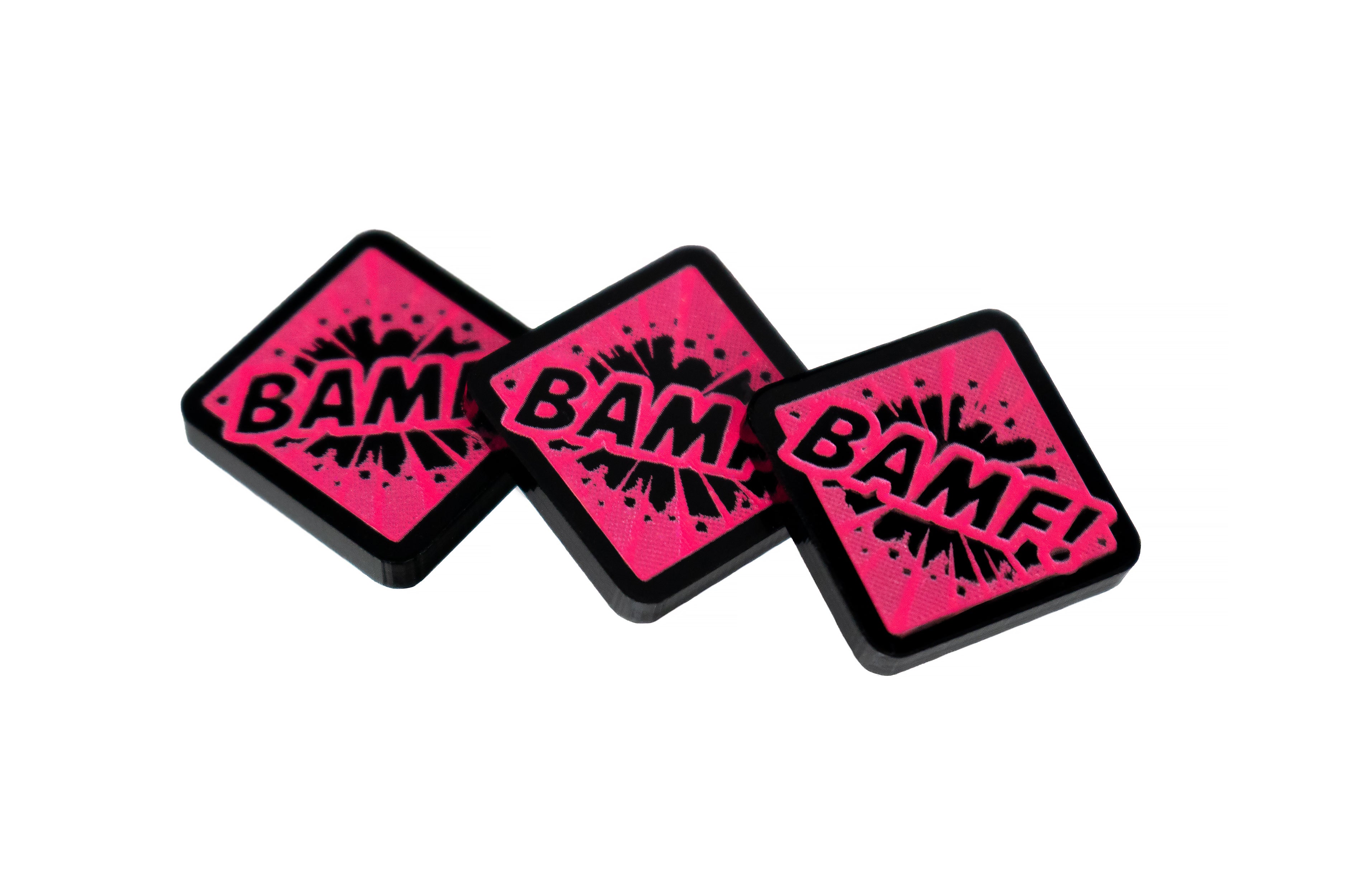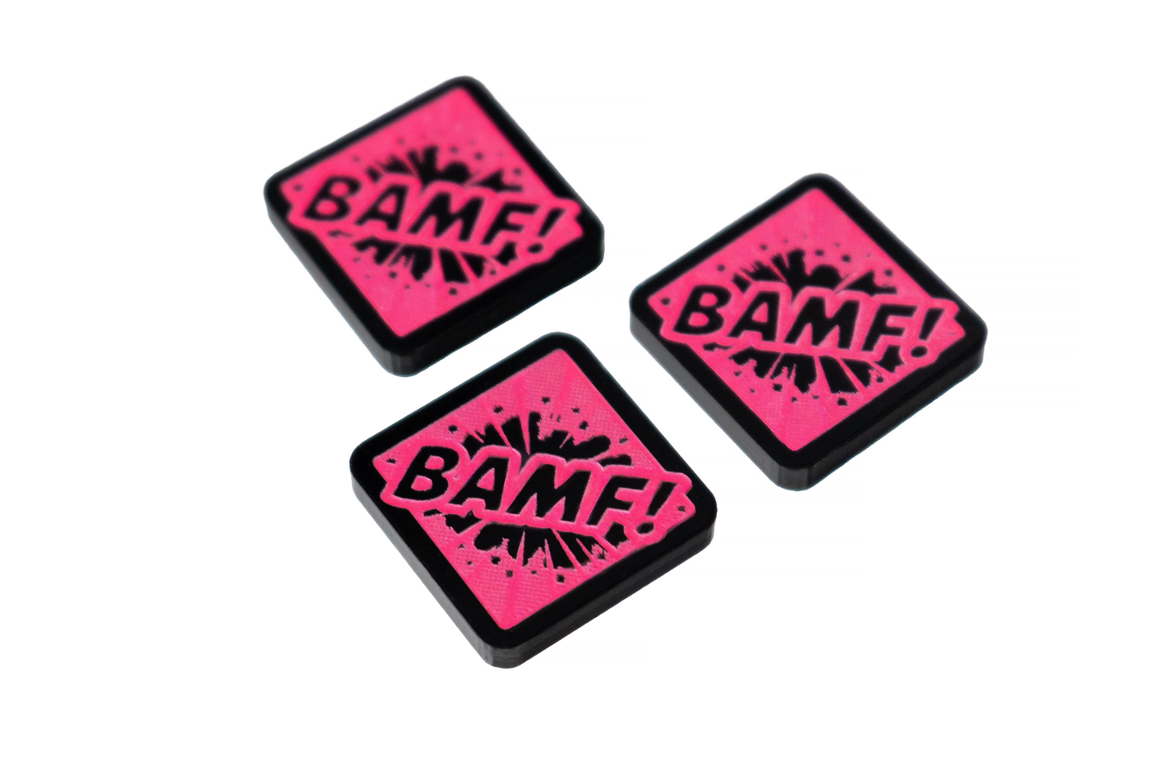 - 3 x 'BAMF' Tokens, double sided, etched and cut from opaque black acrylic, painted magenta and measuring 18mm x 18mm