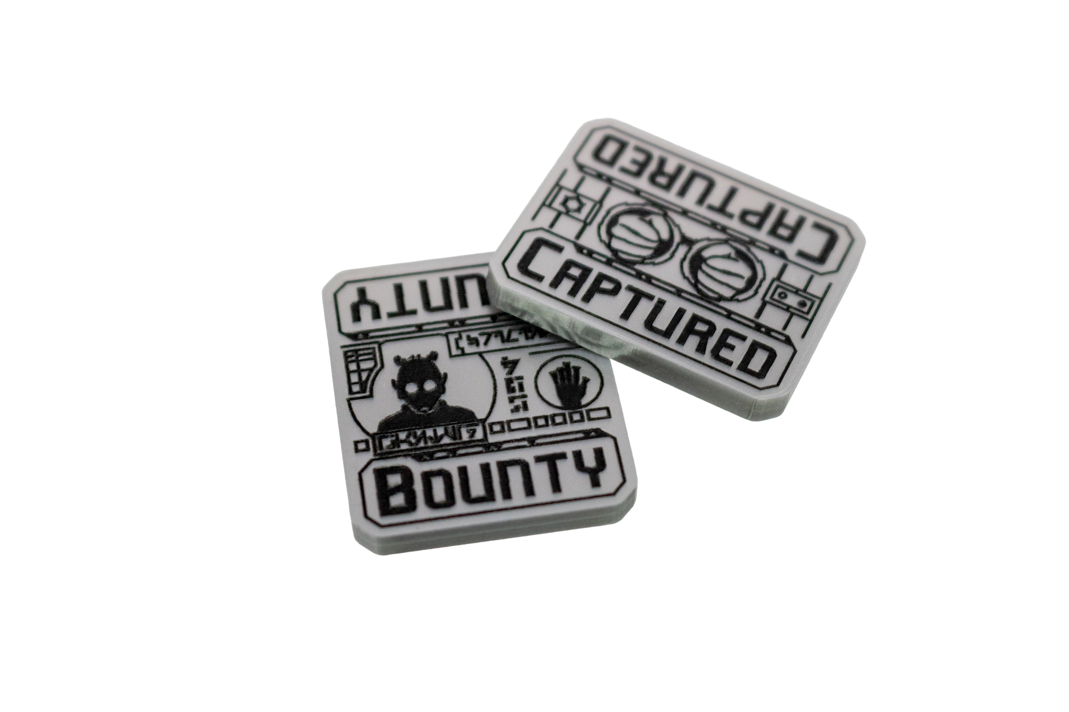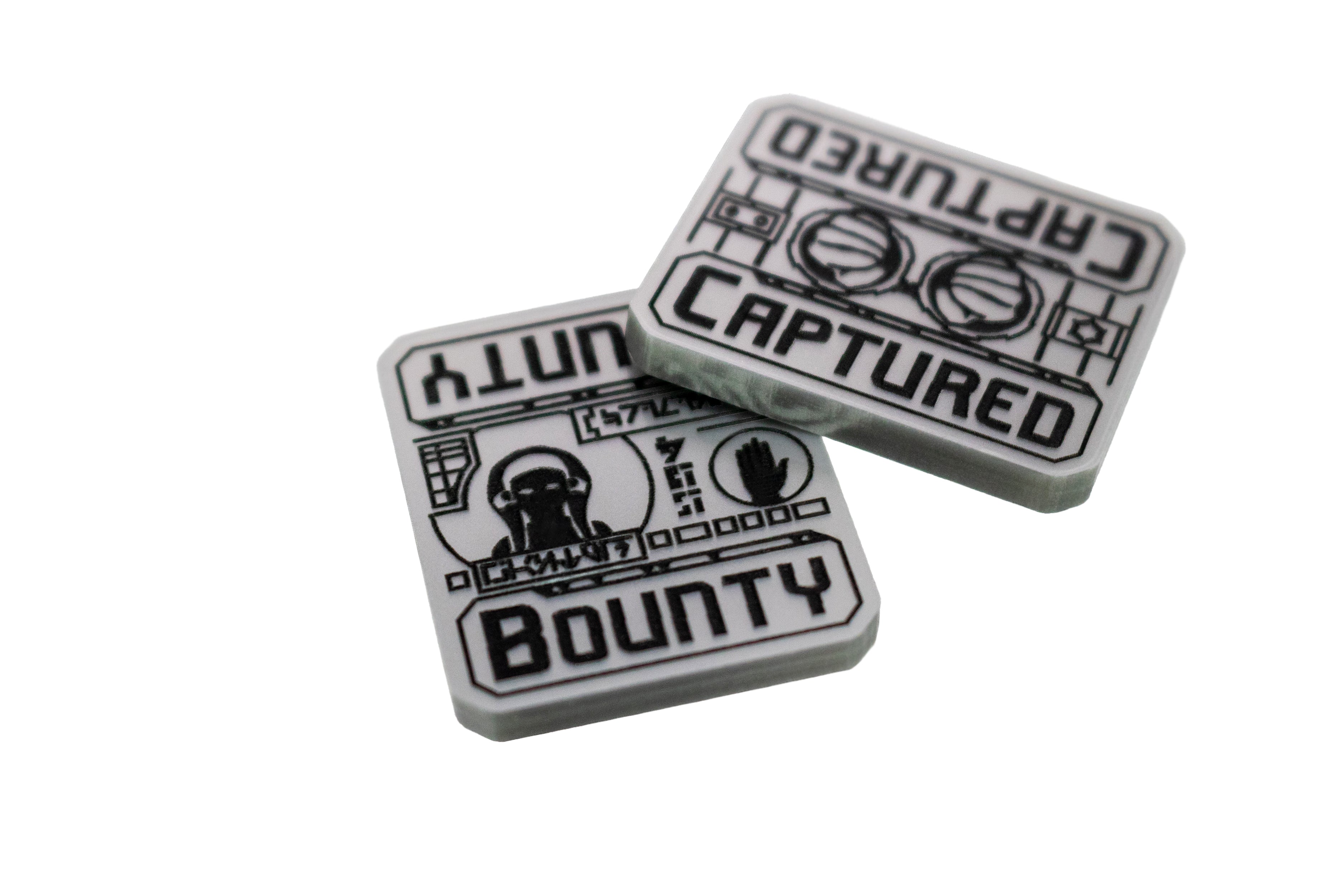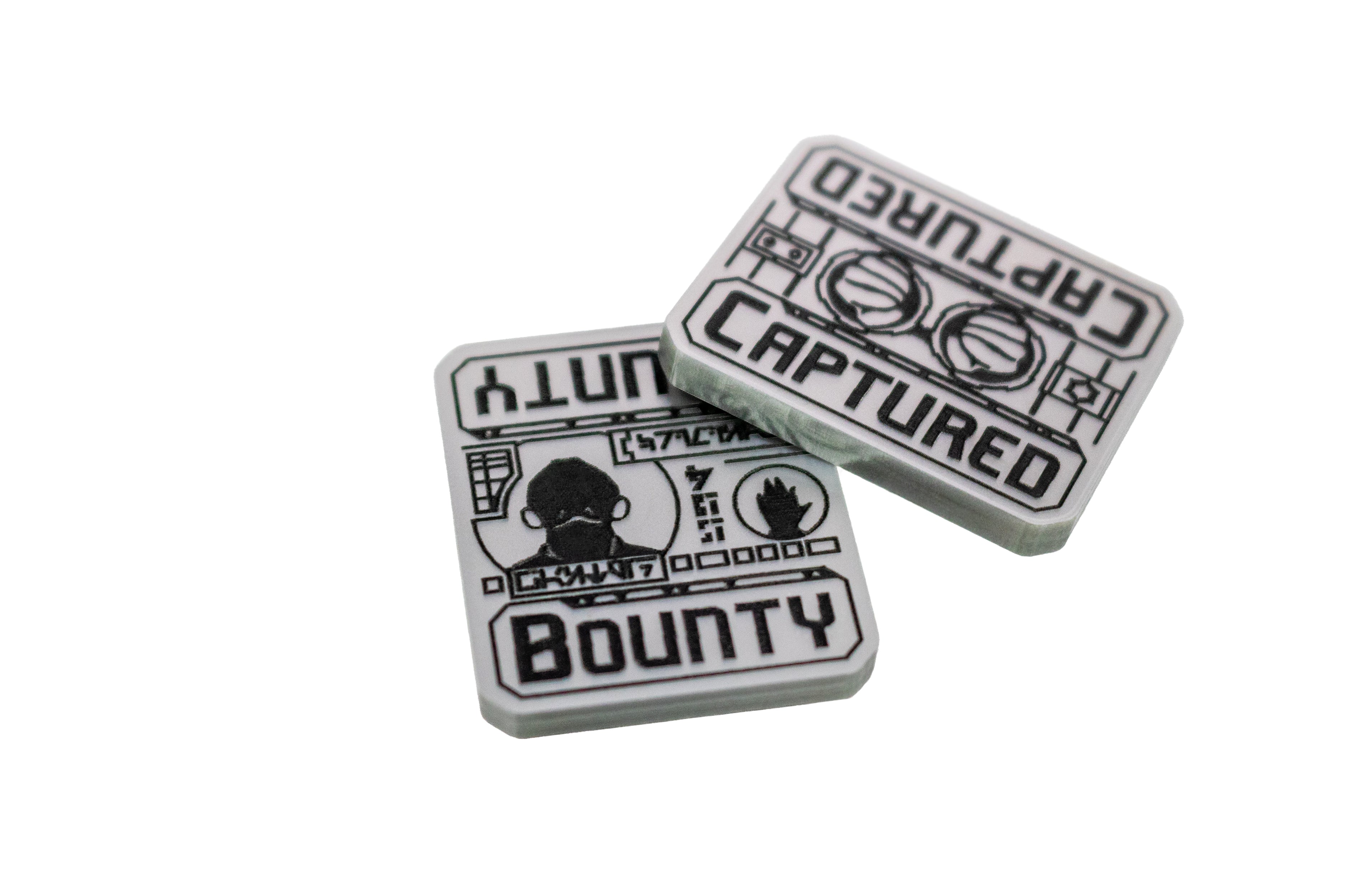 A thematic, double sided and multi-use token to remind you which unit has a bounty placed upon them or which unit has been captured by your opponent. After all, they are no good to you dead!