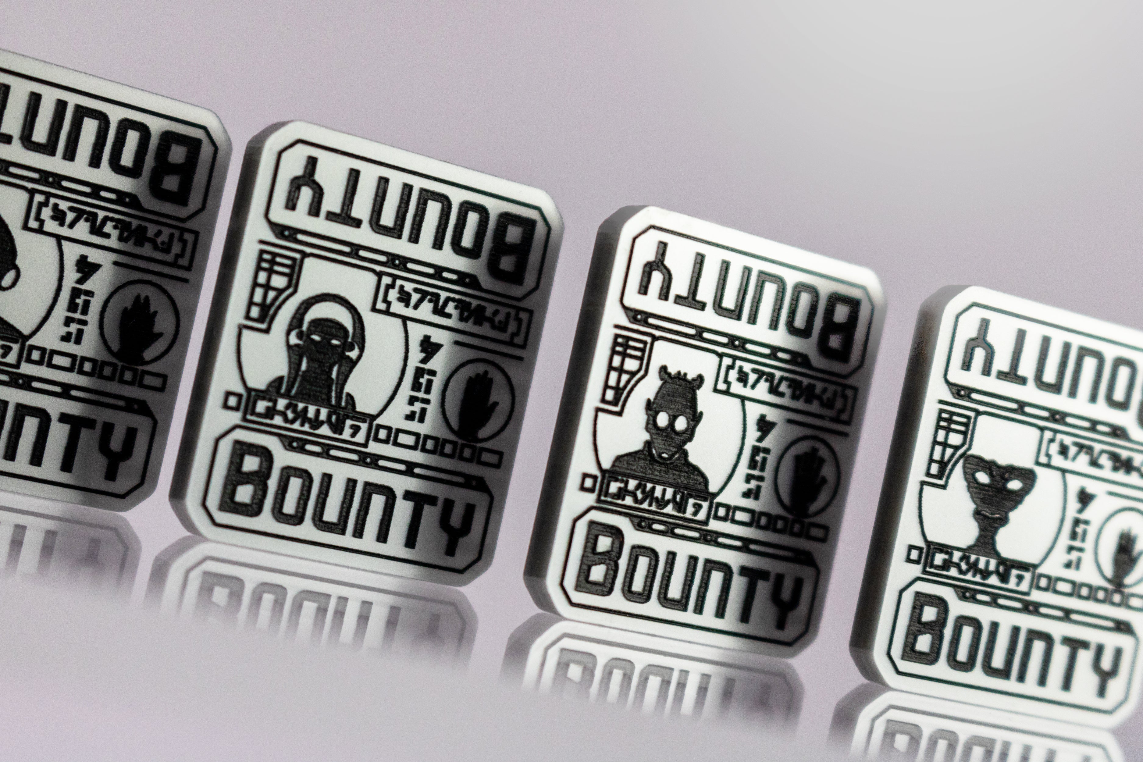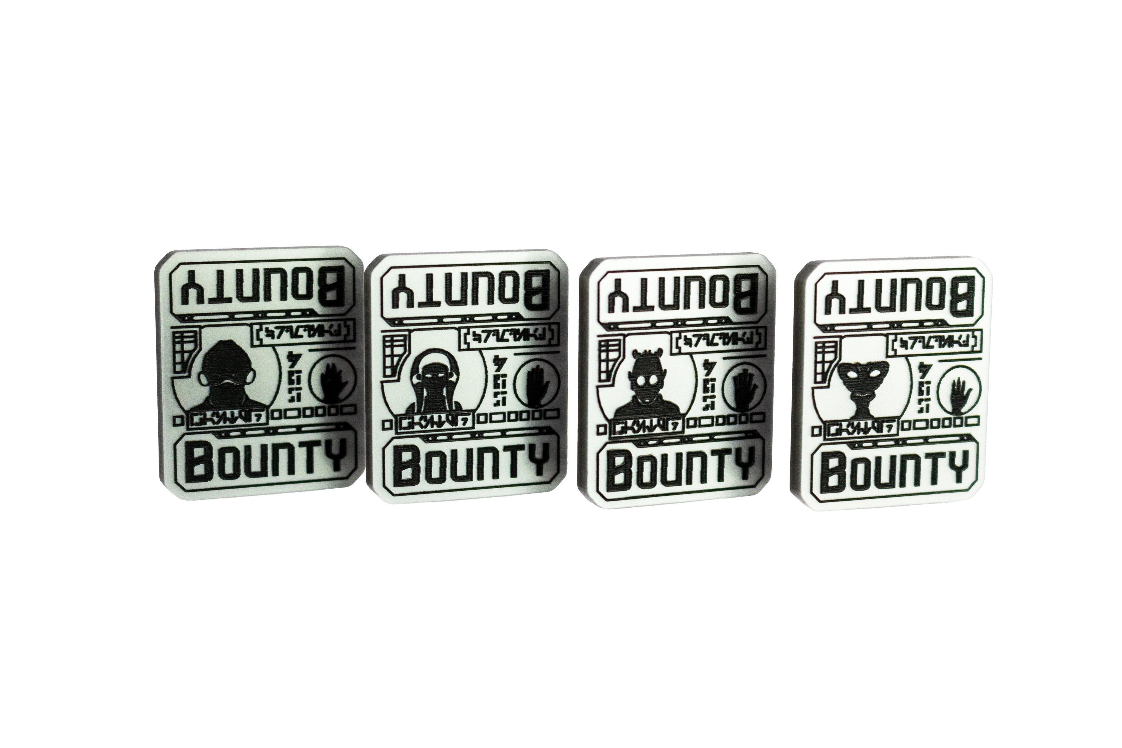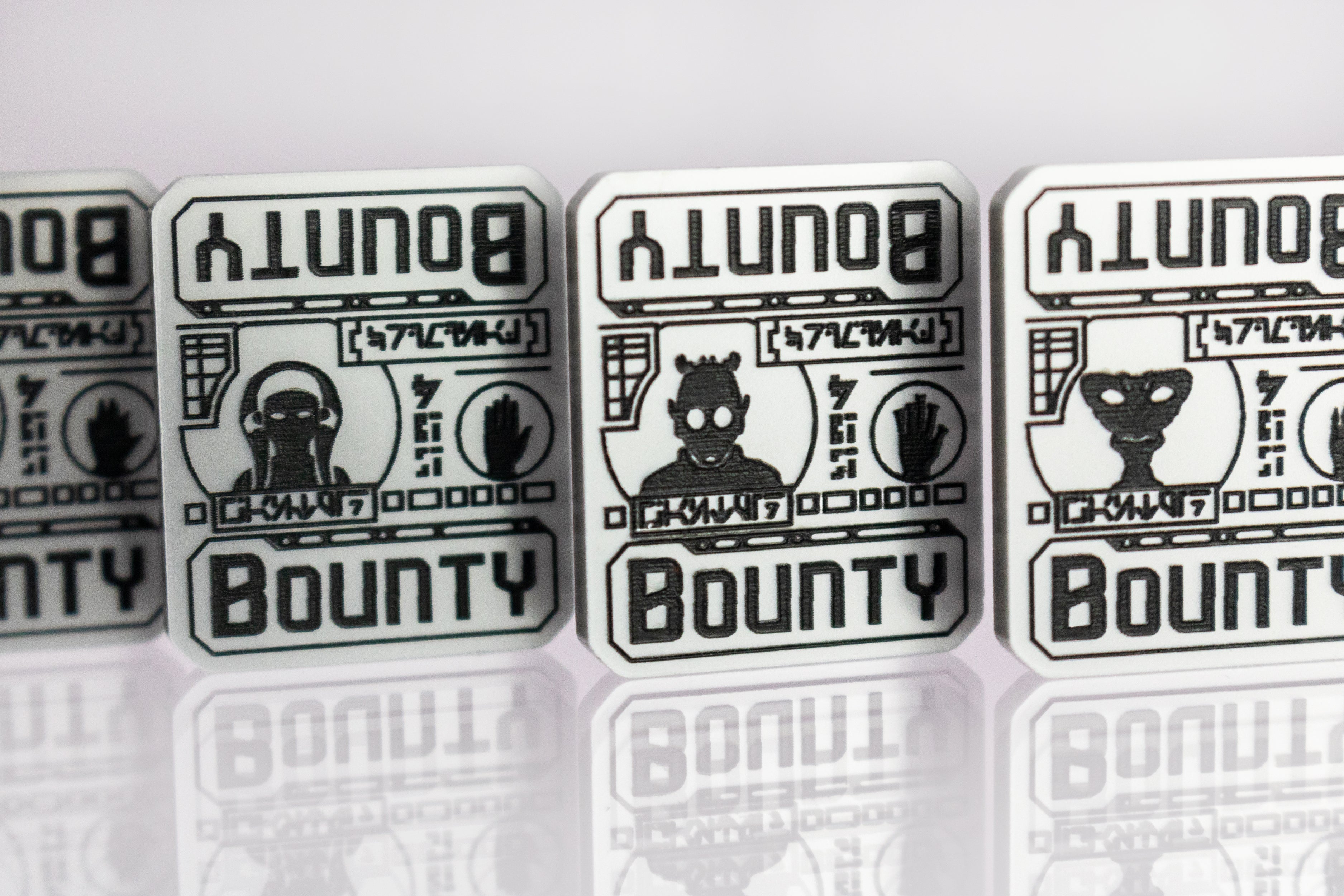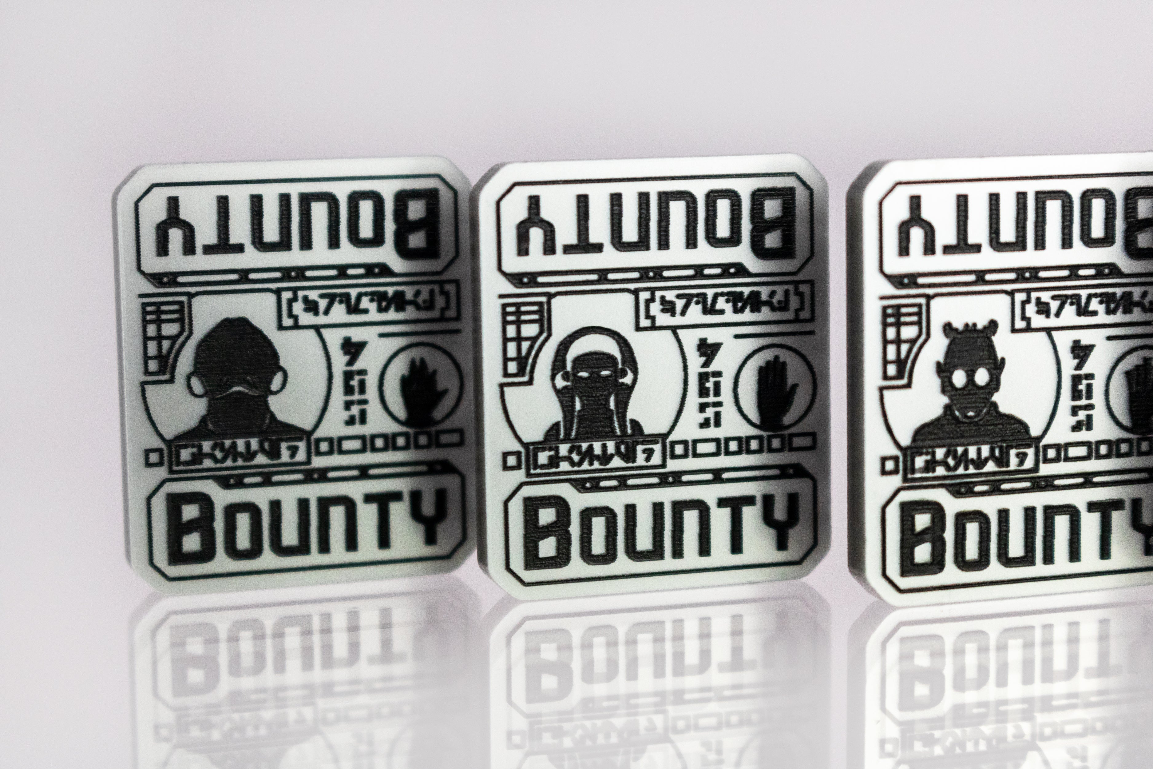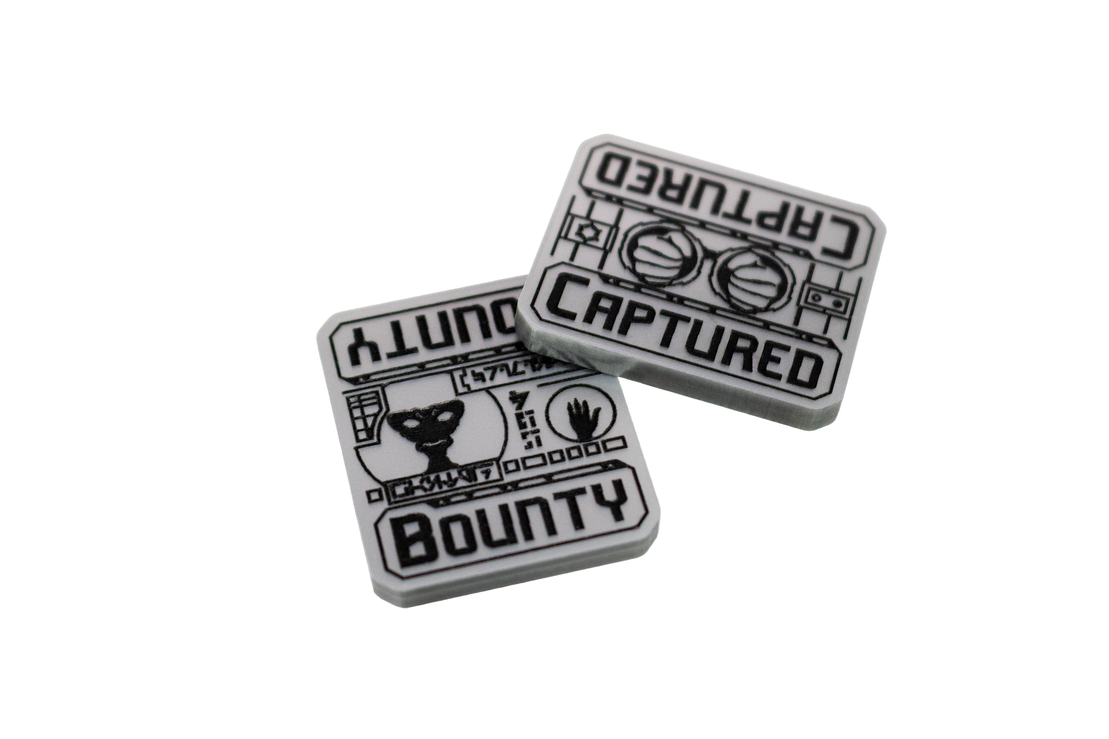 - 1 x Bounty/Captured Token, etched and cut from silver 3mm acrylic and painted black on both sides. Measuring 30mm x 25mm