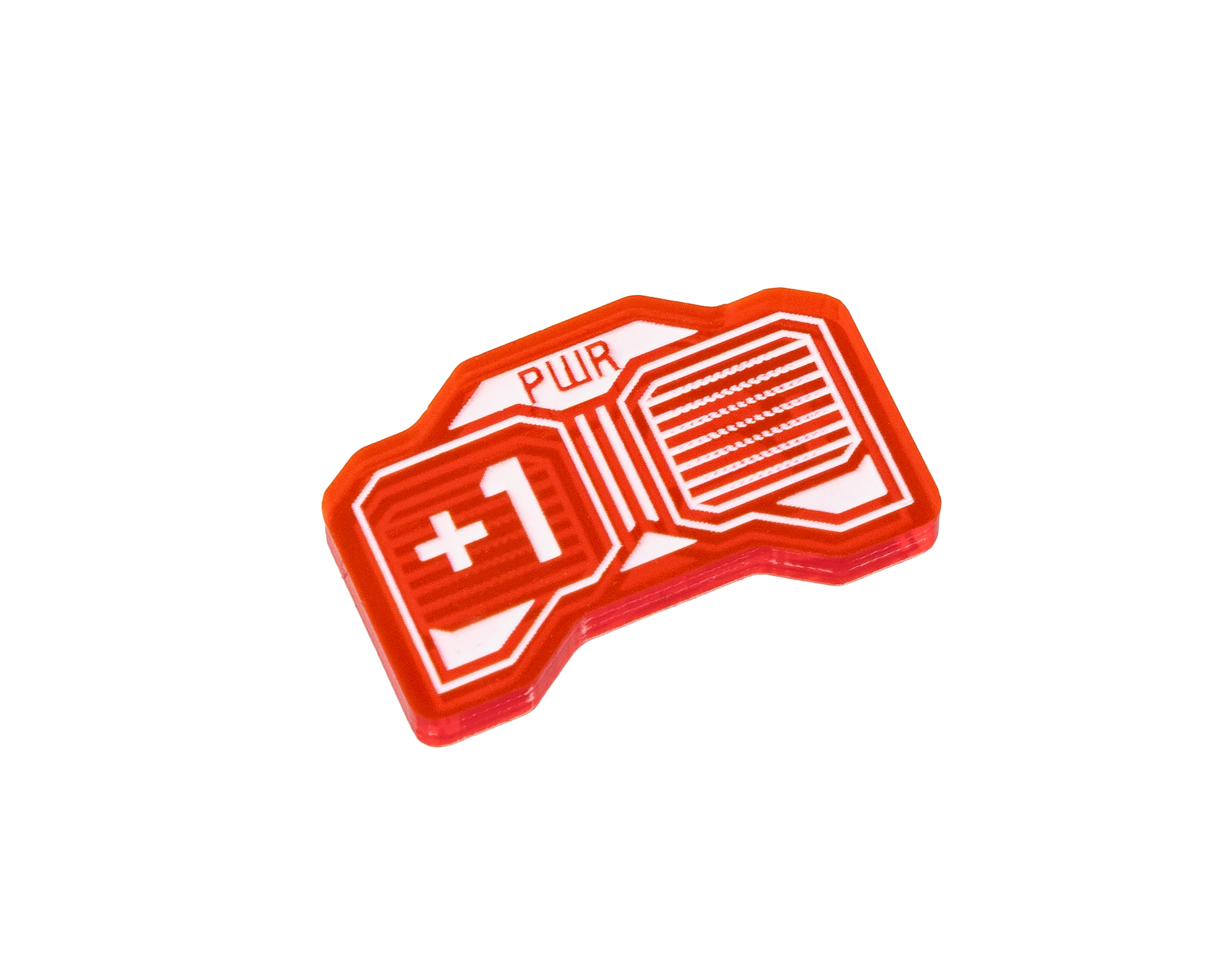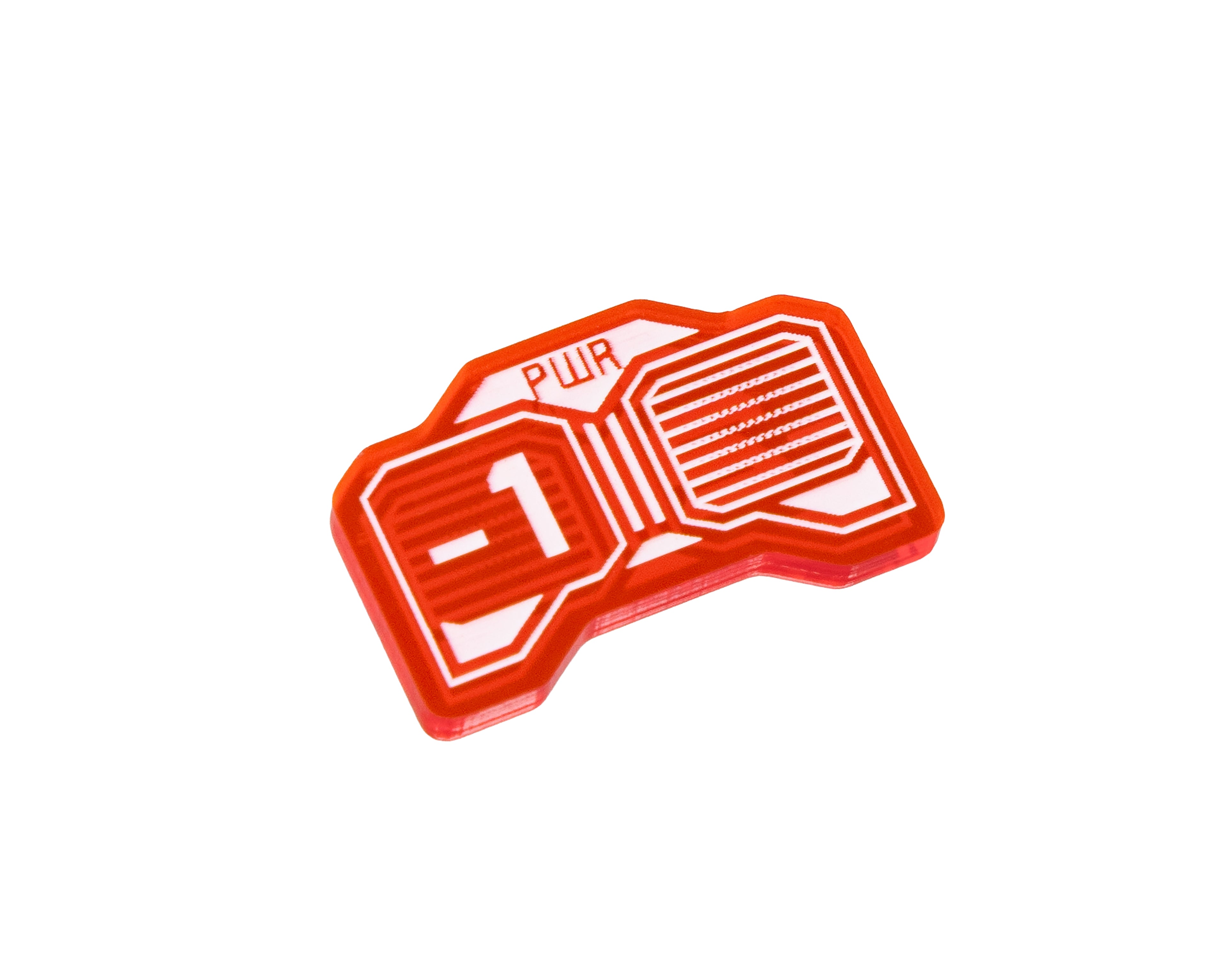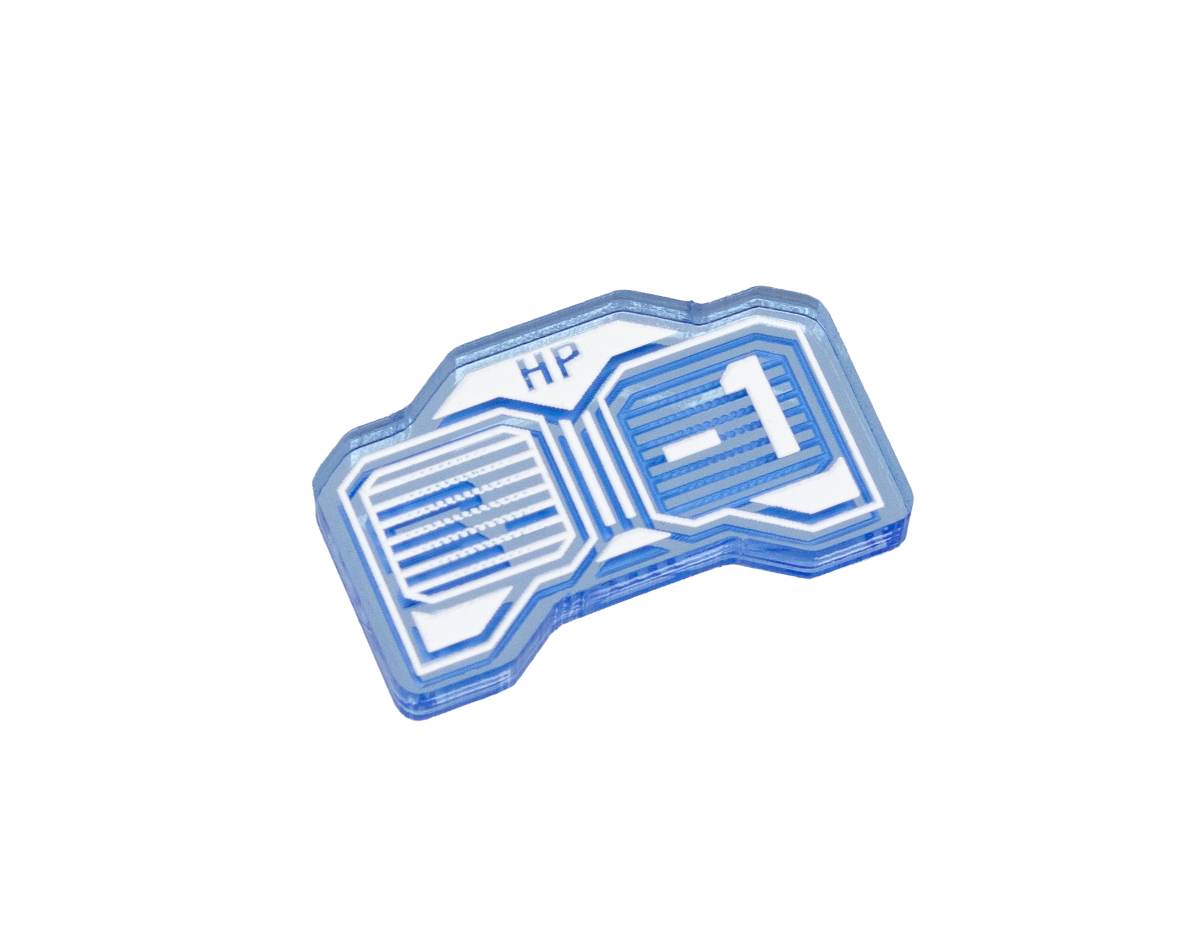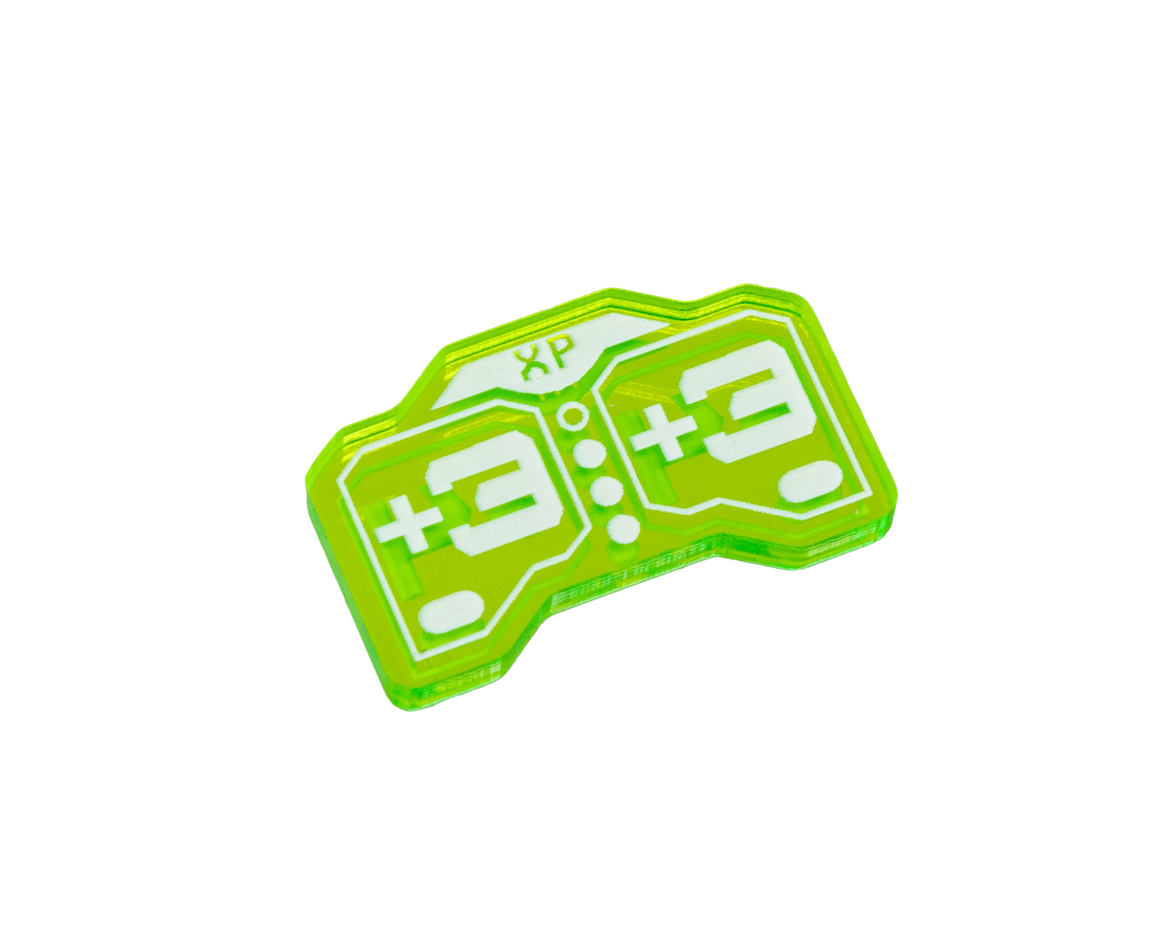 - Each Stat modifier and XP token is etched and painted on both sides with alternative denominations on the reverse. Cut from 3mm acrylic and measuring 14mm x 23mm.