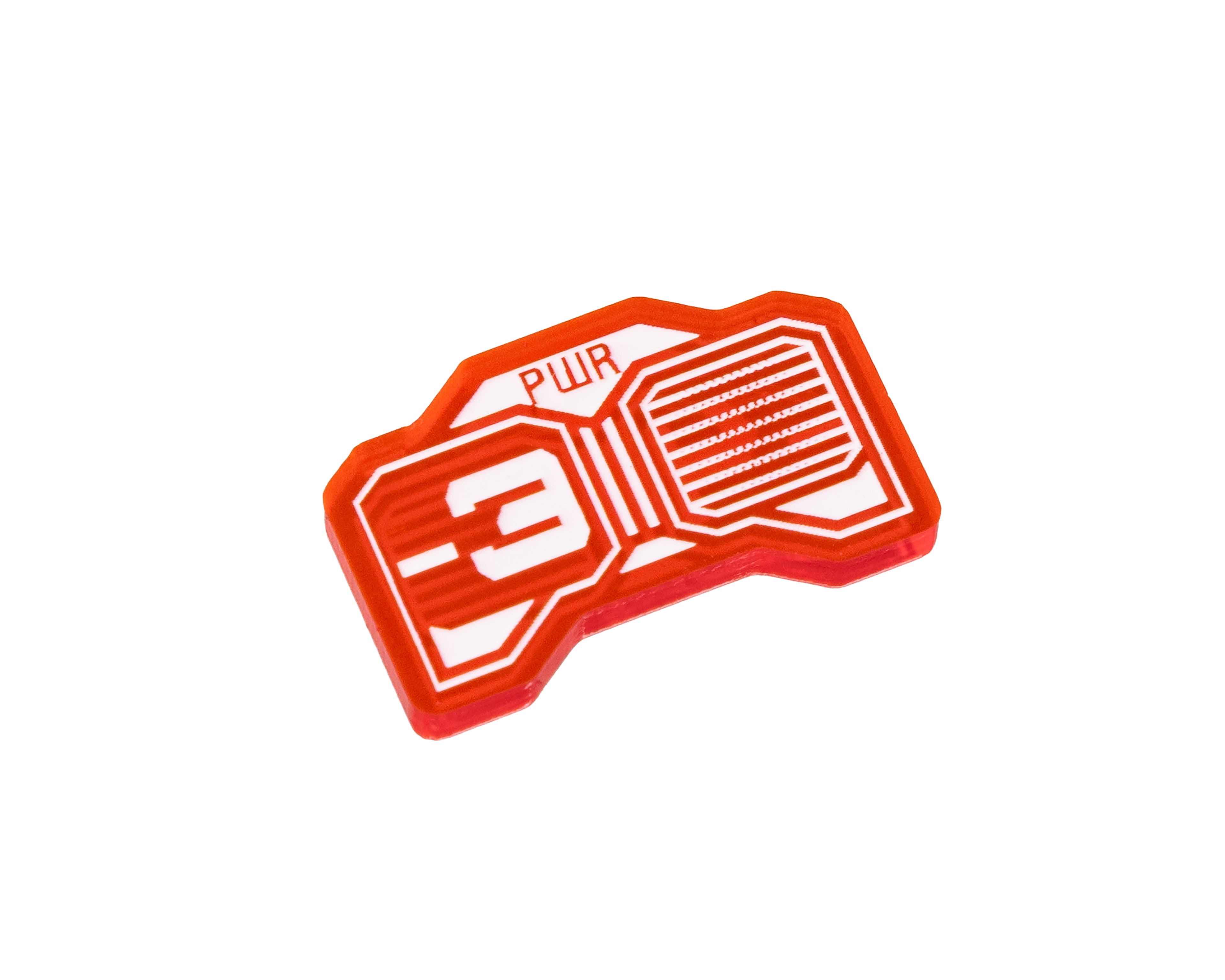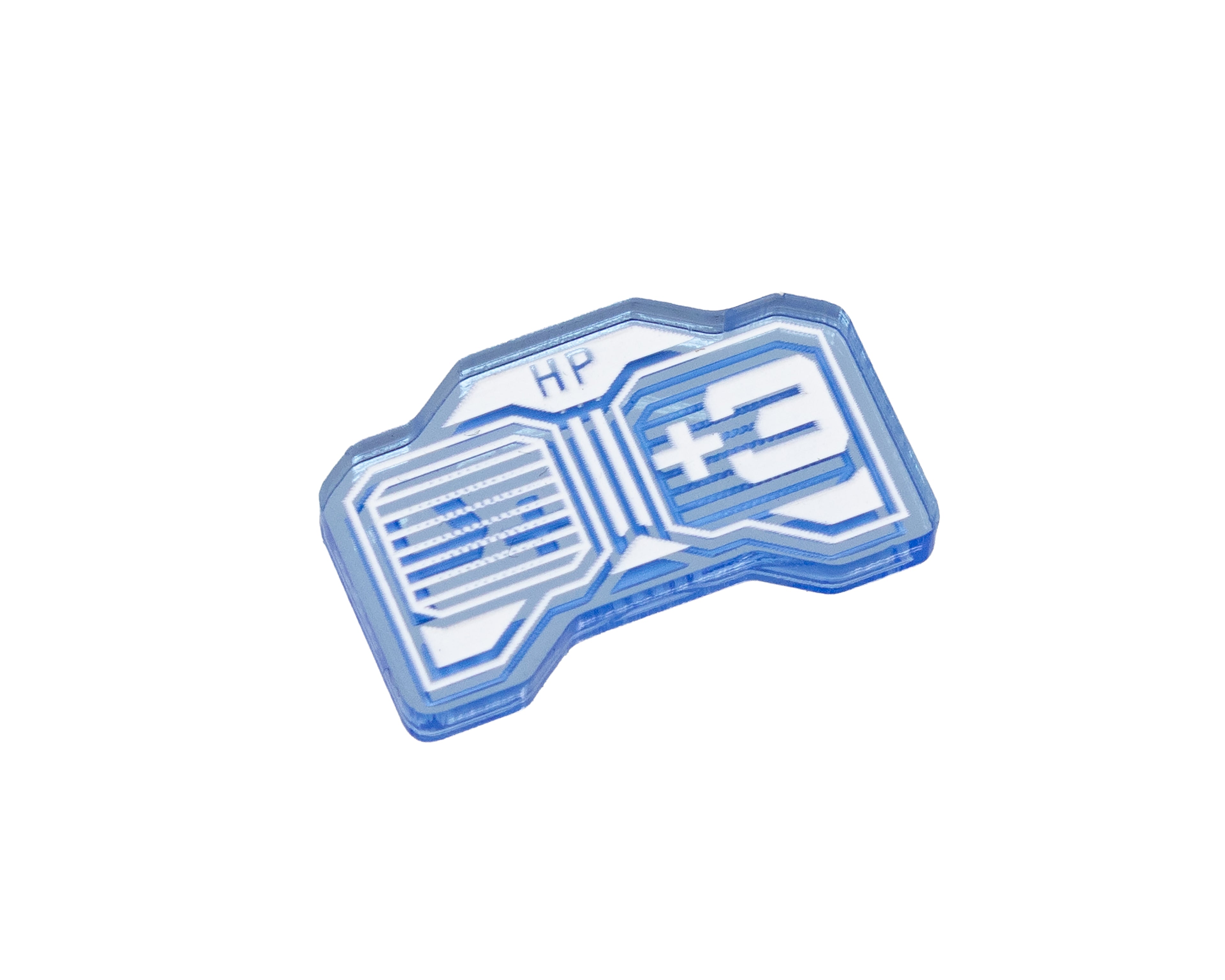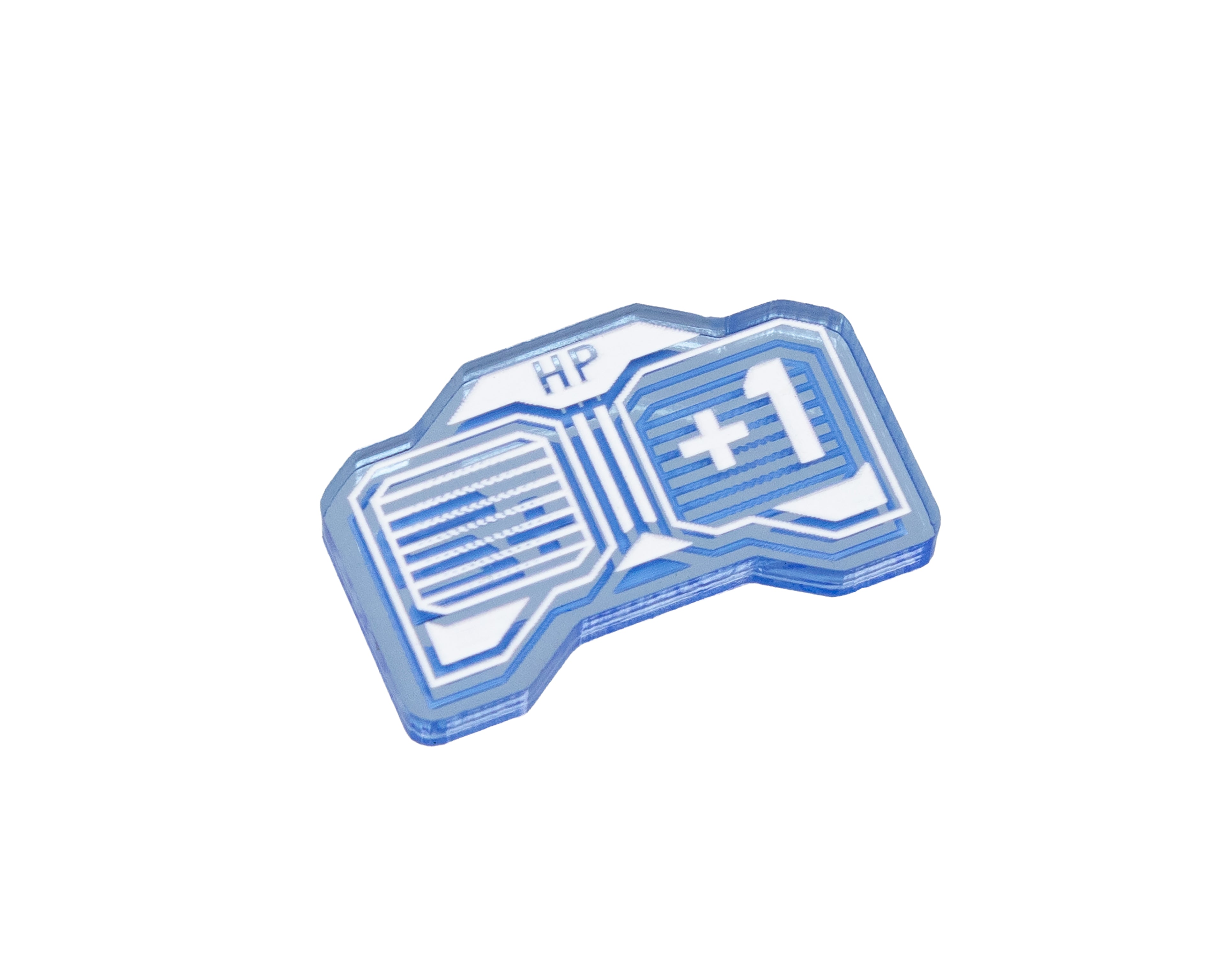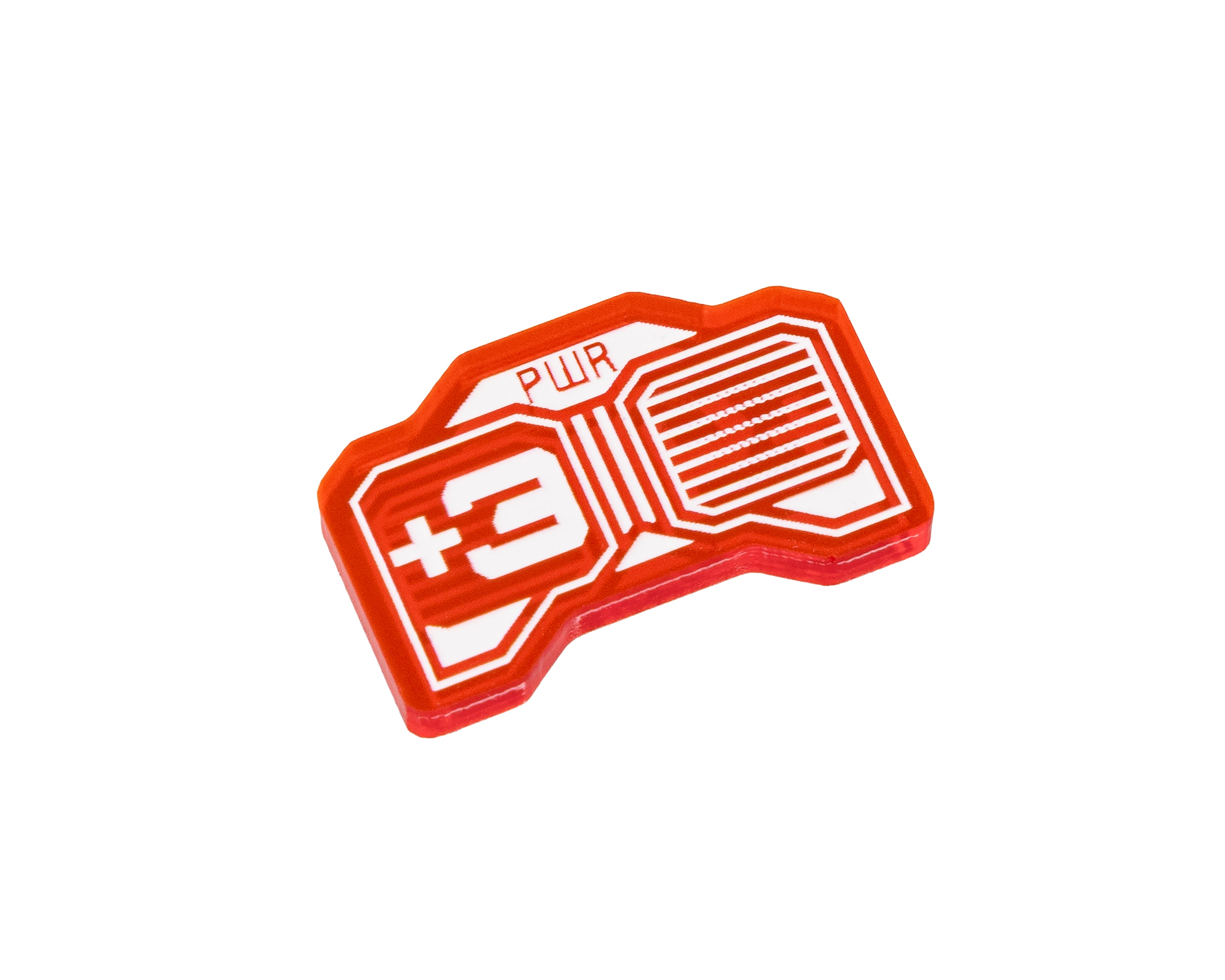 - Each Stat modifier and XP token is etched and painted on both sides with alternative denominations on the reverse. Cut from 3mm acrylic and measuring 14mm x 23mm.
